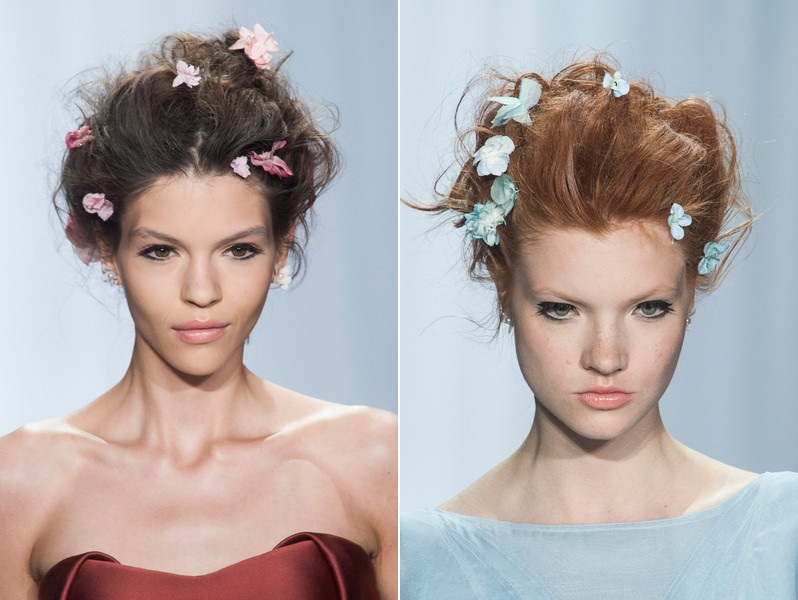 Zac Posen用與身上所穿服裝同色系的髮飾,不規則地散落別進自然盤起的頭髮裡,搭配深淺不同的粉嫩色彩,展現女性化十足的浪漫演繹。