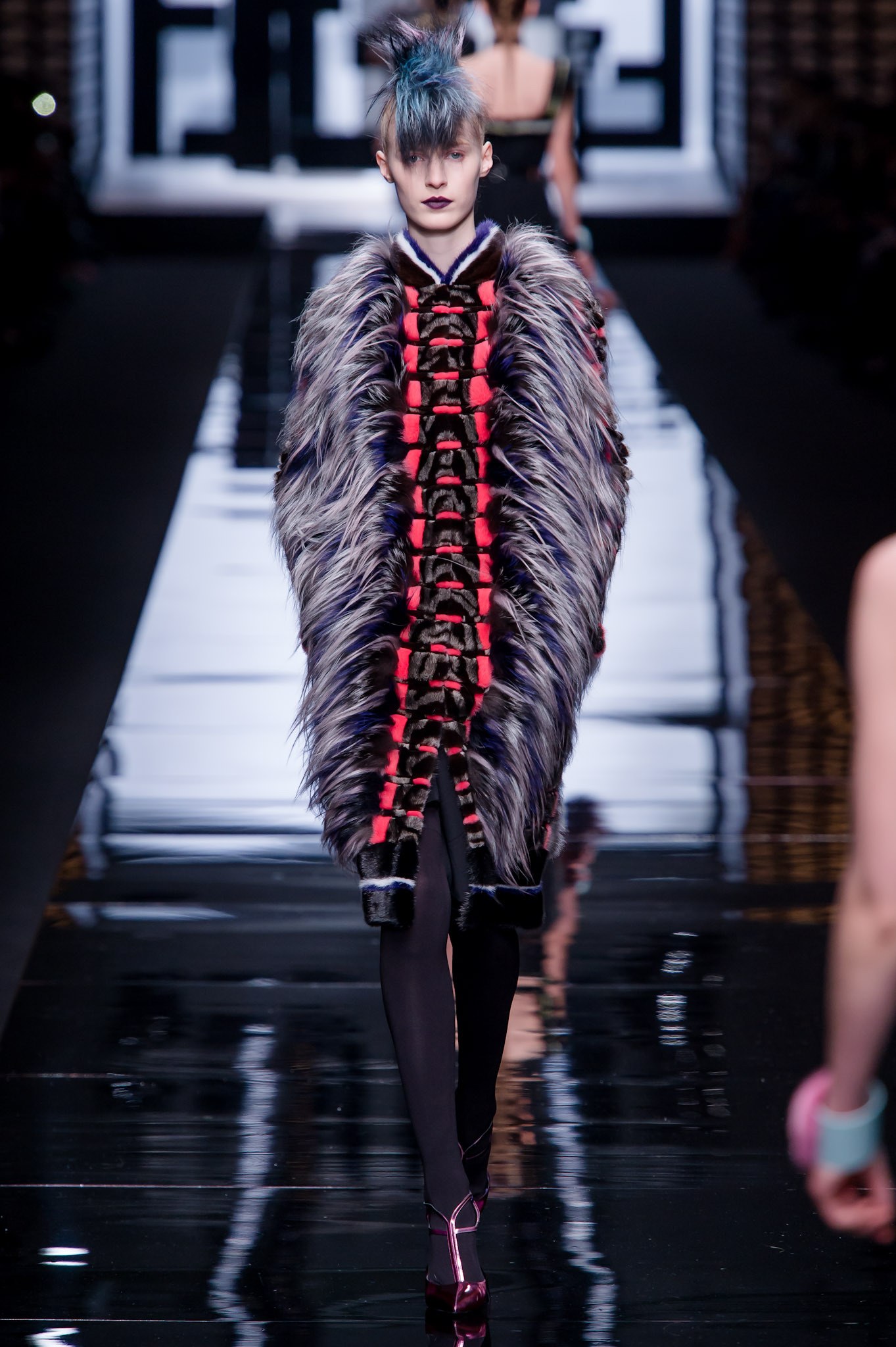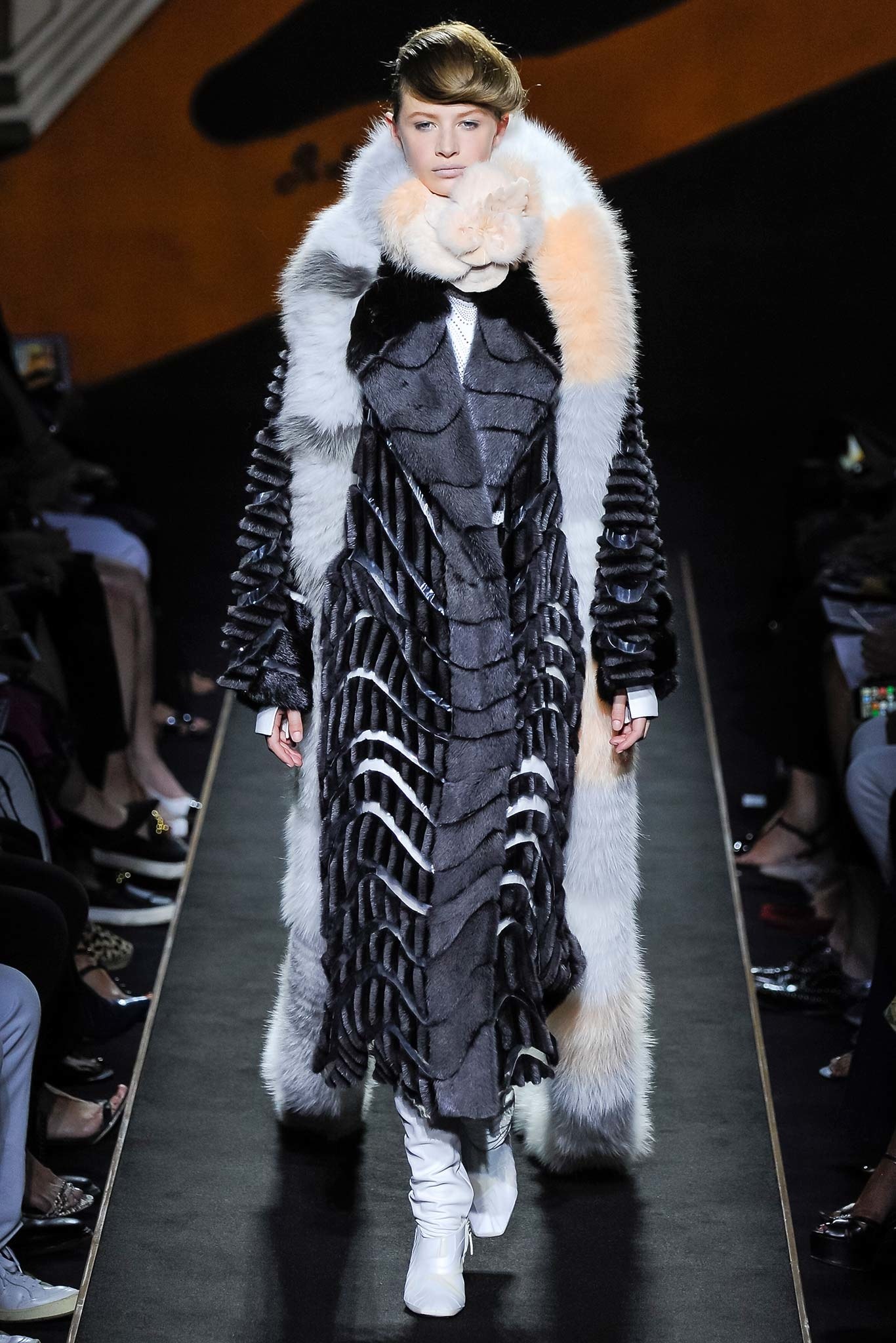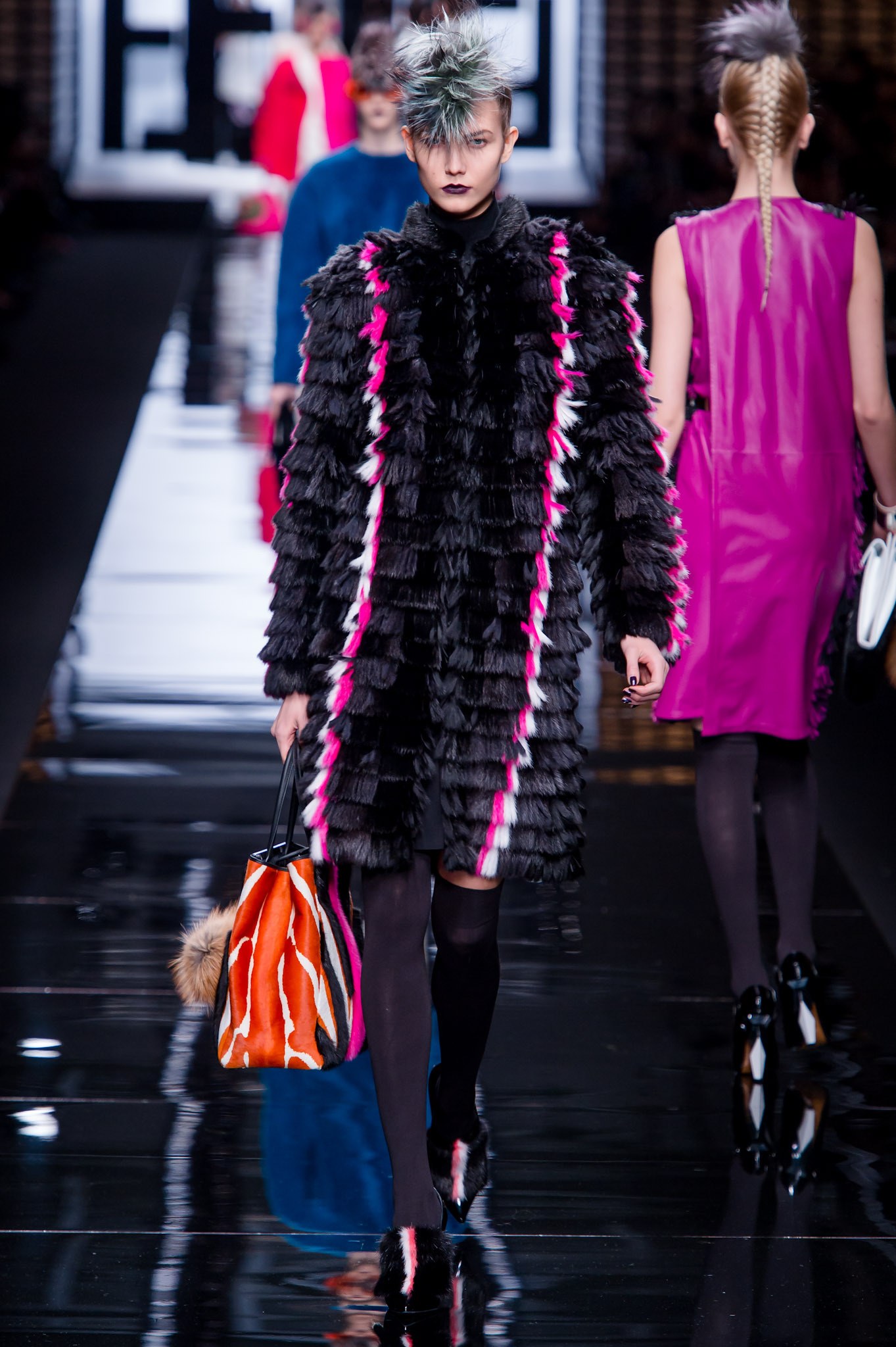 為了歡慶Karl與Fendi合作50週年,Fendi推出首季「高級訂製皮草系列」,於巴黎香榭麗舍劇院(Théâtre des Champs-Élysées)中盛大舉行,造型浮誇的服飾於秀台上魚貫出場,以黑、白、粉橘等簡約色調襯托出貂毛、山貓、狐狸、波斯羔羊毛等布料風貌,一洗皮草予人「傳統」、「俗氣」、「沉悶」等負面印象,閃爍著華麗搖滾的叛逆態度,大衣上立體的流線型圖案完美展示了Fendi高超的皮草製作技術,搭配帥氣窄管褲更帶出Saint Laurent式的性感酷勁。