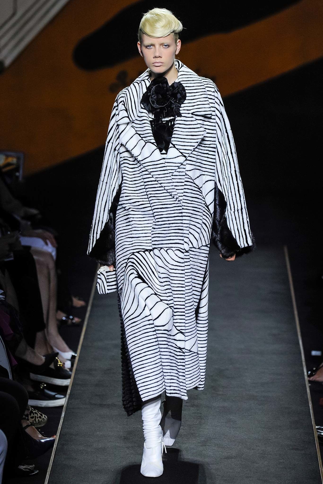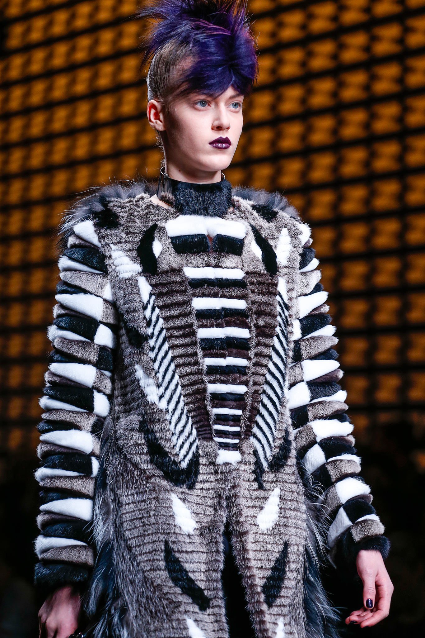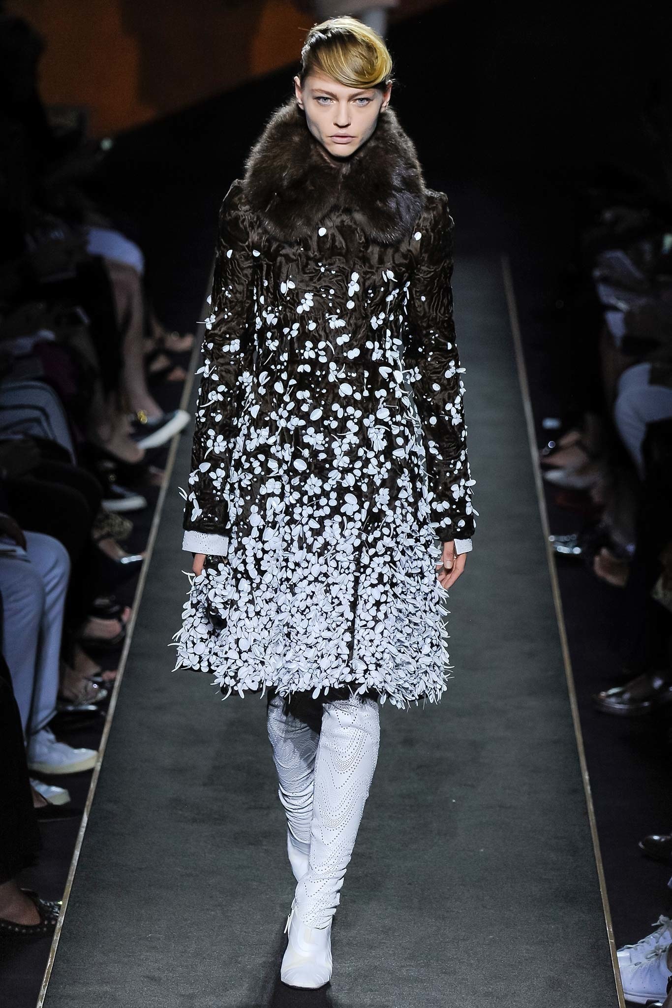 為了歡慶Karl與Fendi合作50週年,Fendi推出首季「高級訂製皮草系列」,於巴黎香榭麗舍劇院(Théâtre des Champs-Élysées)中盛大舉行,造型浮誇的服飾於秀台上魚貫出場,以黑、白、粉橘等簡約色調襯托出貂毛、山貓、狐狸、波斯羔羊毛等布料風貌,一洗皮草予人「傳統」、「俗氣」、「沉悶」等負面印象,閃爍著華麗搖滾的叛逆態度,大衣上立體的流線型圖案完美展示了Fendi高超的皮草製作技術,搭配帥氣窄管褲更帶出Saint Laurent式的性感酷勁。