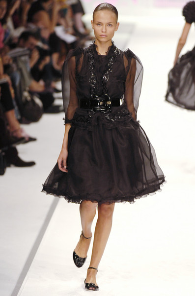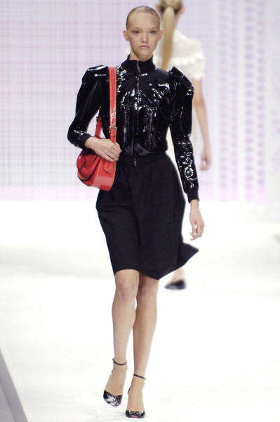雖說塑料趨勢大約在2010年才漸成氣候,Karl卻已洞察先機,於2007春夏成衣系列中大玩高科技主題,使用黑色矽膠與銀色皮革等布料製作服裝,並透過雷射切割技術打造趣味十足的幾何圖騰,以塑膠材質模擬皮草效果的裙裝也頗具巧思,完美演繹Karl對未來主義的獨到見解。