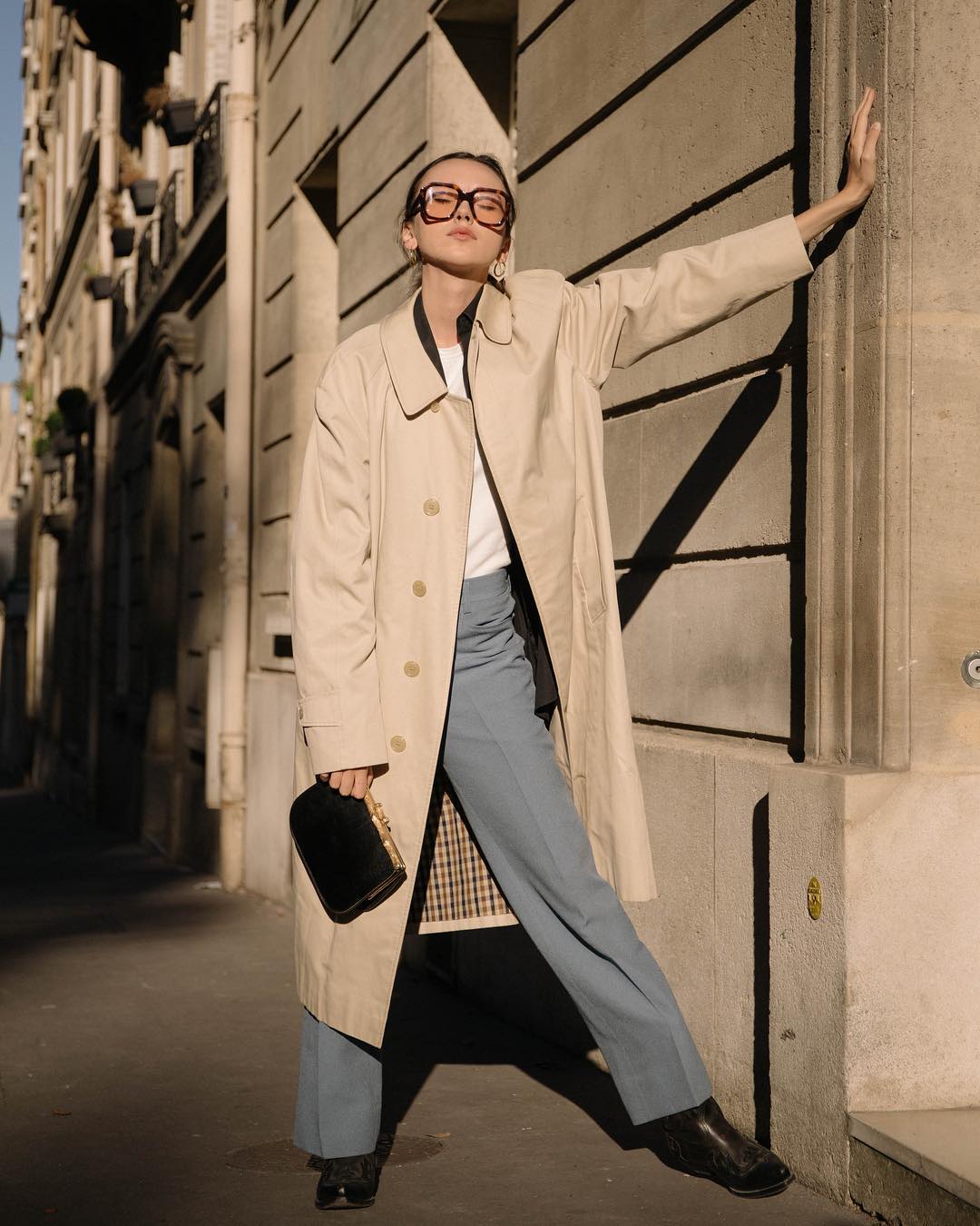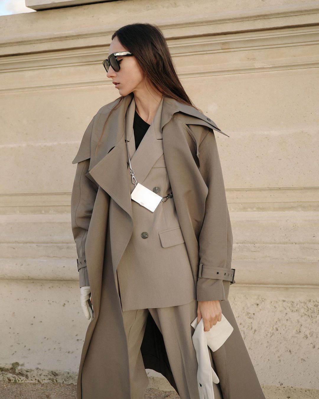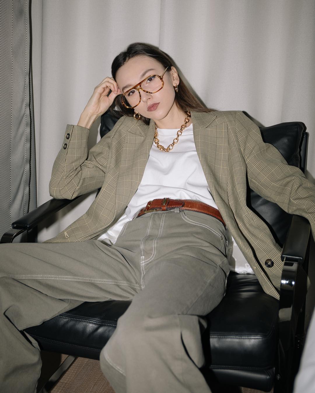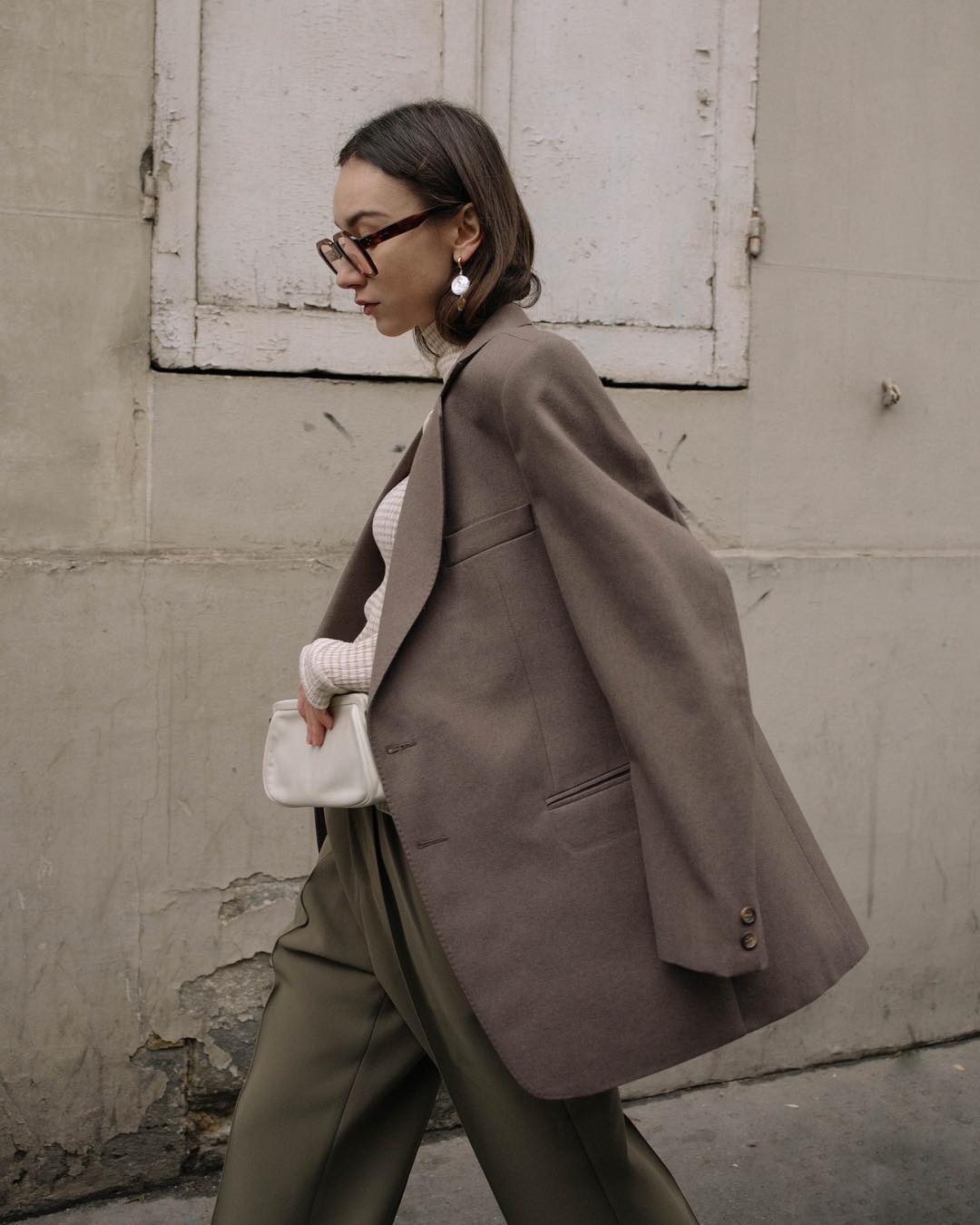 除了暖色,你也可以利用冷色調元素做變化,像是部落客 Beatrice Gutu (@beatrice.gutu)那樣,選擇偏藍、綠或灰調的大地色單品,或甚至在挑選好的基本大地色穿搭上,用帶有藍、綠、灰色調的單品替換其中一樣(可以是褲子、裙子或者配件等),但還是要記得維持低彩度的原則,否則色系反差過大可能會有不協調或突兀感產生。