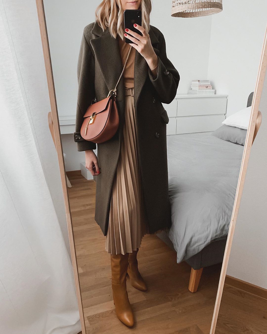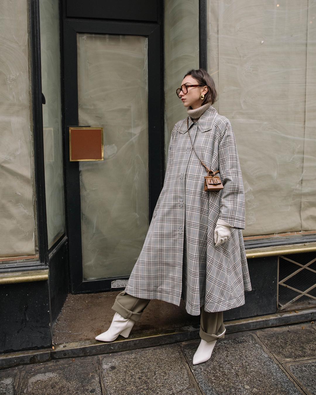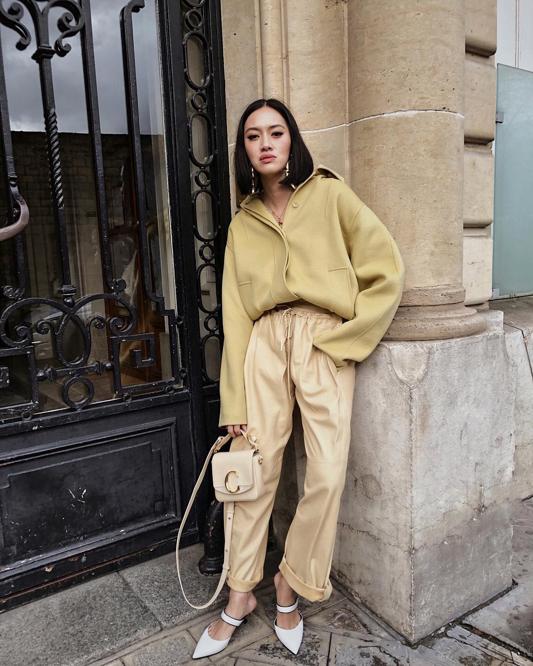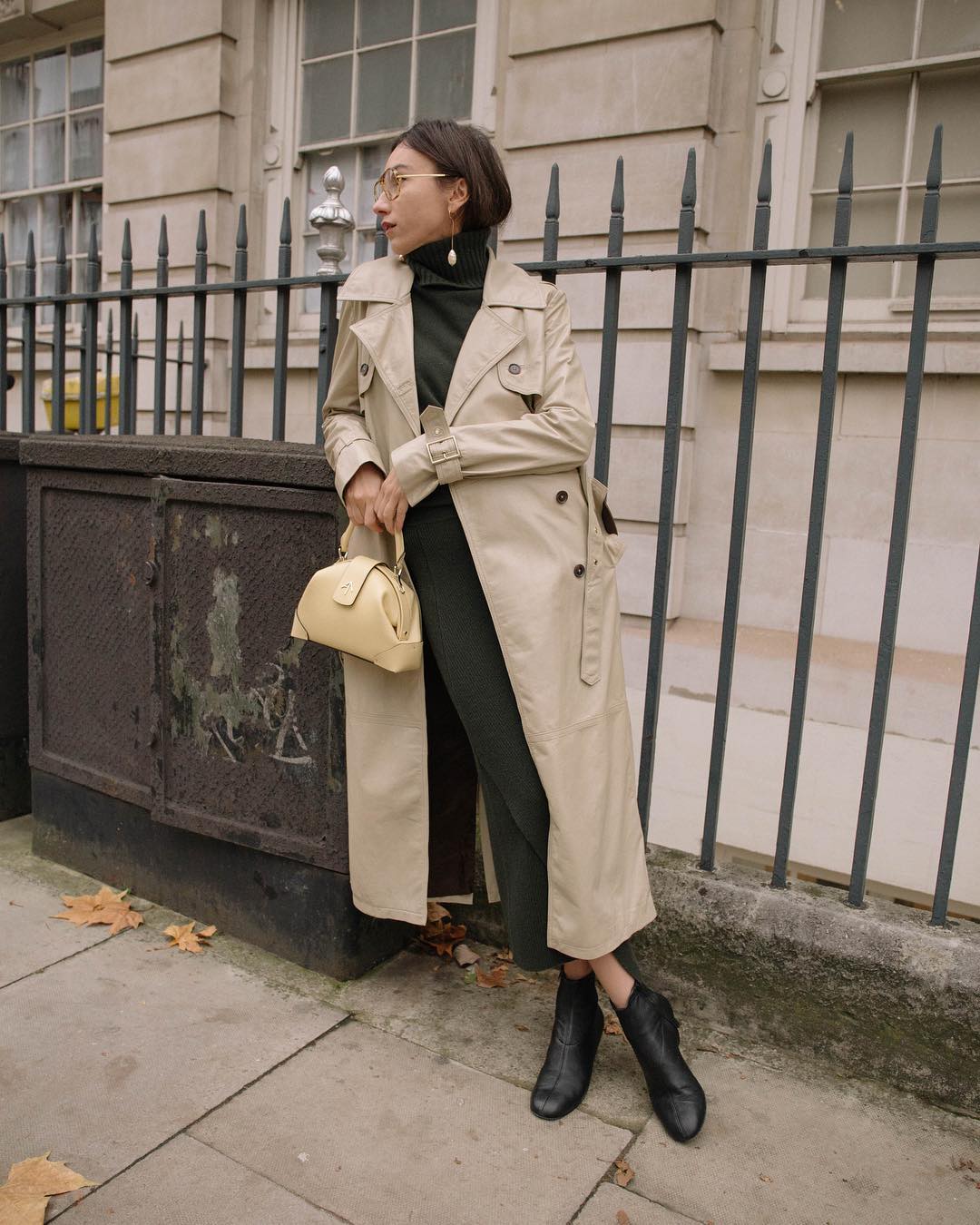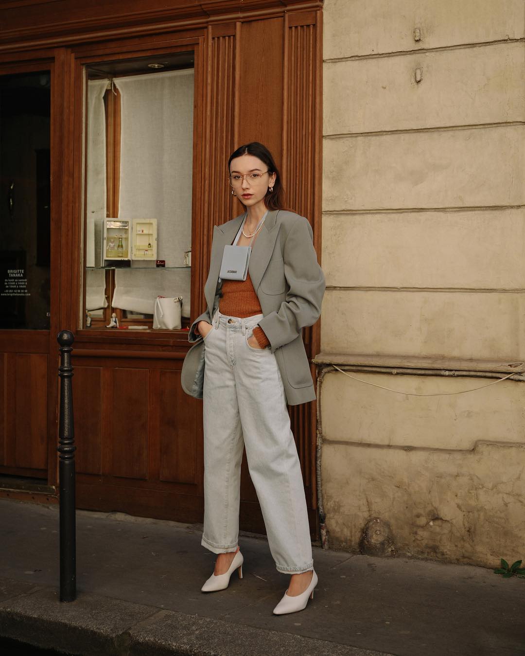 除了暖色,你也可以利用冷色調元素做變化,像是部落客 Beatrice Gutu (@beatrice.gutu)那樣,選擇偏藍、綠或灰調的大地色單品,或甚至在挑選好的基本大地色穿搭上,用帶有藍、綠、灰色調的單品替換其中一樣(可以是褲子、裙子或者配件等),但還是要記得維持低彩度的原則,否則色系反差過大可能會有不協調或突兀感產生。
