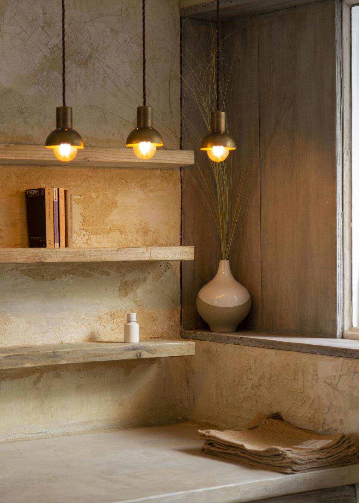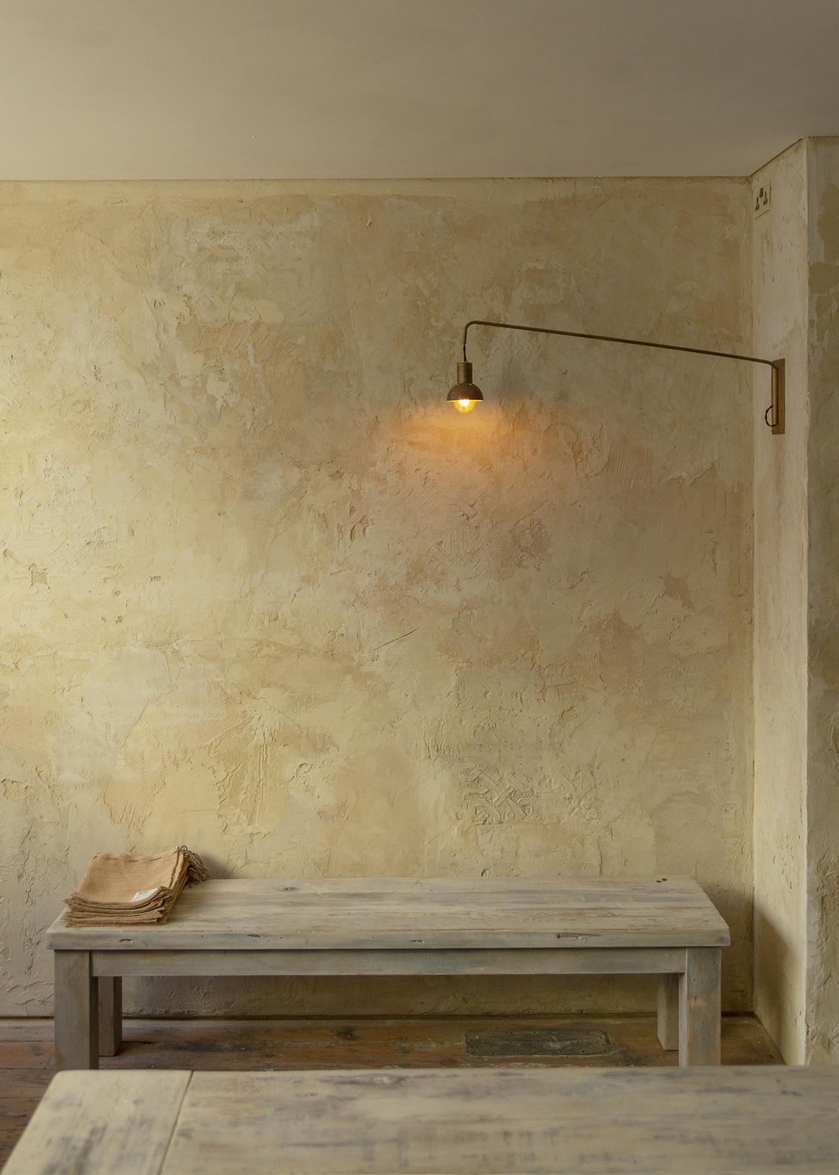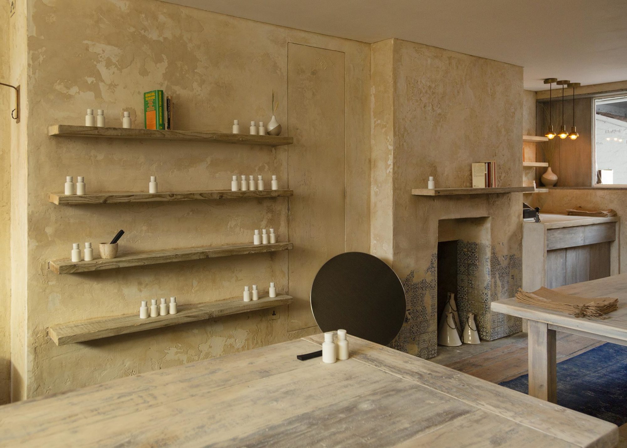 這個空間是當時 Brandon Truaxe 和 Stephanie Wong 與 Jason Santos 共同發想設計,為了成就Brandon Truaxe 的極簡精神,以未經處理牆面,結合上原木結構和藍色磁磚,打造出簡樸舒適的空間;夜晚時,品牌發展階段的影片會被投射於天花板上,就像是將整個空間都覆蓋上的 Brandon Truaxe 的美學視角。