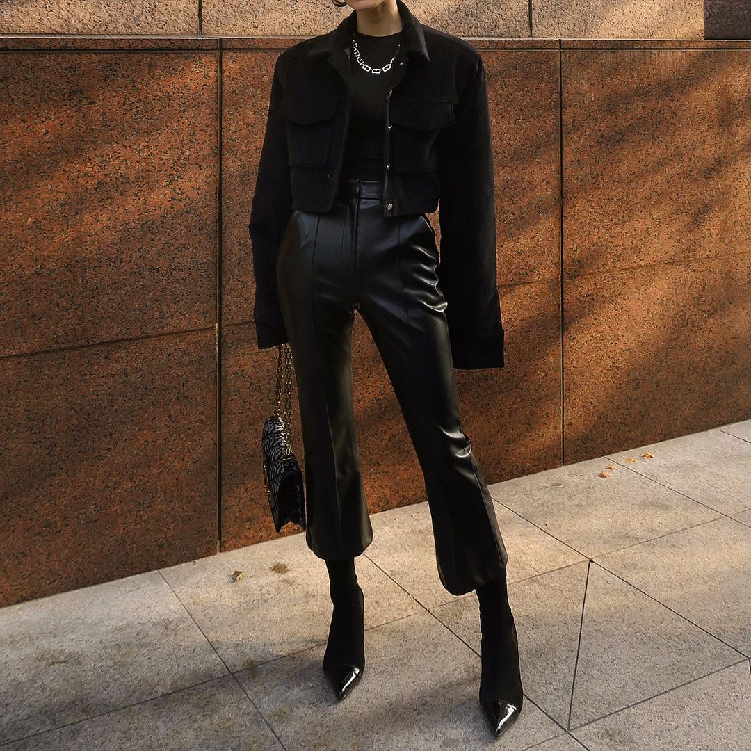 透過穿著款式小露肌膚,可以平衡全黑給人的距離感,像是將先前介紹過的「西裝+短褲」穿搭融入全黑打扮也是再適合不過,而除了短褲之外,短版上衣也相當必備的單品,能將高冷暗黑的氣息轉化為俏皮的休閒風格,。