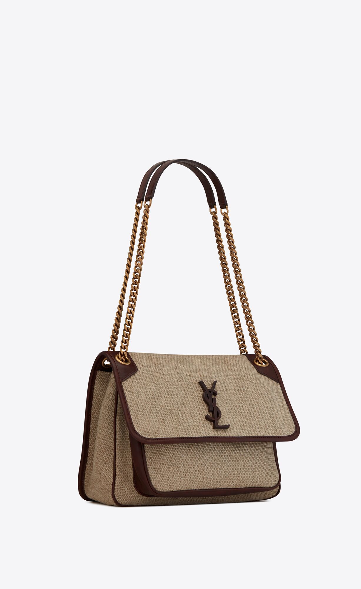 NIKI 亞麻帆布與深咖啡色 小牛皮滾邊肩背包 NT$67,550/HK$ 16,900