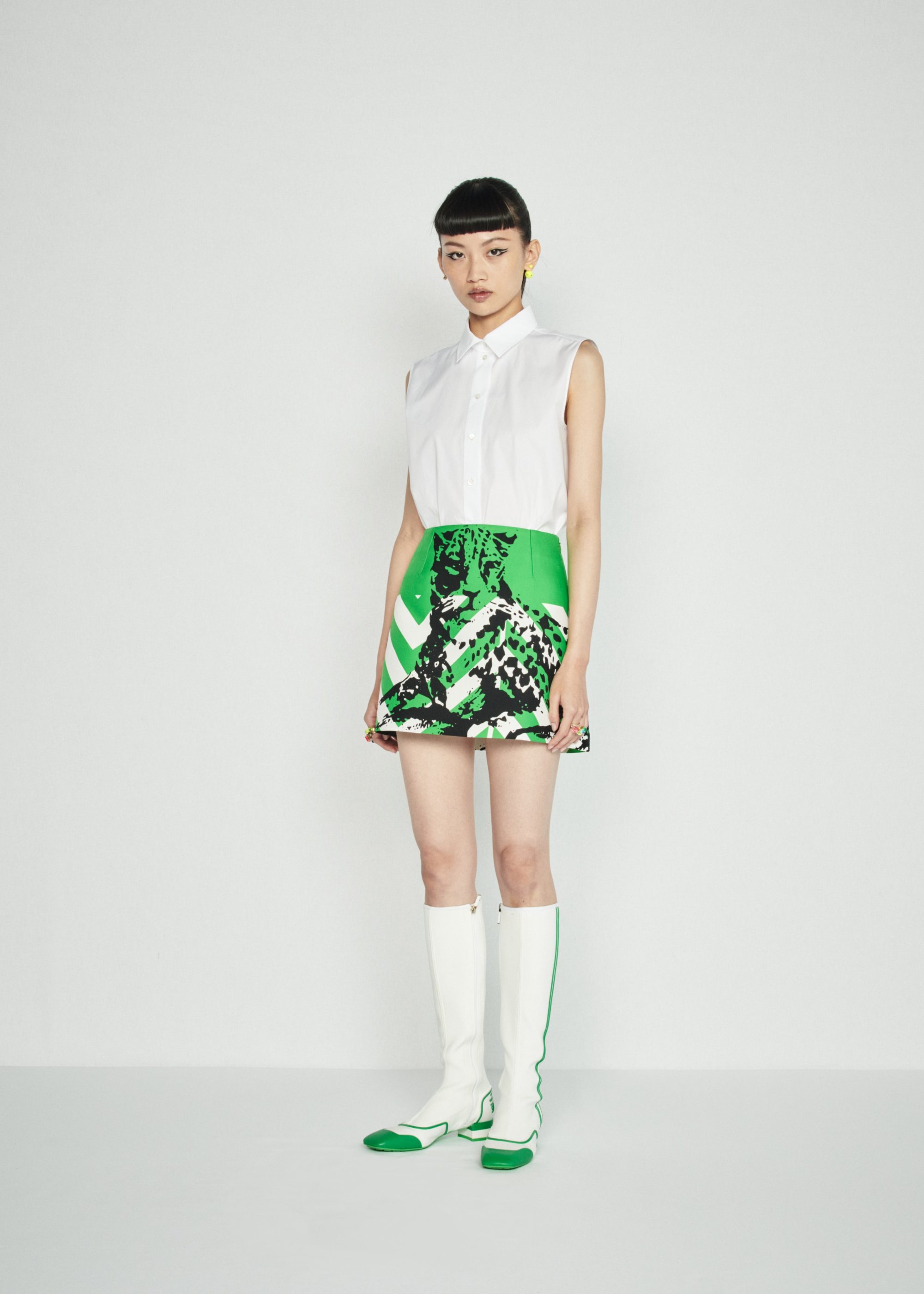 而在好奇心、探索心和對時裝強烈的欲望驅使下,Chiuri 嘗試了一些新形式來傳達這些想法。今回,Chiuri 與現年85歲的義大利藝術家 Anna Paparatti 攜手合作,邀請她為秀場打造以60年代棋盤遊戲為啟發的波普藝術布景及背景,而這些紛繁色塊即象徵藝術家遊戲創作中的幾何要素。