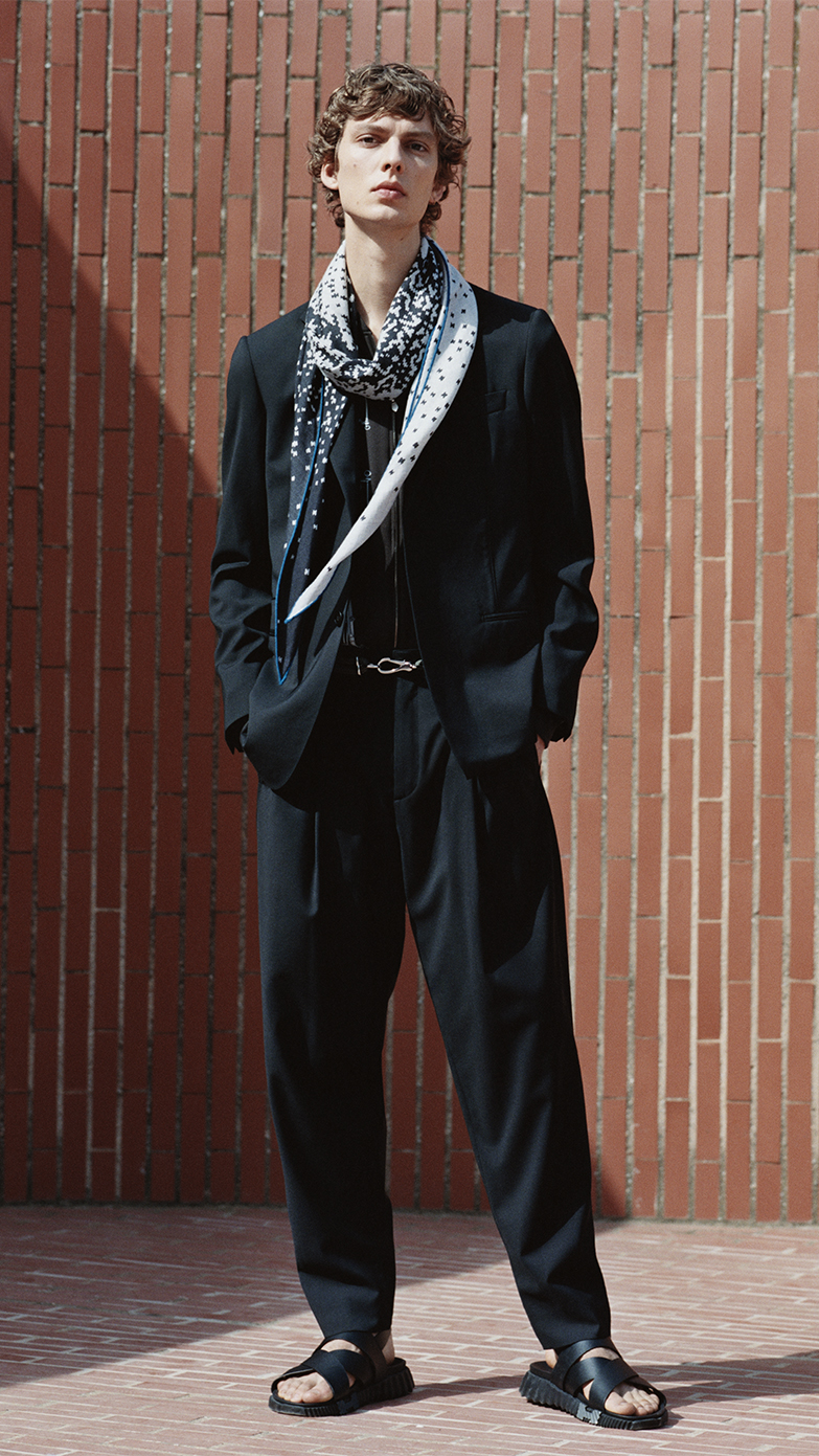 男士款式也相當豐富而吸睛,包含抽象圖案的線條設計、富含生機線條感的款式、僅在邊緣處抹上亮眼色彩的簡約款、帶有品牌馬術精神的動物圖案、以及深淺丹寧和低飽和度色彩等設計,為現代男性打造多樣魅力的絲巾款式,襯托其翩翩風采。
