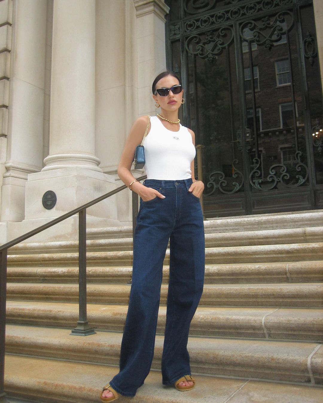 瞧瞧,一件背心搭配簡單的牛仔褲和拖鞋,休閒又不失時髦感,簡簡單單就完成了今日穿搭,誰能不愛呢?