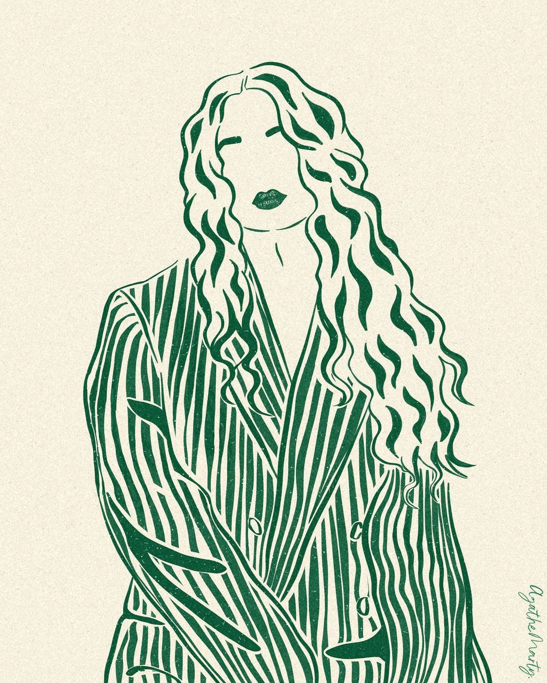 即便 Agathe Marty 幾乎不為她筆下的人物畫畫上眼睛,但在其他人體五官的形塑上,Agathe Marty 卻相當地細膩,包含俐落的眉型、豐厚性感的雙唇……,因而觀者依舊能從她的畫作中,看出角色的情緒與個人特色。