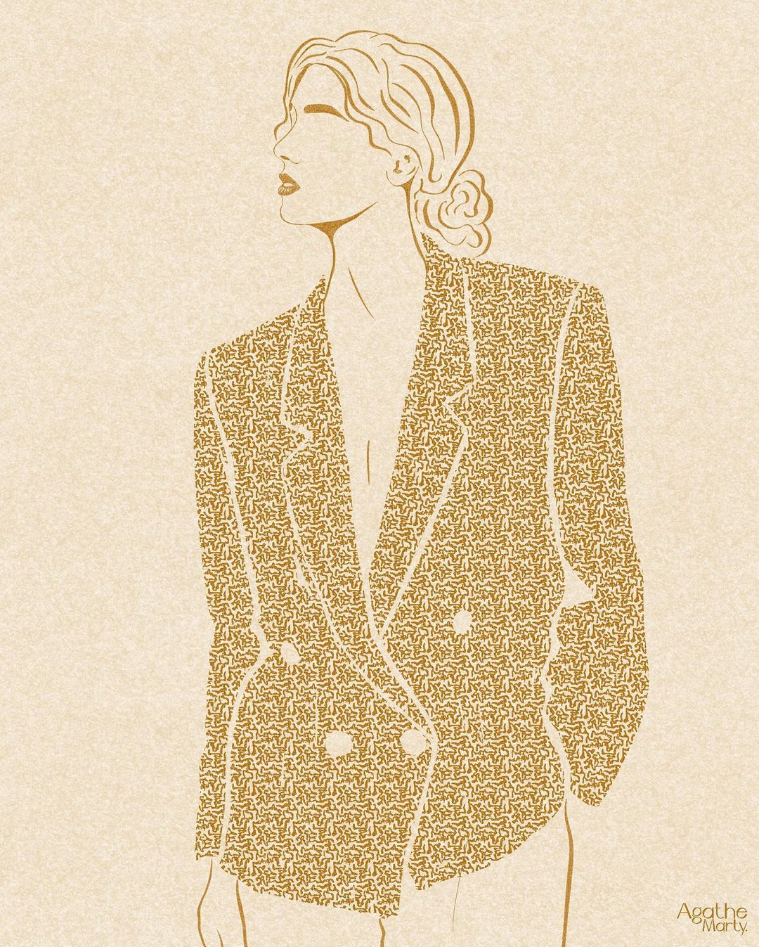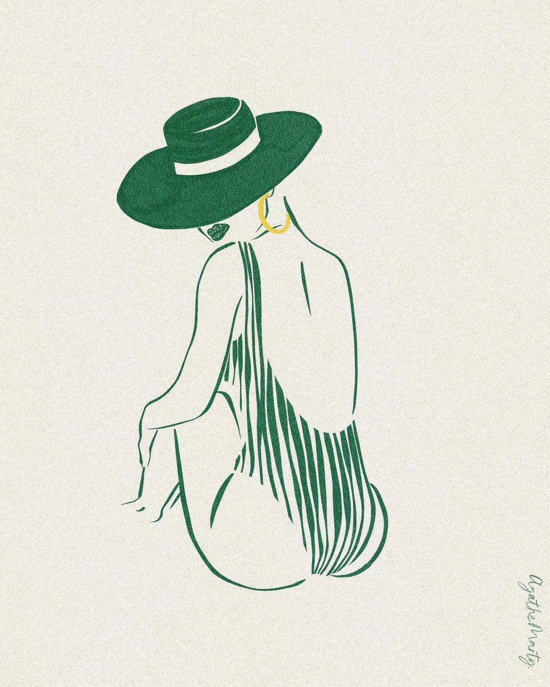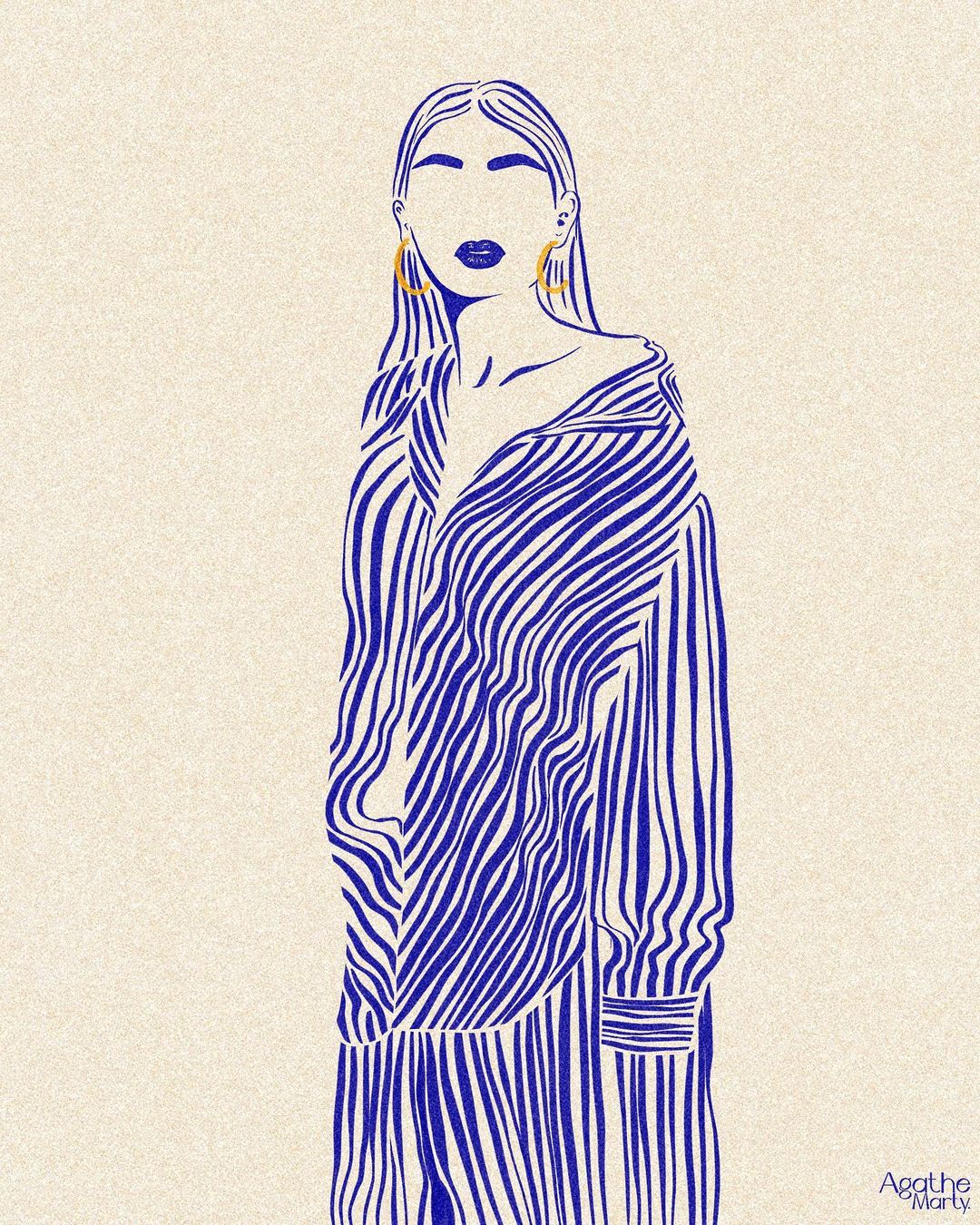 Agathe Marty 通常以單色進行創作,形塑出一位位風情萬種的女子,而葉綠色、芥末黃與海軍藍更是她的招牌用色,同時她還會特別注重於角色耳環的設計,為其注入閃耀的金黃色澤。