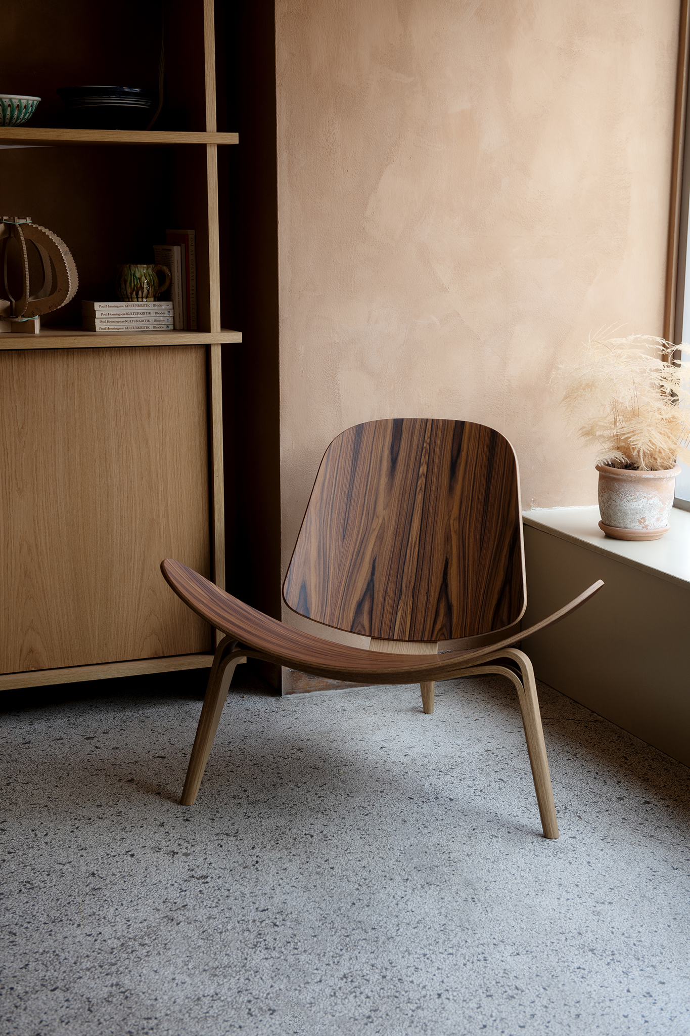 「CH07.Shell Chair 是展現 Hans J. Wegner 卓越美學的證明,以帶著深沈溫暖色澤的玫瑰木,作為椅背與椅面骨架,並與橡木椅腳相融合,作為六十週年的限定收藏版本,也完美代表丹麥 1950 年至 1960 年的異國風情與樸實風格。」