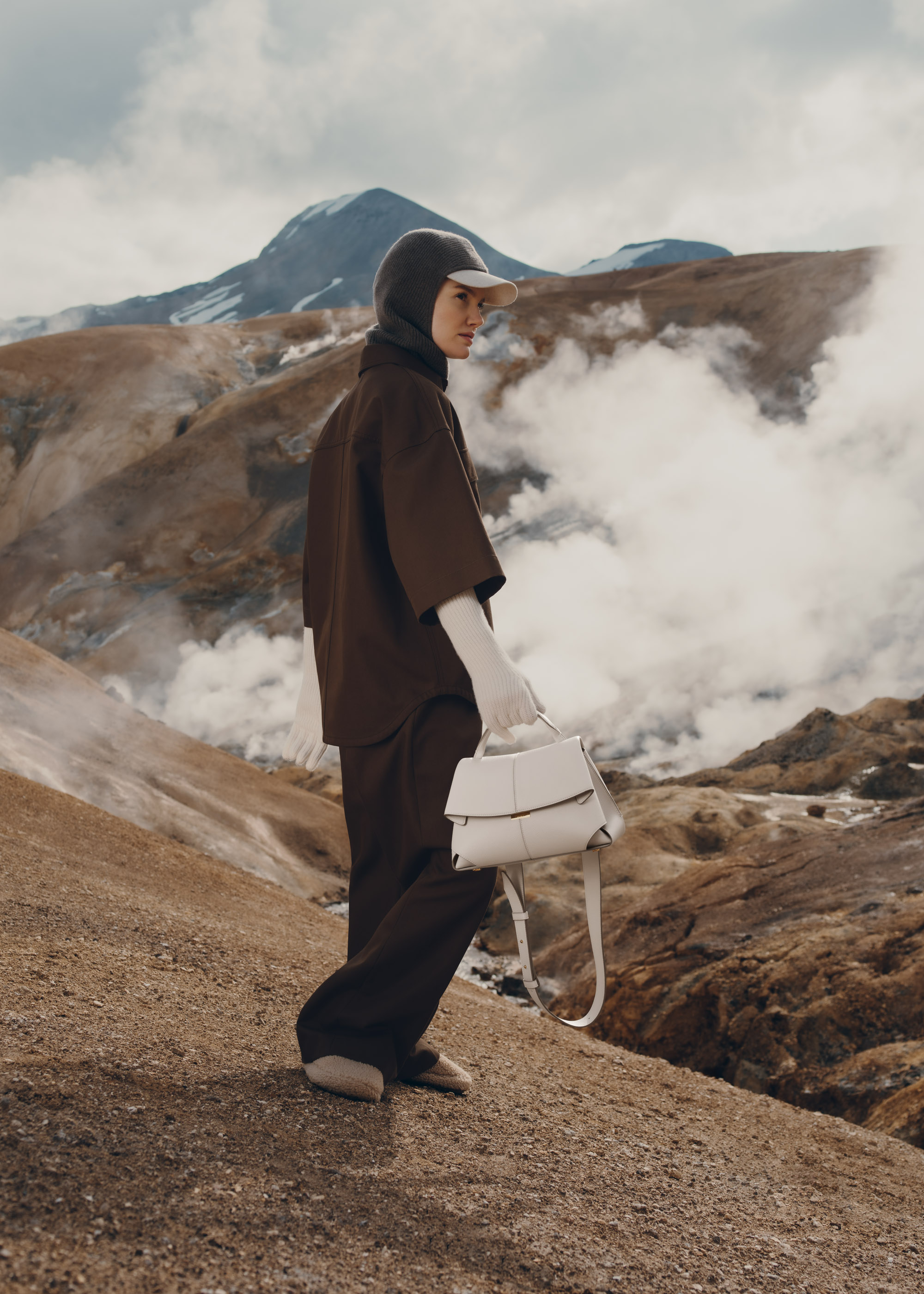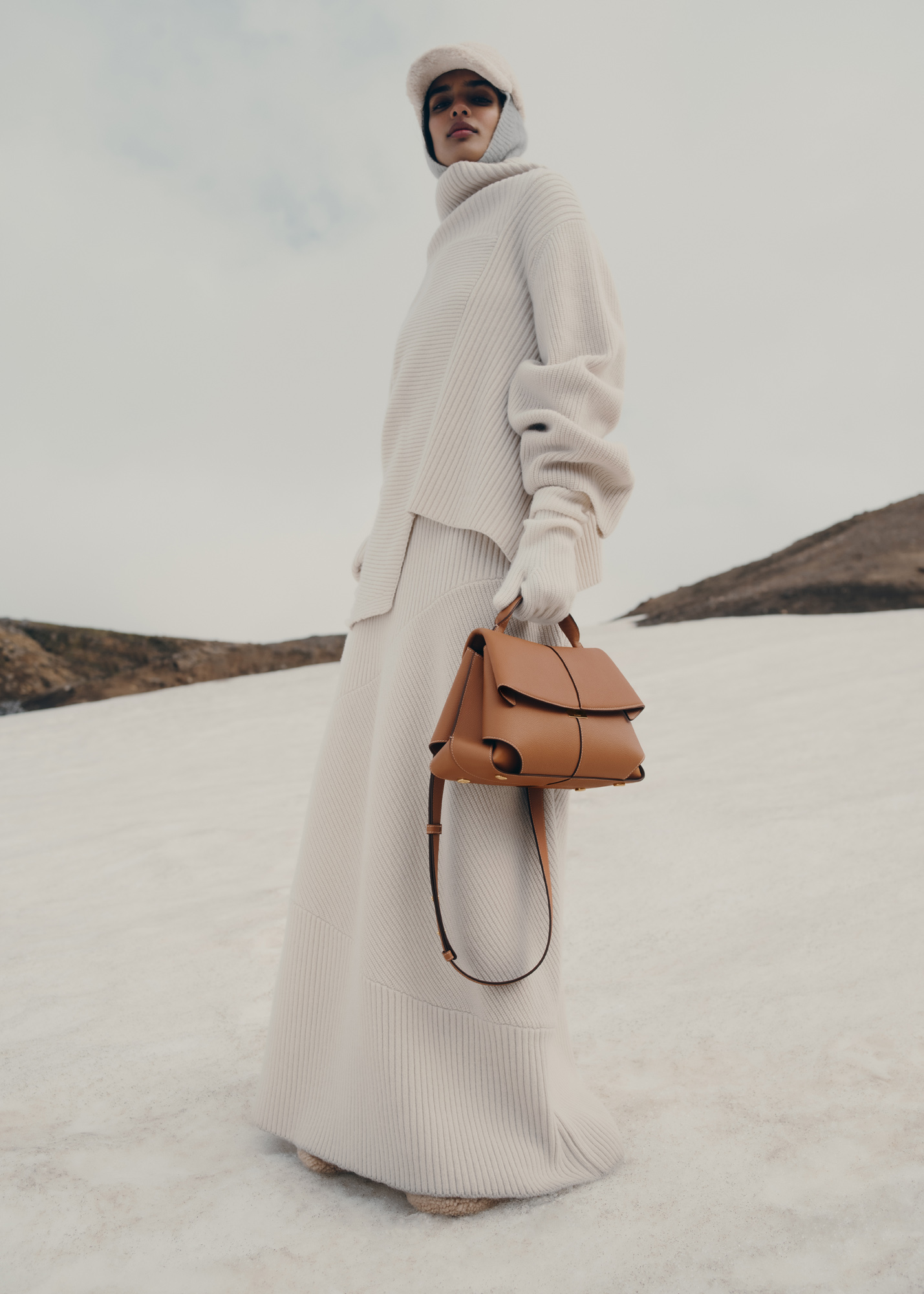 Mokki 的包款名稱來自芬蘭與的「小木屋」,梯形翻蓋的設計讓人想起小屋的構造。以皮革揉入褶皺工藝的 Mokki 由西班牙皮具名鎮 Ubrique 工匠製作,露出一角光滑牛皮,讓你將家的舒適感以及精湛藝術隨身攜帶。