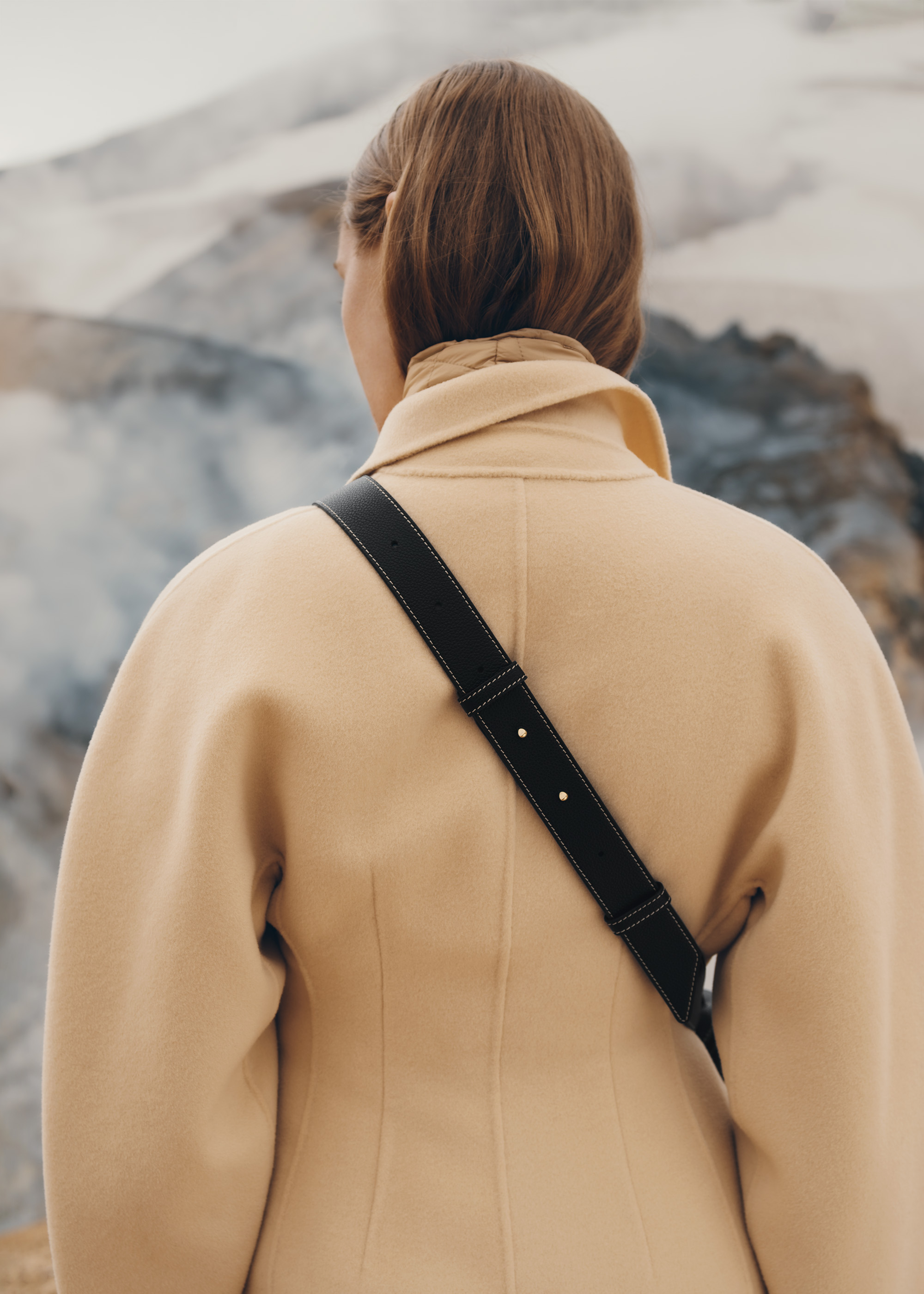 除了結構感特殊的外觀,細看每個角落都能發現細膩巧思。外層用荔枝牛皮覆蓋了大部分包體,加以保護,內部隔層則使用棉質襯裡,容量寬敞;明縫線和邊緣染色,點亮線條之美;翻蓋的金色鎖扣則刻有 Polène 標誌,與包款底部的鵝卵石形拋光飾釘相映成趣。