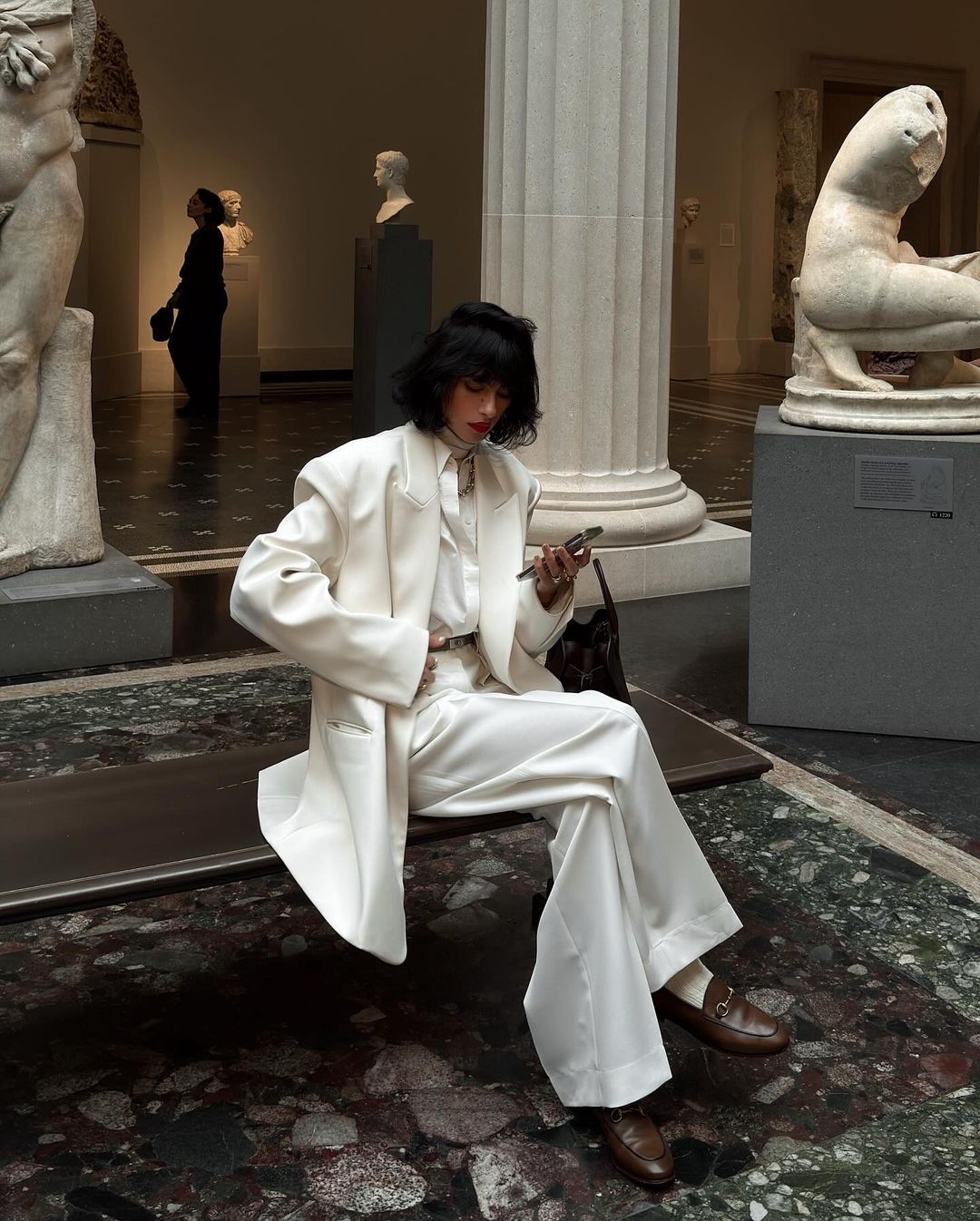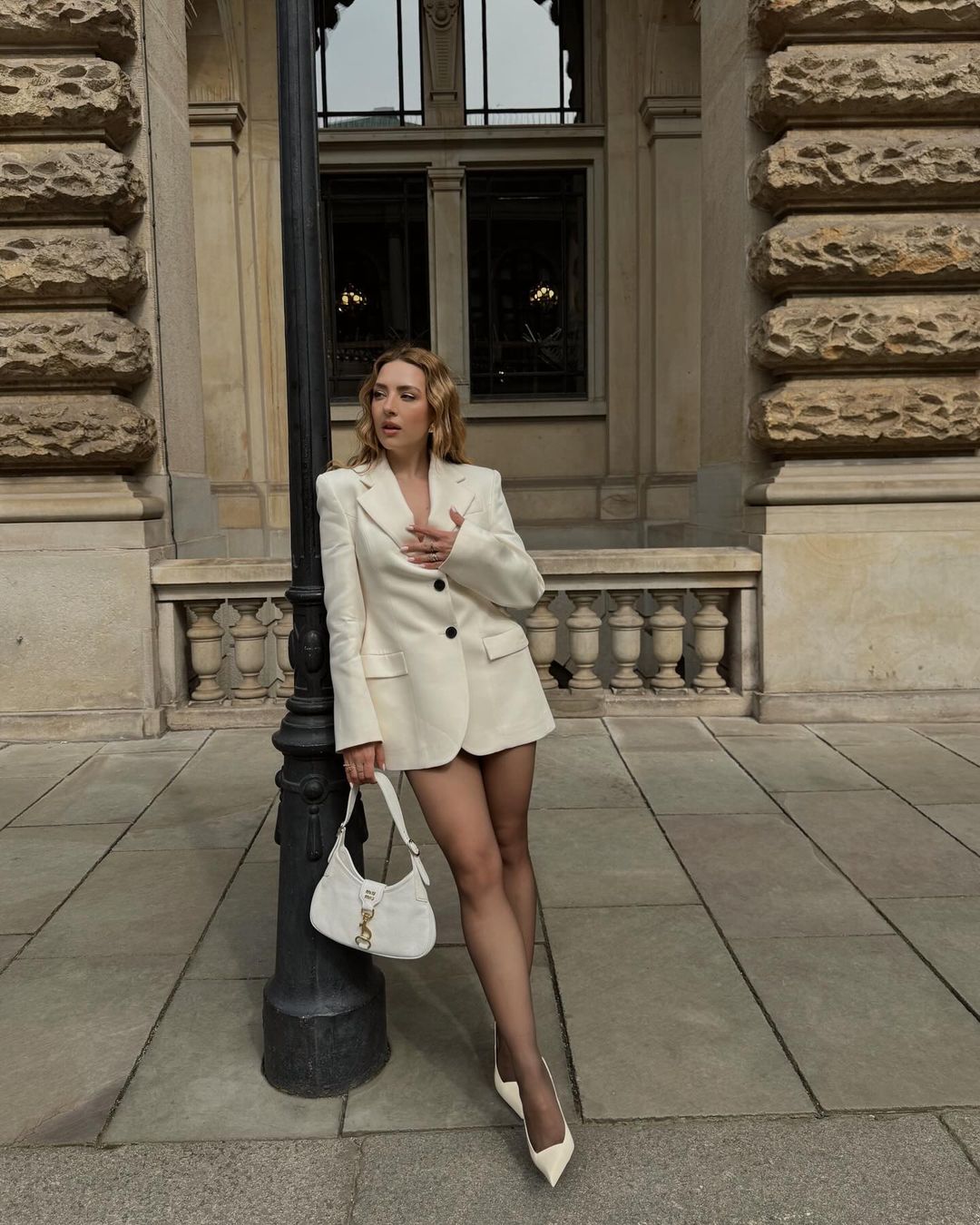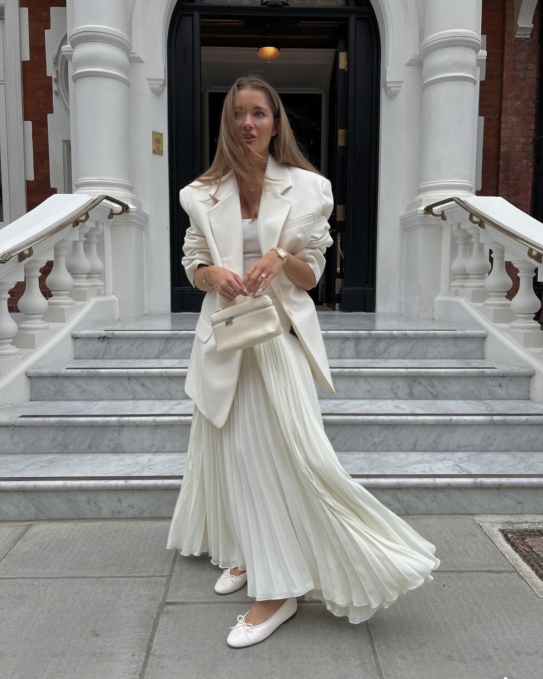 全白穿搭加上奶油色,層次感就出來了