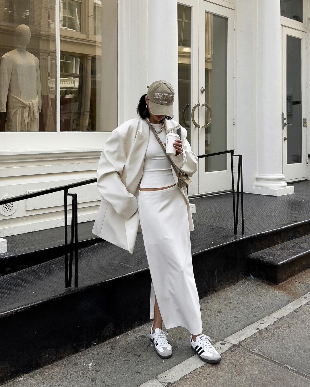 就像在純白的奶油蛋糕用奶油擠出畫龍點睛的圖案,全白穿搭也可以利用一件奶油色單品增添層次感。瞧瞧潮人們的示範,最好的方式就是以白色打底,選擇白襯衫、針織或是 T 恤,下身或外套就可以來一件奶油色,或者相反過來,奶油色上衣搭配白色長褲。