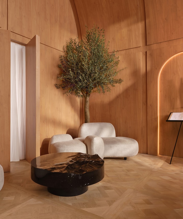 對於今回的挑戰,Mathieu Lehanneur 高興地表示:「我打造了一個既浪漫又現代、既親密又奢華的空間。」並以自己過往的經典設計妝點了房間一番,其中包含充滿曲線美的 ”Familyscape Sofa“、“Trinity Table” 及 “Guernica Pendant Light”。