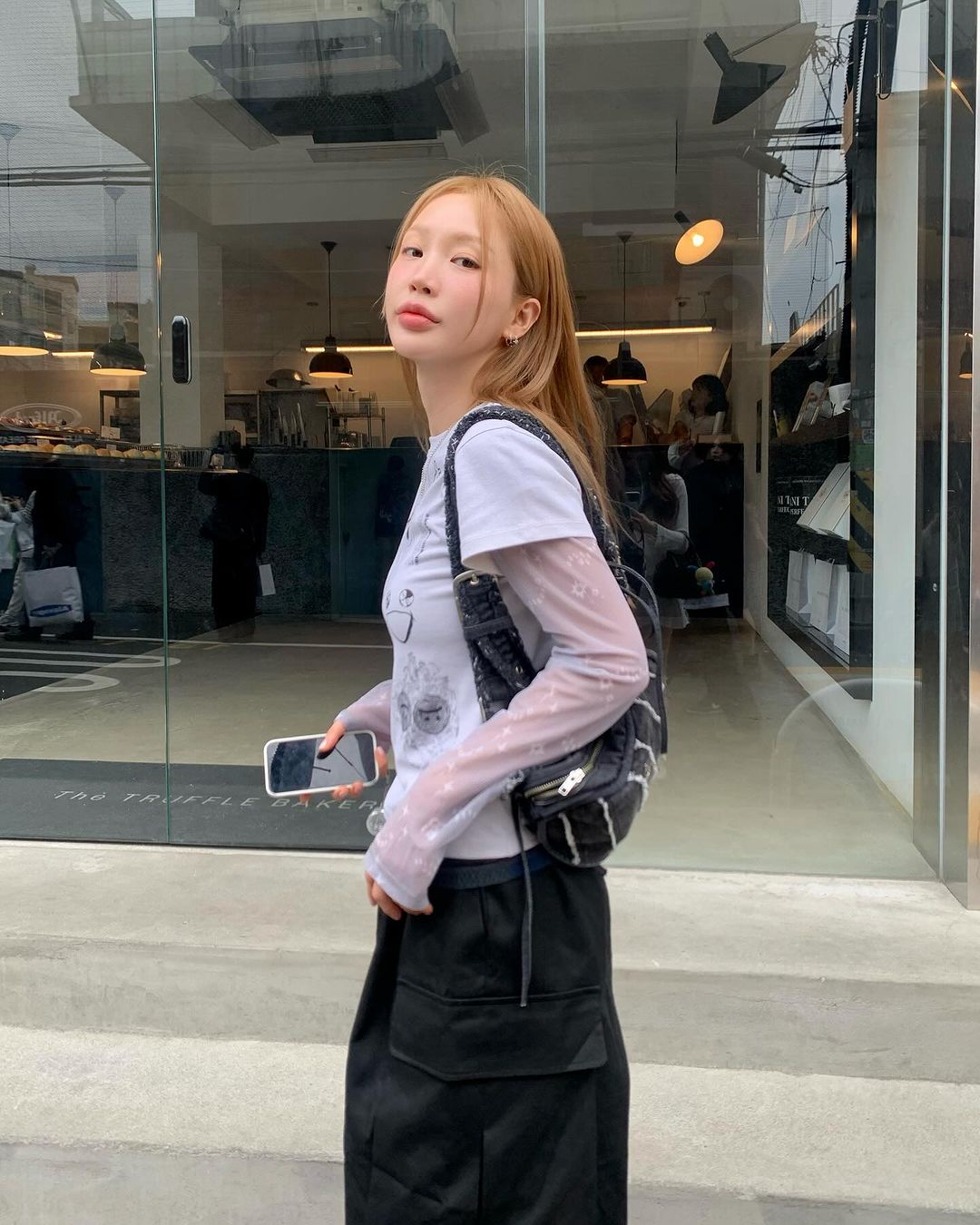 單穿一件寬寬鬆鬆的 T 恤總給人一種街頭率性的感覺,如果想穿出新意,不妨在裡頭內搭長袖打底,大大方方的露出一截袖子,輕鬆穿出層次感,不過「短袖 T +長袖打底」穿得不好很容易有袖套的俗氣感,但如果將裡頭的內搭換成透膚材質出錯率就會大大降低了,同時還能增添一點性感又少女的氣息。