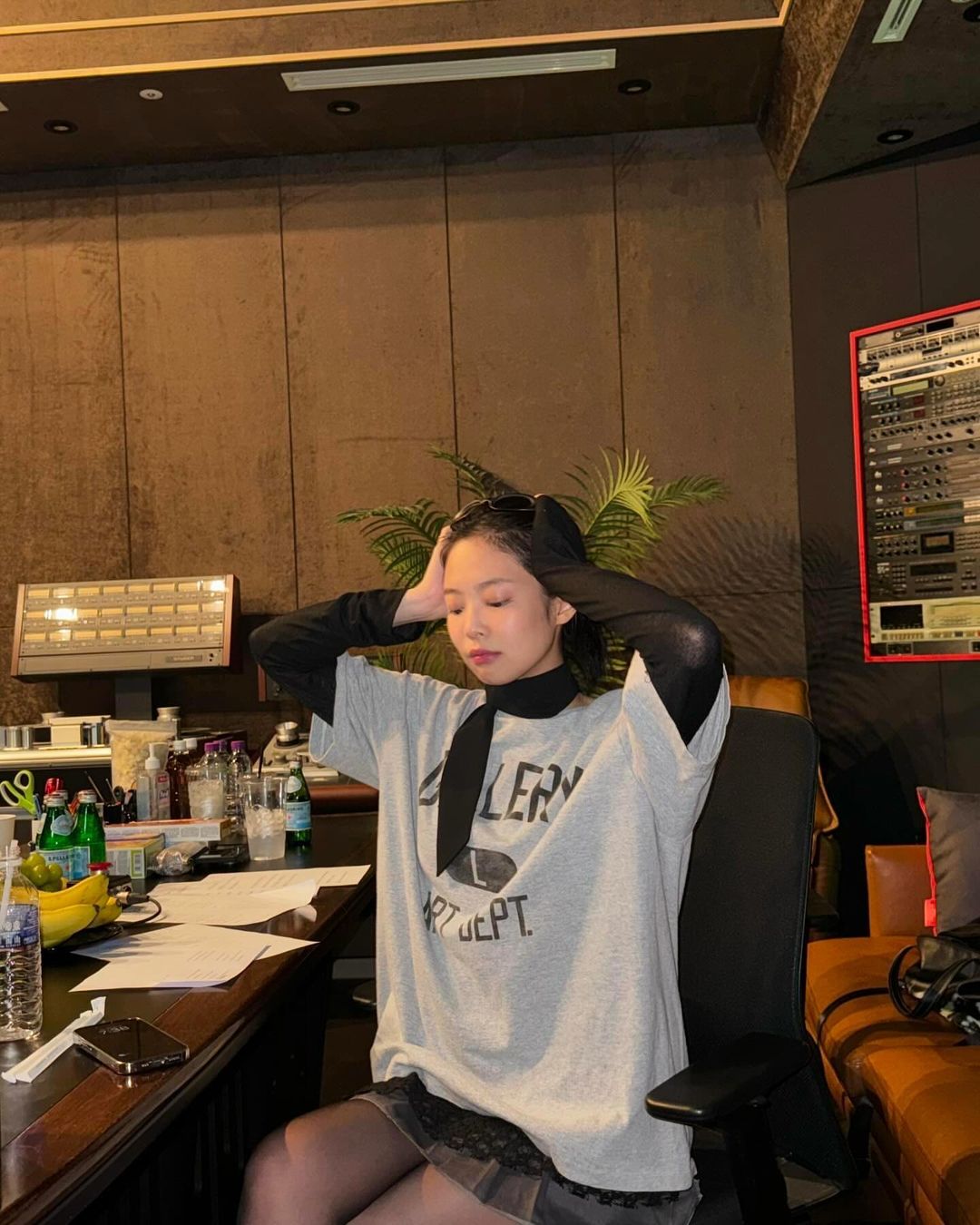 像是最近 Jennie 與韓國饒舌歌手 Zico 合作推出新歌《SPOT!》,在 MV 尚未正式出爐以前,社群上搶先釋出了一小片段,Jennie 在影片中身穿寬鬆的灰色 T 恤搭配迷你百褶裙,裡頭內搭透膚長袖上衣,脖子還有黑色絲巾點綴,又甜又酷,也成了粉絲們爭相模仿的造型。