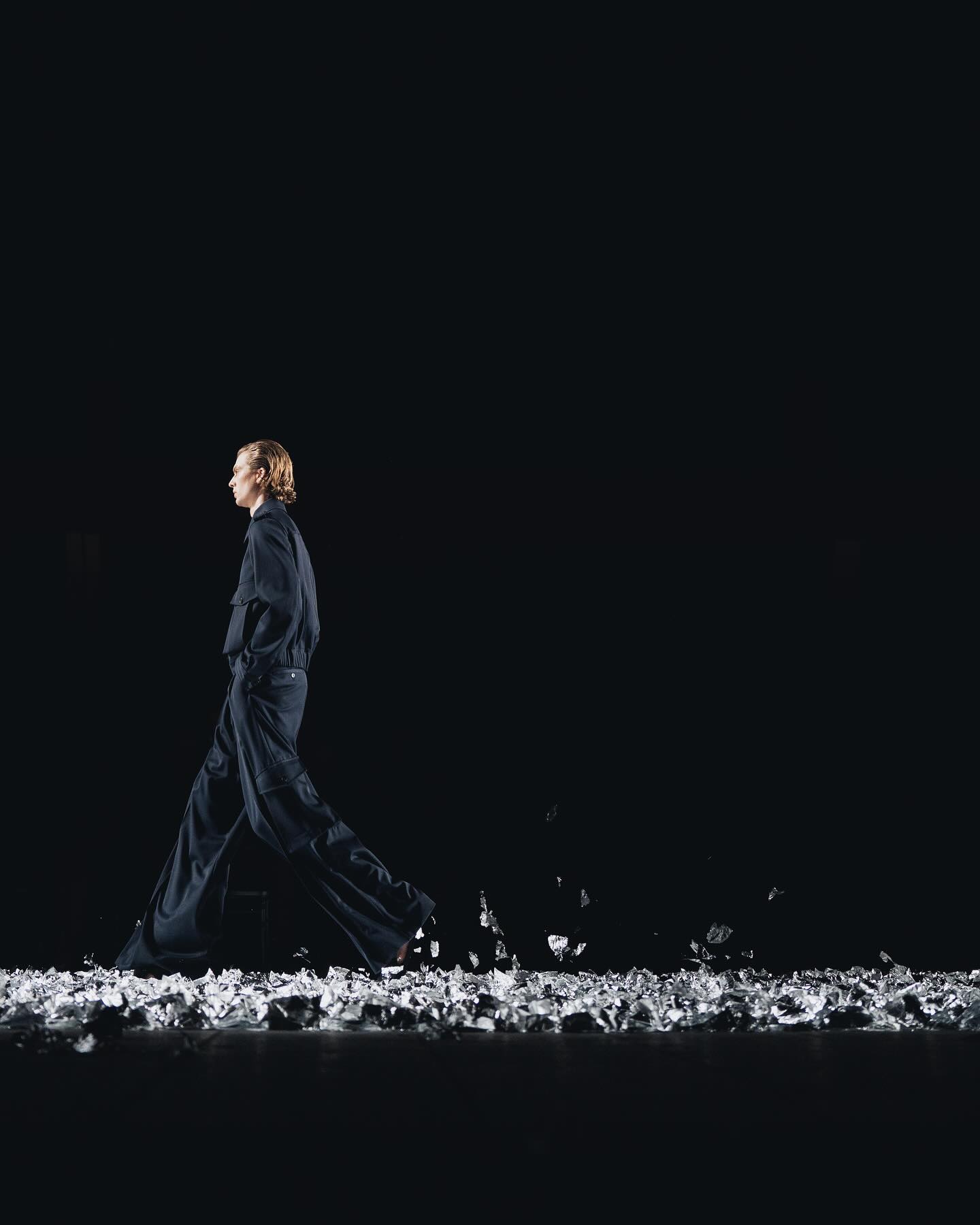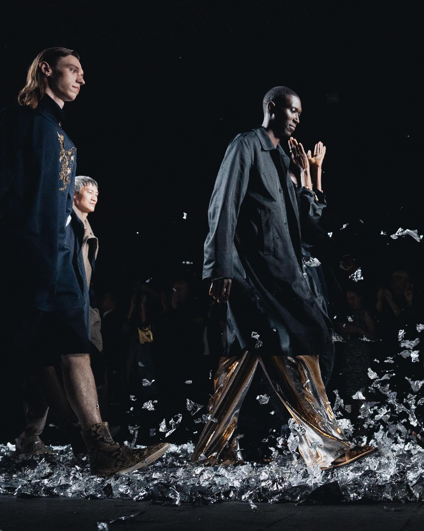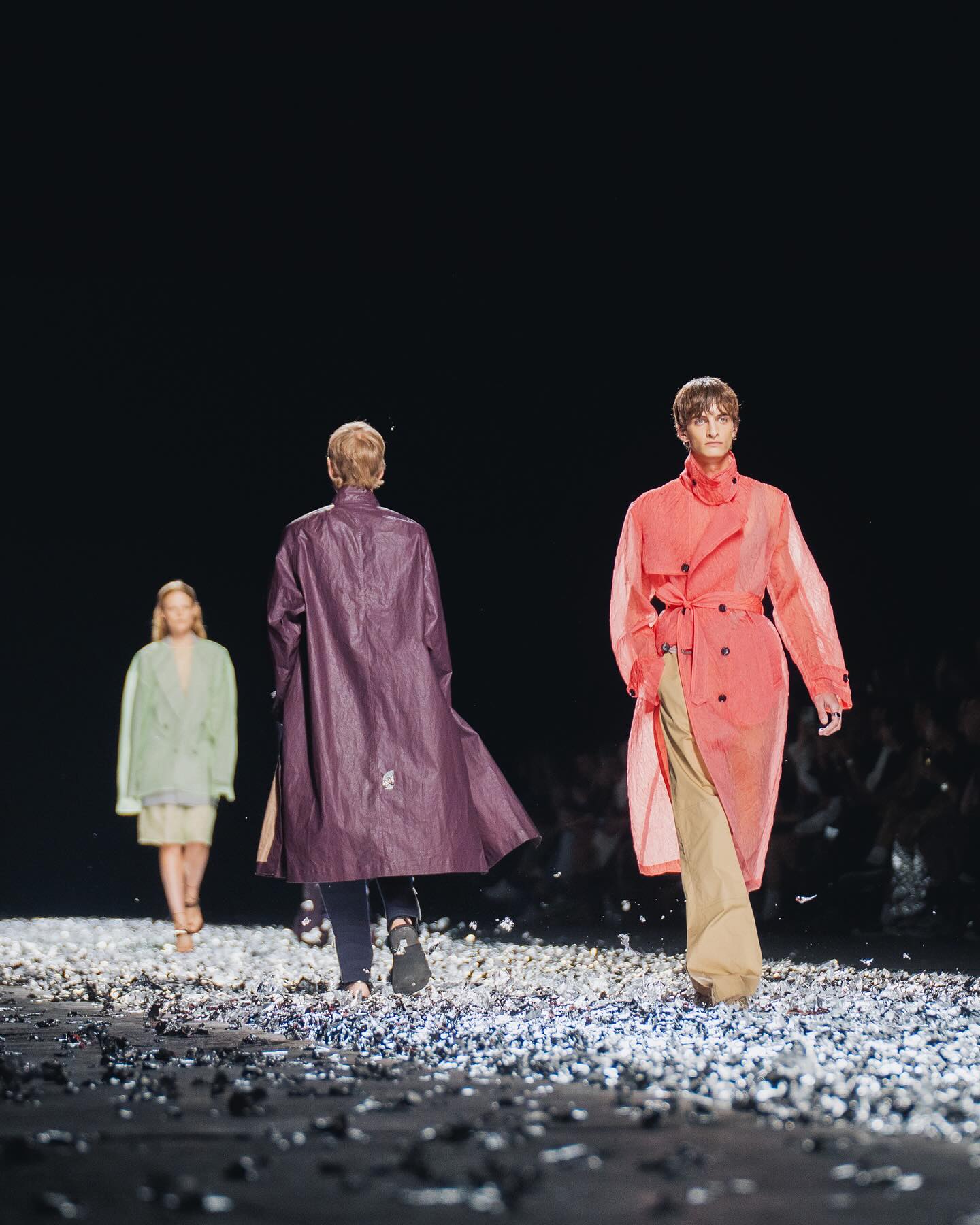 今回,數百名觀眾被引領至巴黎郊區一個佈滿塗鴉的倉庫,與 Dries Van Noten 一起度過他職業生涯中的最後一刻,當中長達一小時的招待會令許多賓客都興奮不已,同時期待 Dries Van Noten 最後現身鞠躬,當賓客們一同入座參加這歷史性的一刻時,布幕在所有人都預料不到的時間點升起,寬敞的銀色落葉伸展台驚喜亮相。