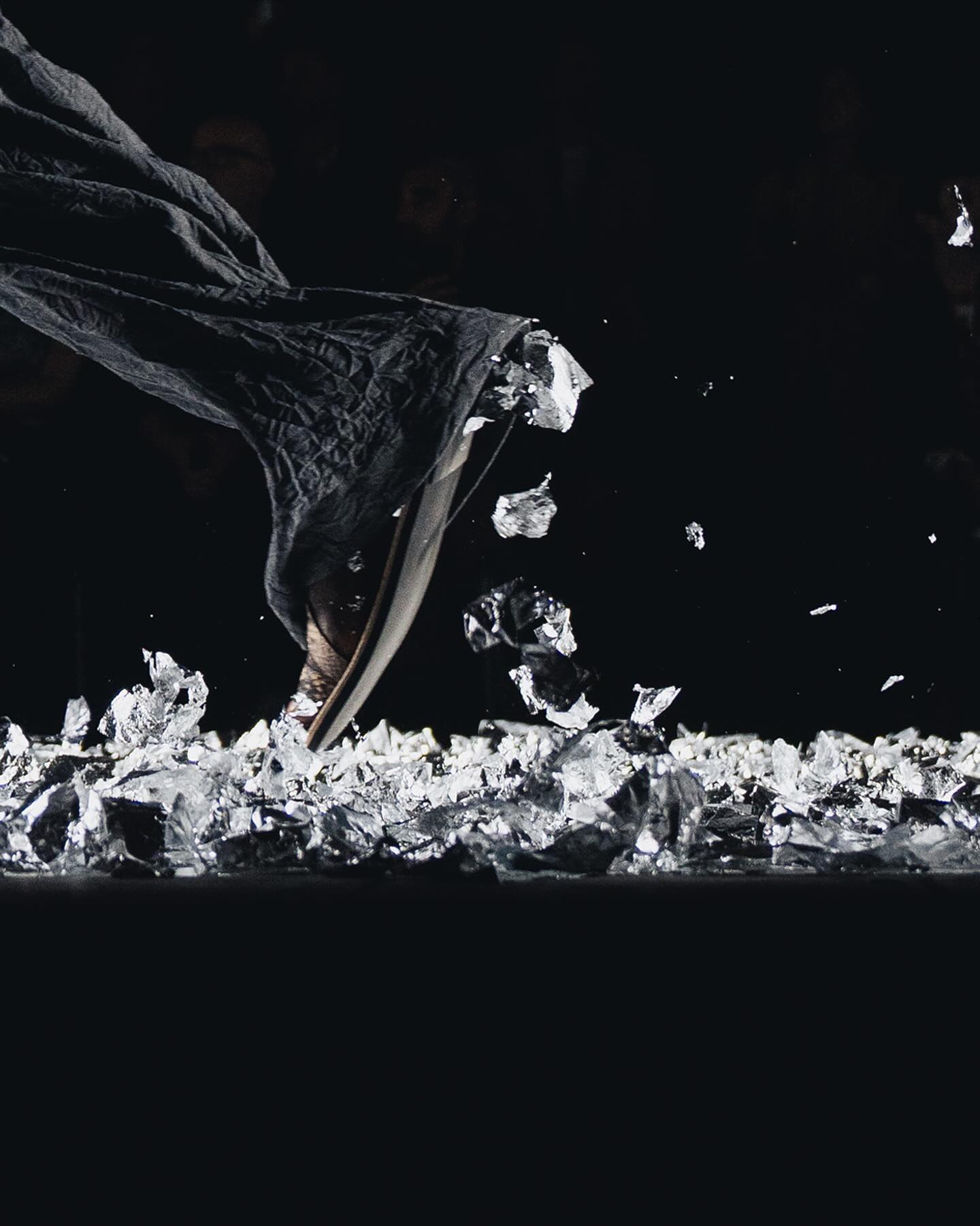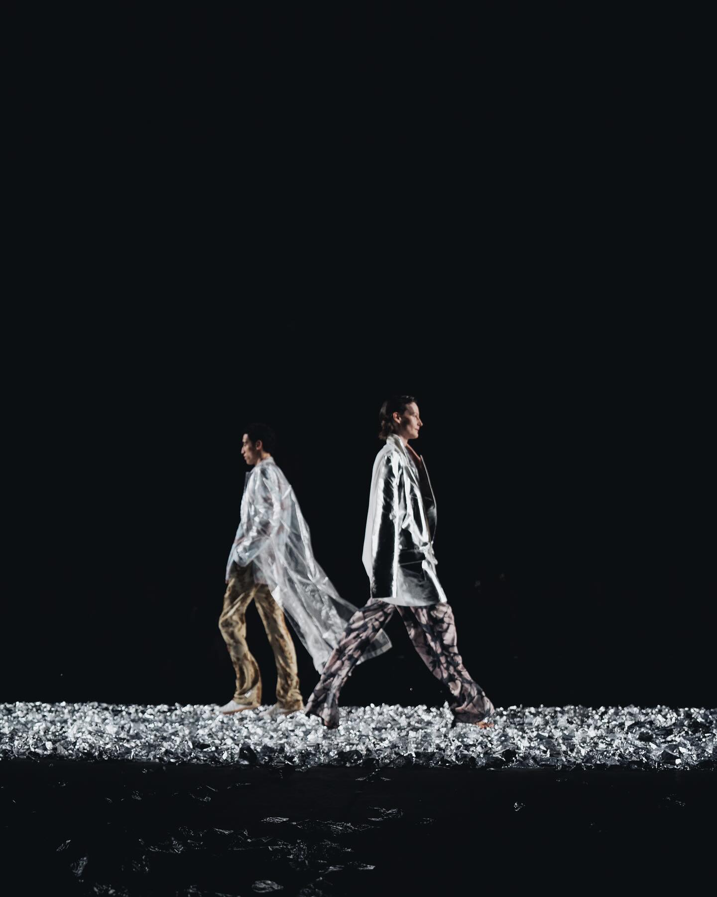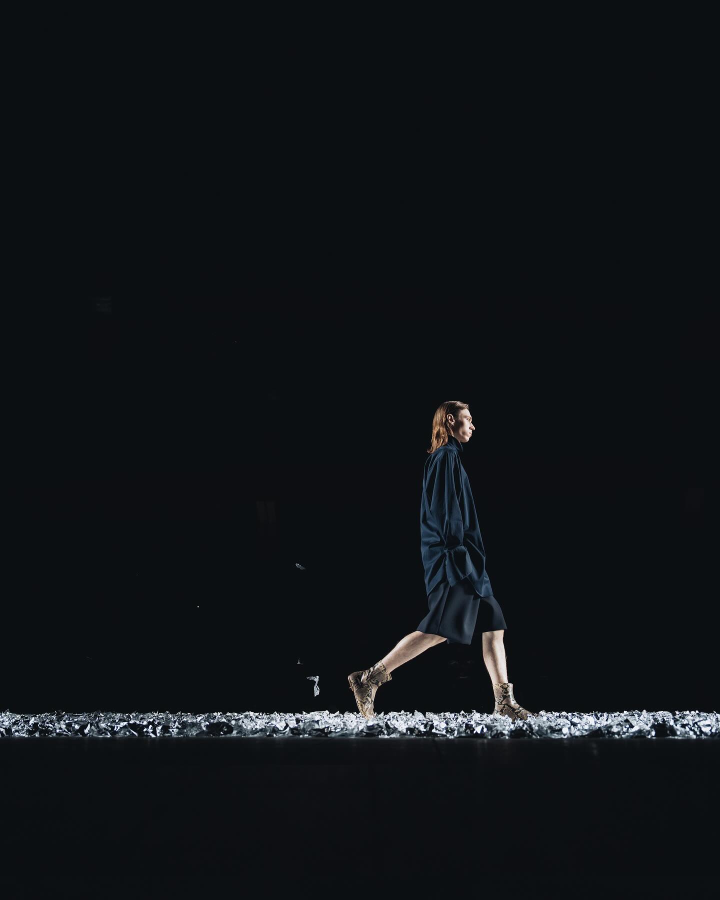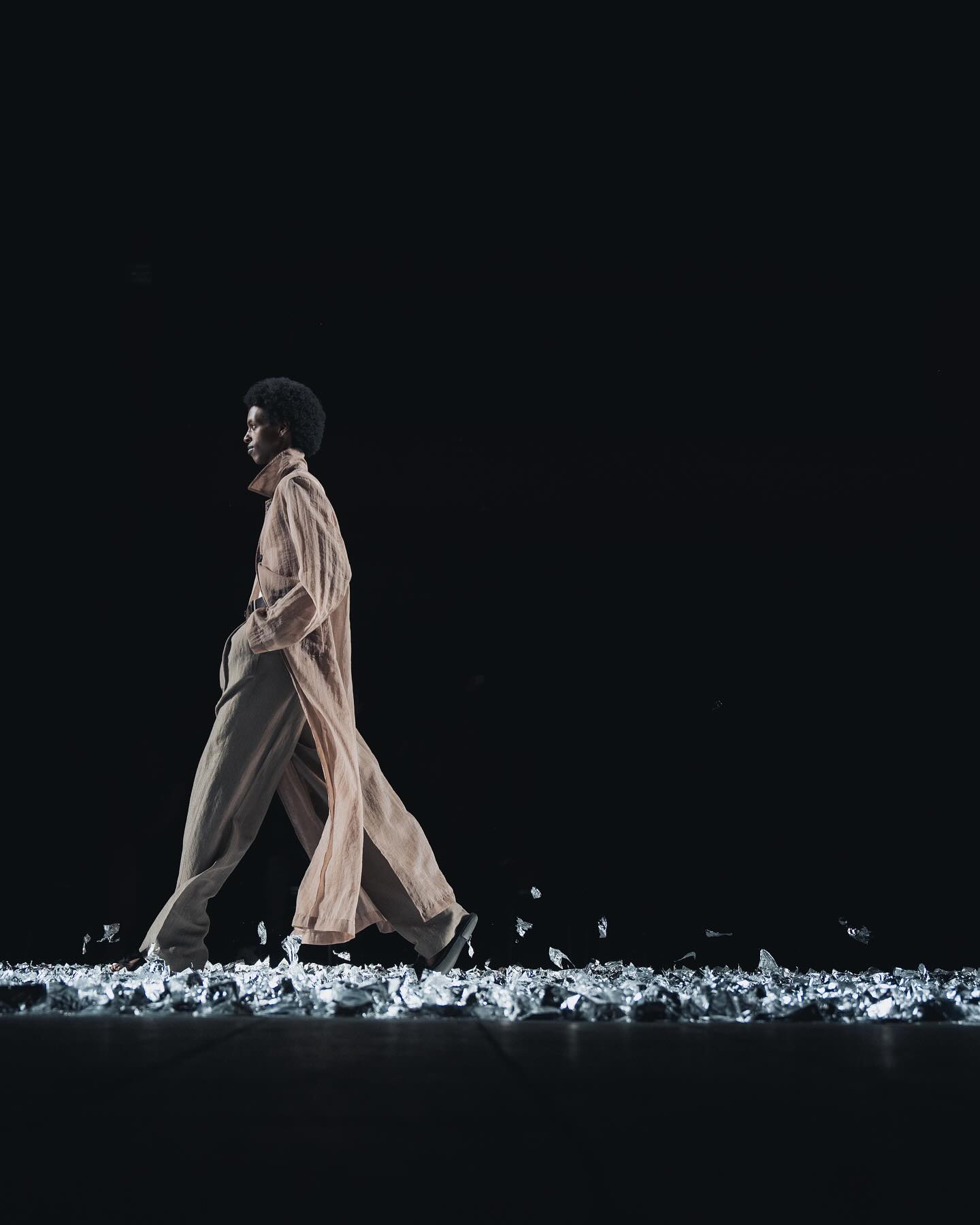 今回,數百名觀眾被引領至巴黎郊區一個佈滿塗鴉的倉庫,與 Dries Van Noten 一起度過他職業生涯中的最後一刻,當中長達一小時的招待會令許多賓客都興奮不已,同時期待 Dries Van Noten 最後現身鞠躬,當賓客們一同入座參加這歷史性的一刻時,布幕在所有人都預料不到的時間點升起,寬敞的銀色落葉伸展台驚喜亮相。