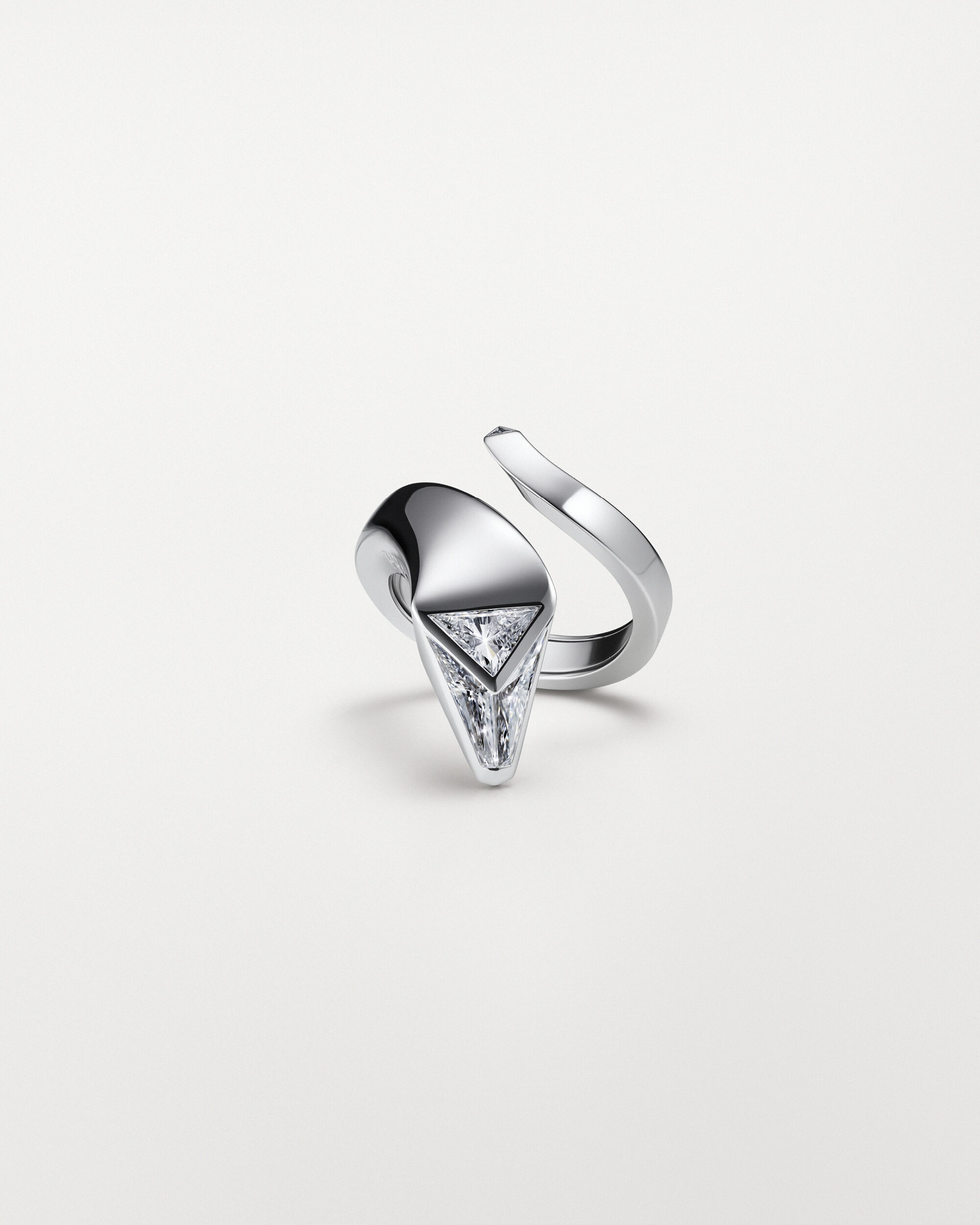 近日全新亮相的 Prada Cut,以十分獨特的形狀詮釋了 Prada Triangle 的特定比例,將其充份體現於絢爛奪目的三角形琢面上,當中從 0.8 克拉到 5.5 克拉,每顆 Prada Cut 都是經過實驗室 100% 認證的培育鑽石,同時加入卓越的切割技術,打造出無色與 VVS 淨度最高品質的珍品,從技術到造型都大膽而現代、創新且獨特。
