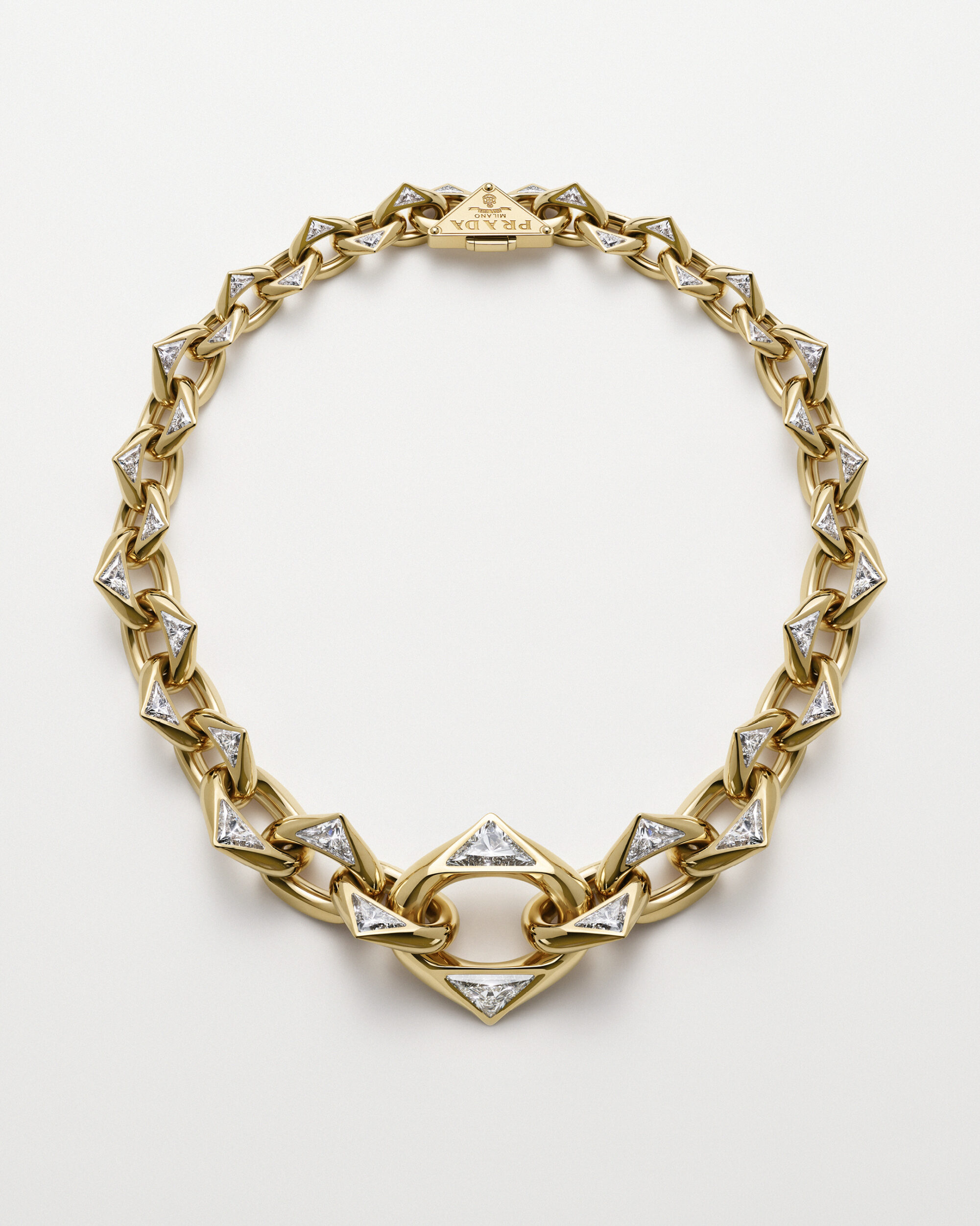 Prada Cut 工藝也運用於蛇型手鐲與蛇型戒指的頭尾部分,而鏈式項鍊則以三角形刻面鏈節為特色,鑲嵌上總重約 40 克拉的實驗室培育鑽石,以此反映珠寶本身的無窮魅力。