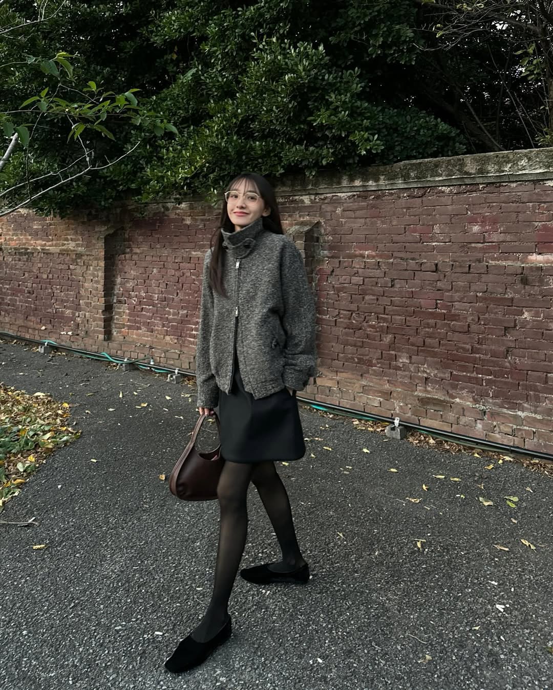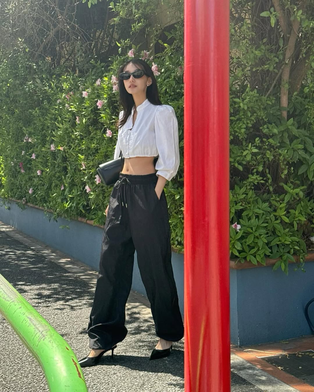 她的身高 158 公分,身形也是瘦瘦窄窄的,時常以上寬下窄的穿法營造氣勢感,或者偶爾會選用亮色系的配件、包款,為造型增添亮點,也能適度消彌一點黑白色的沉重感,很適合小個子女生參考。