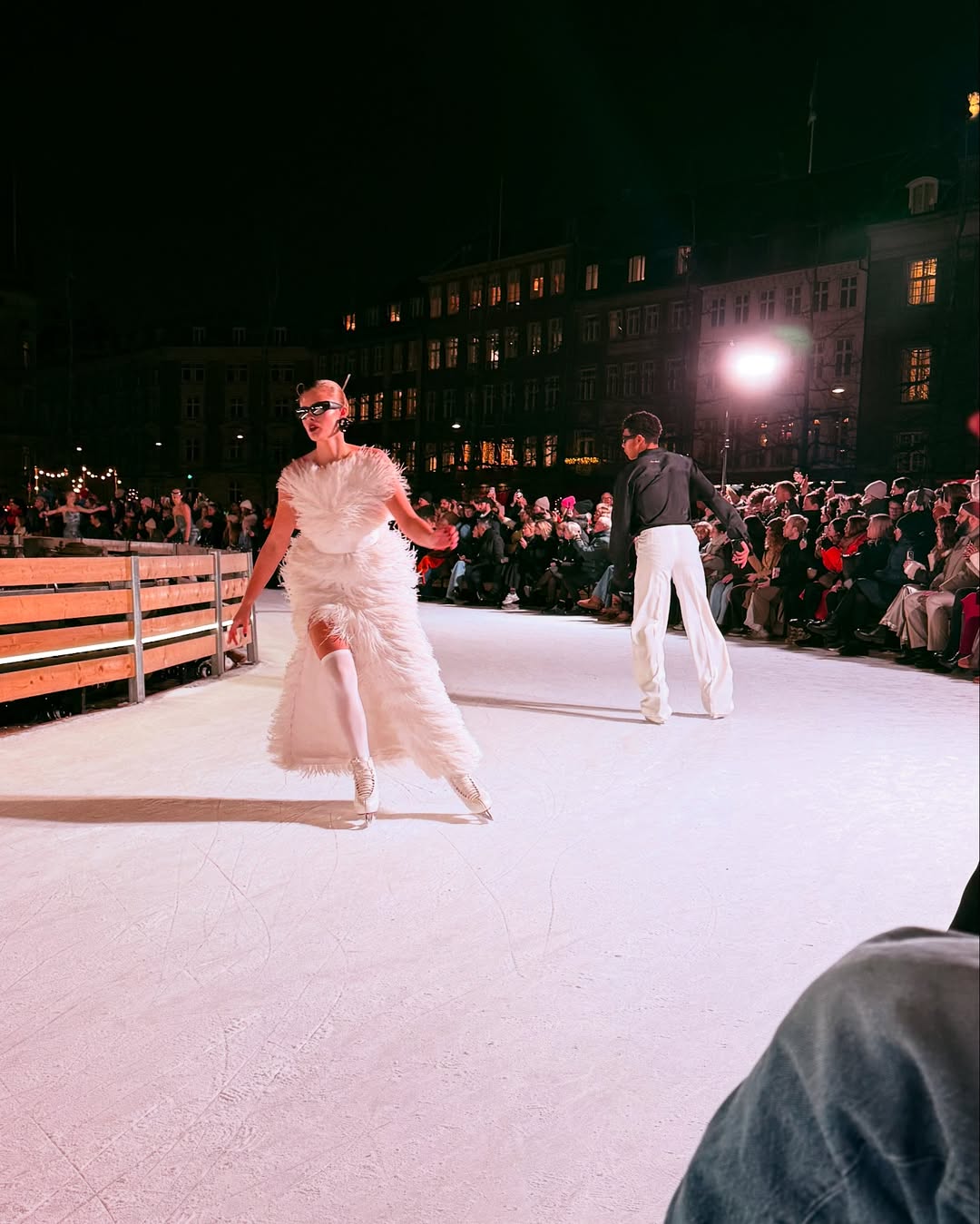 令人驚喜的是,這回 T 台不在室內,而是在國王新廣場的公共溜冰場上演,模特兒與專業溜冰員一同在冰上優雅地展開巡演,前者搭配電子音樂邁進,後者則穿著溜冰鞋優雅恣意地隨之起舞,加上丹麥皇家劇院和 D’Angleterre 酒店聖誕燈飾的加持,整個場景顯得更加奇幻動人。