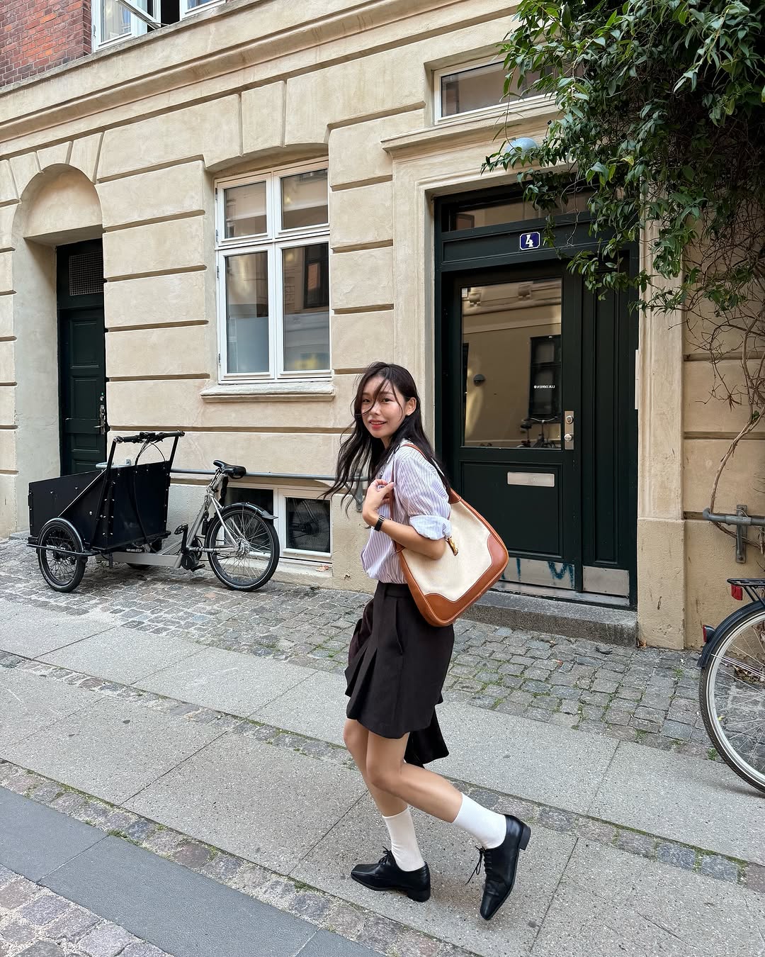 第一次滑到她的帳號時,就被極具氛圍感的穿搭照給吸引了目光,她的照片走的是隨心所欲路線,不刻意專注於記錄穿搭,而是捕捉了日常的瞬間,比如回眸的剎那、邁步過馬路的身影,或是愜意地坐在咖啡店的椅子上、隨性地倚靠著欄杆等等,張張充滿生活氣息。