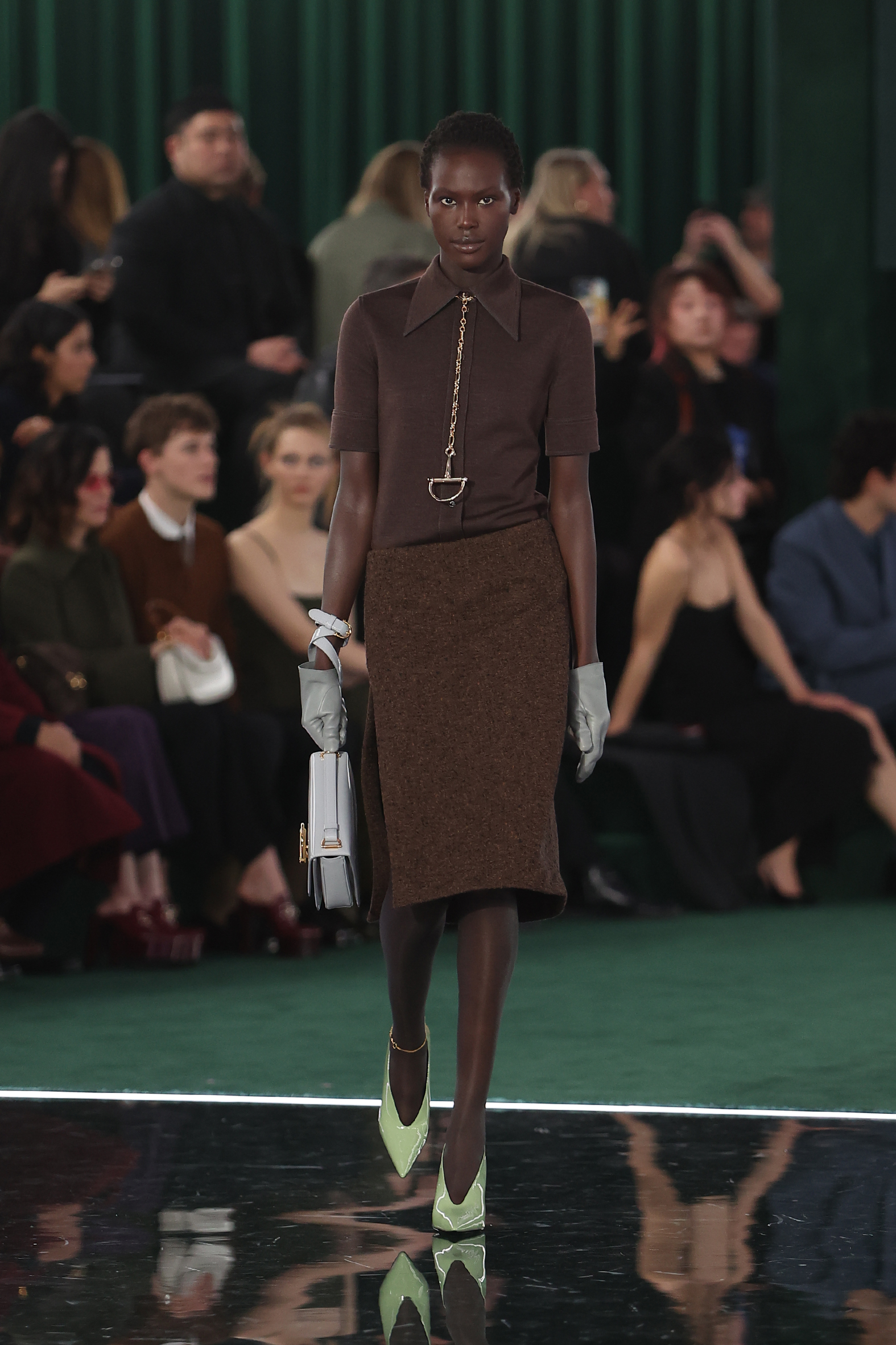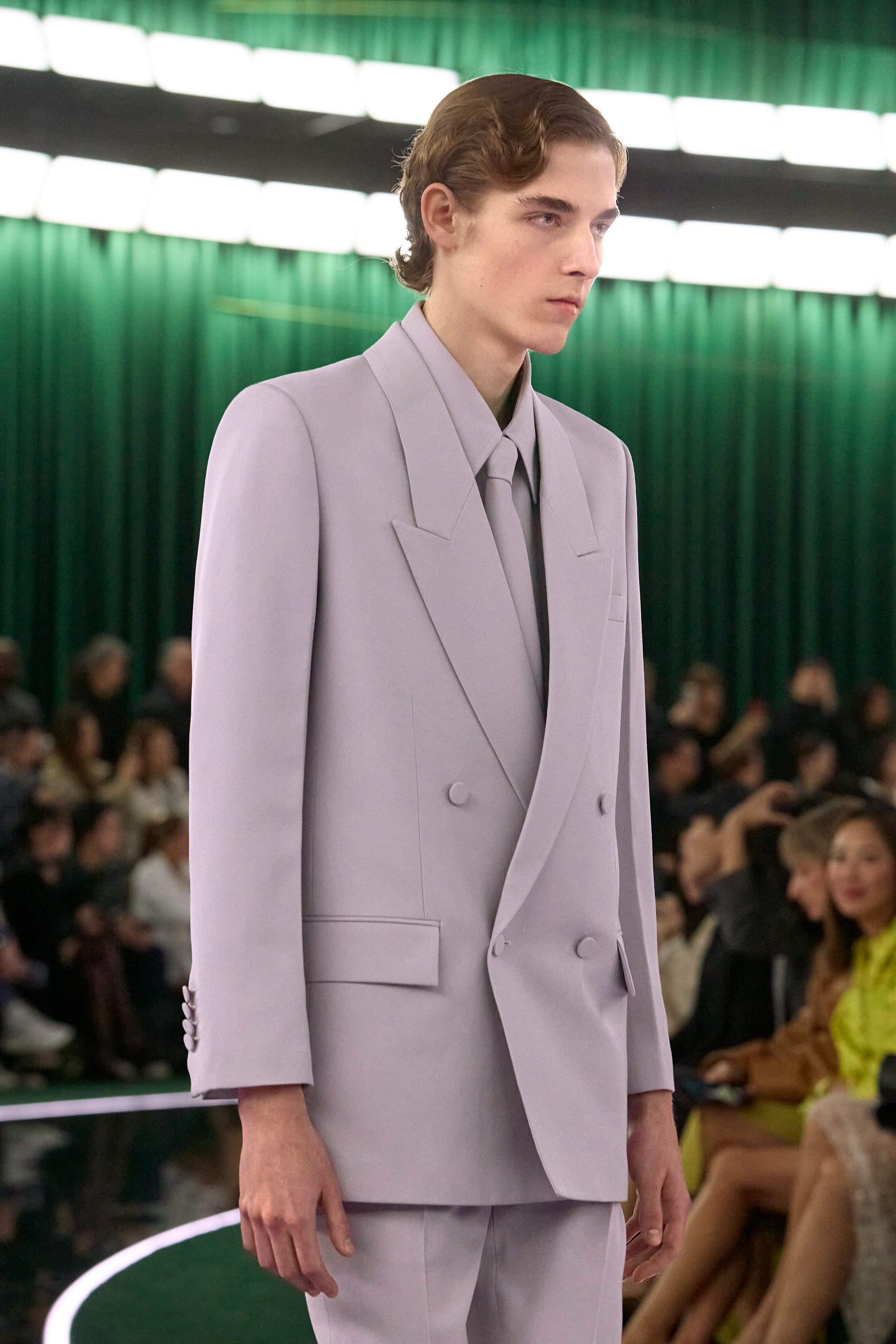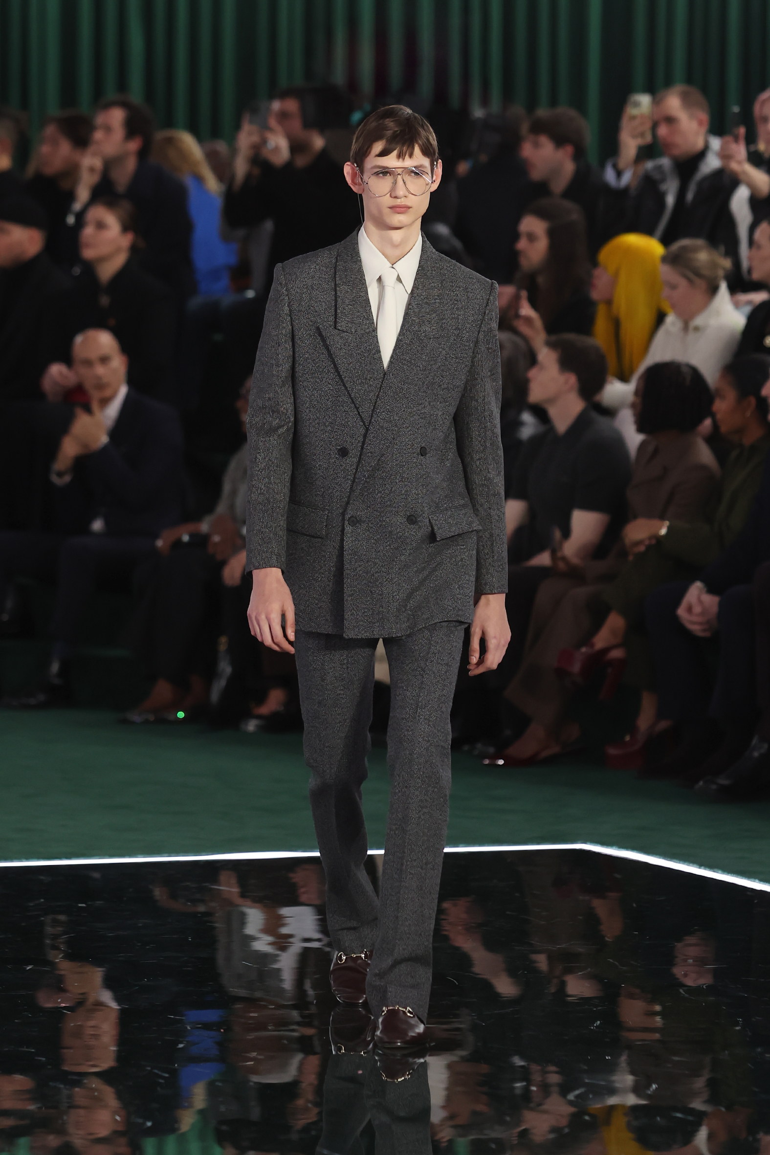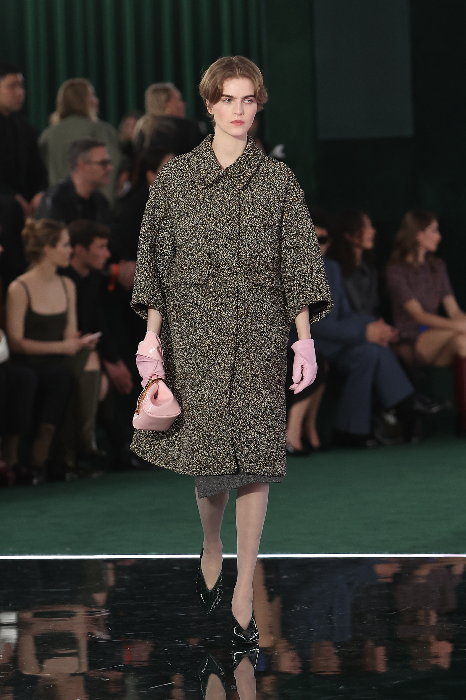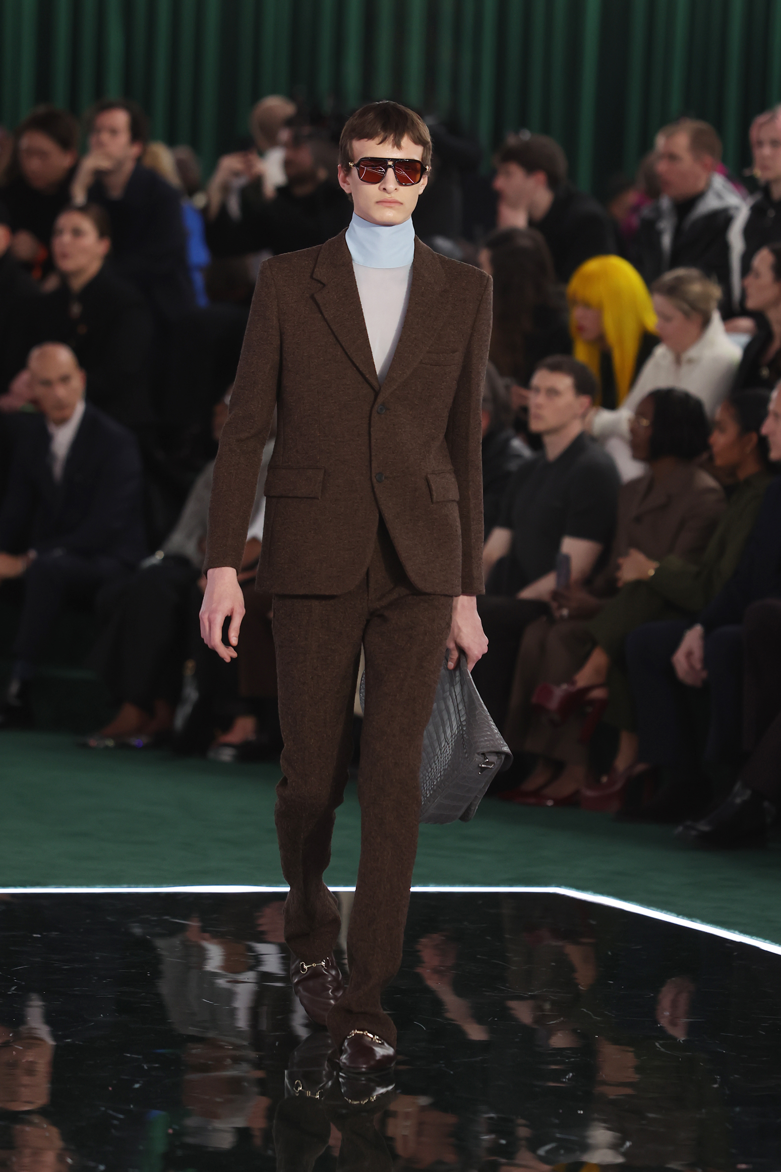 從磨毛馬海毛、珍珠母皮革,到塗層羊毛與混紡花呢,每一種材質皆經過精細調和,演繹經典與創新的共存;而綠、灰、淡紫與棕色的漸變色調更是貫穿整體風格,使男女裝呈現出流暢的統一性。