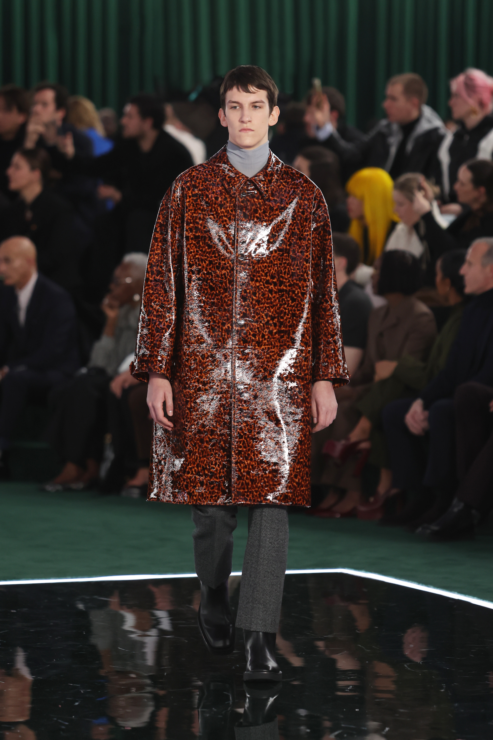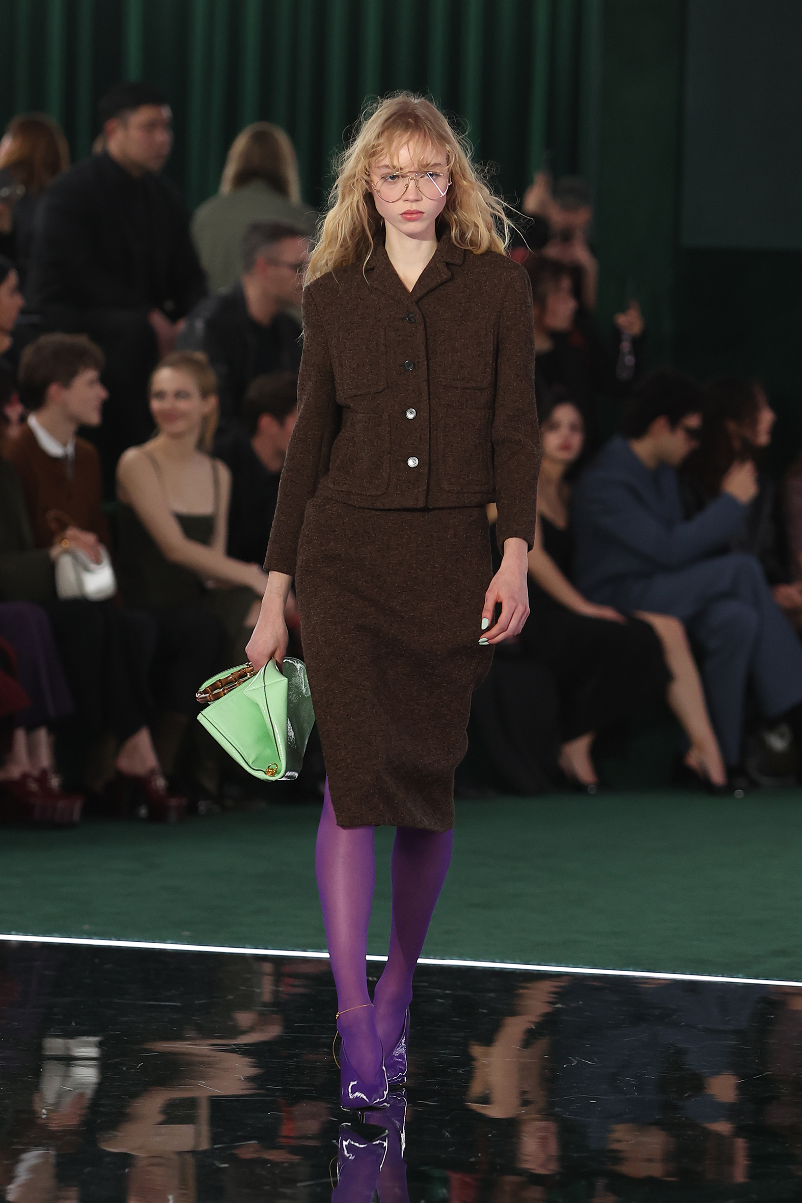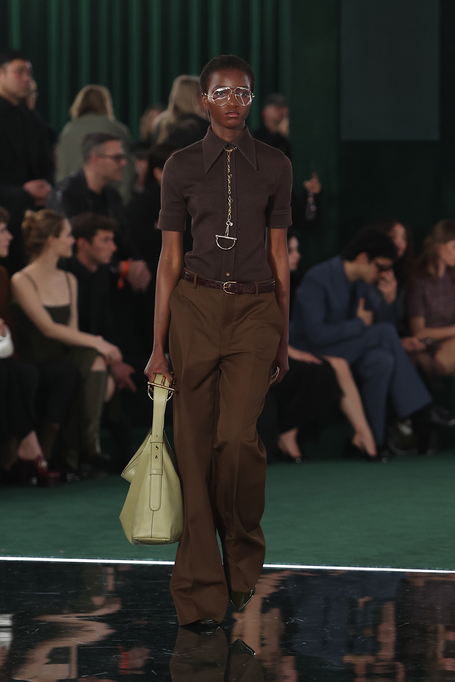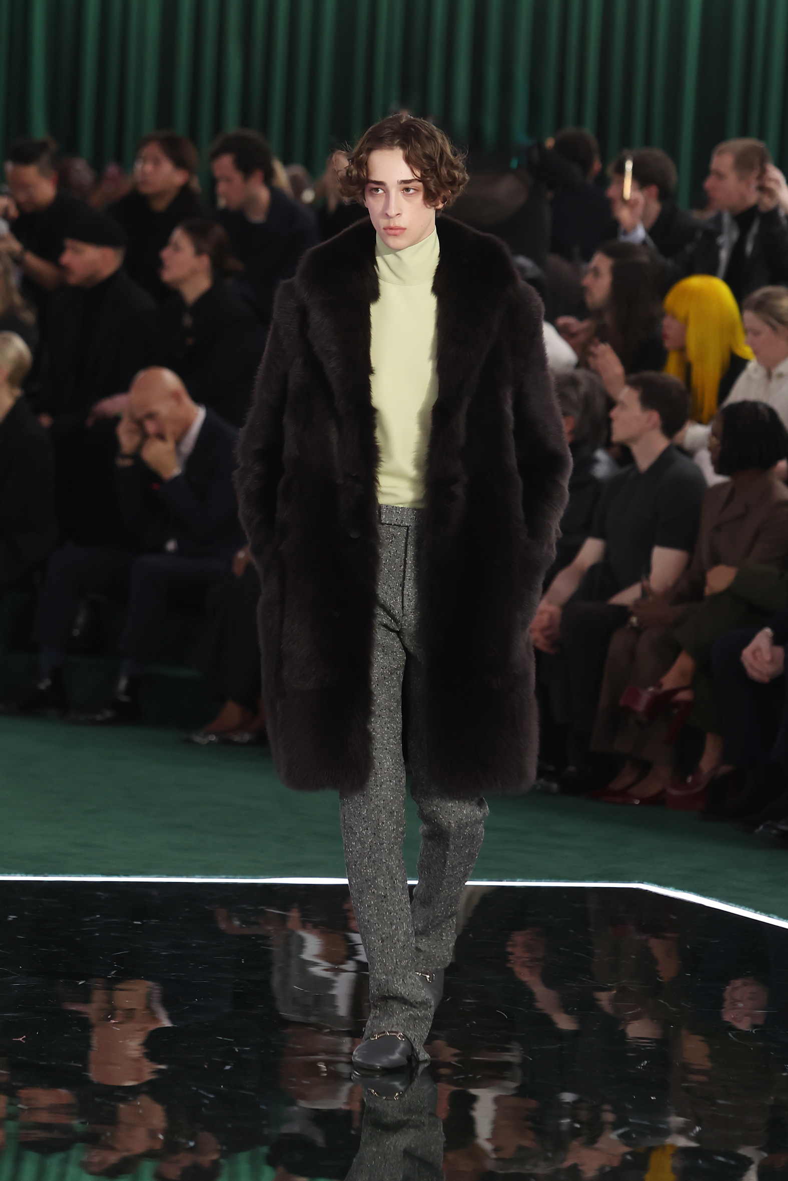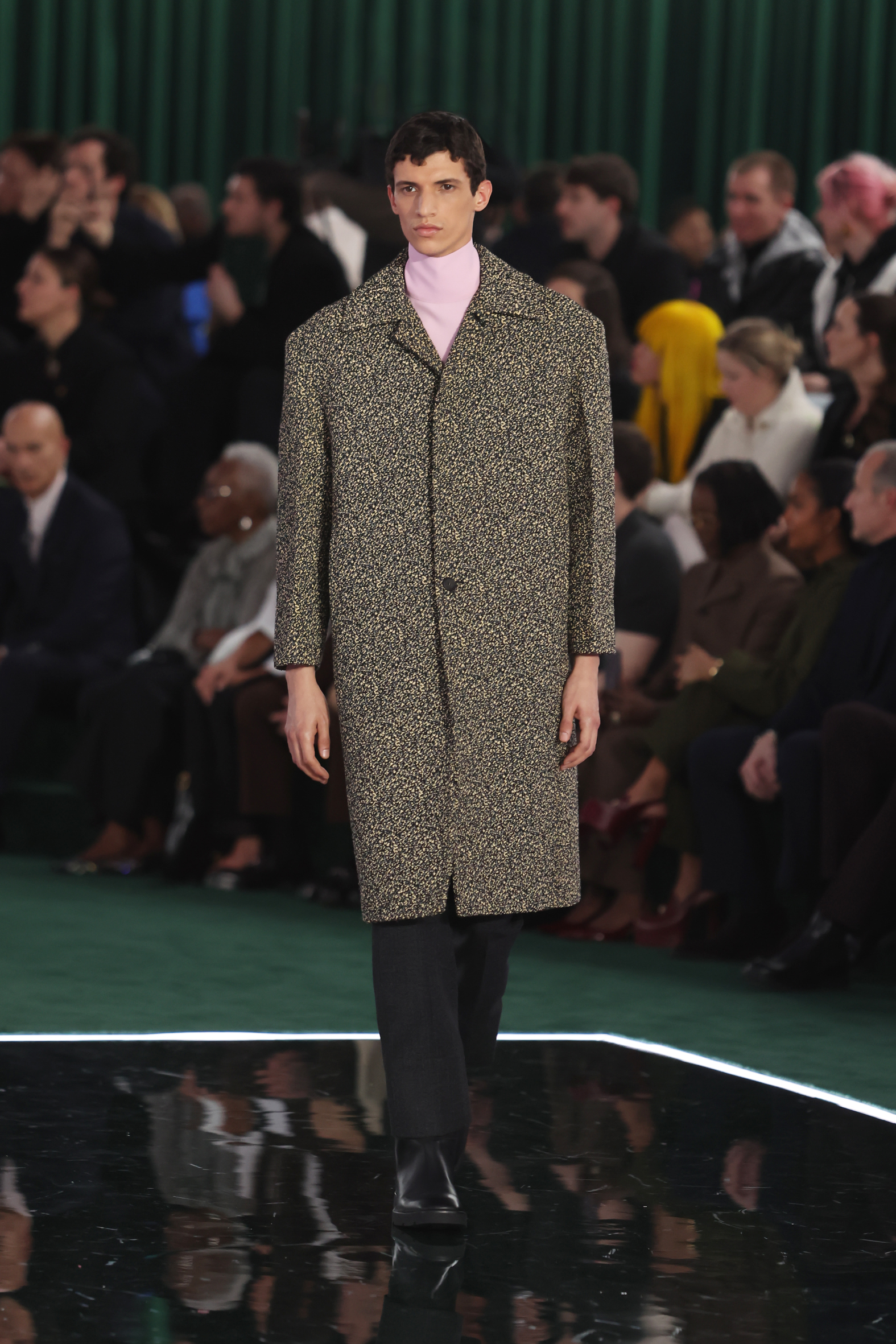 從磨毛馬海毛、珍珠母皮革,到塗層羊毛與混紡花呢,每一種材質皆經過精細調和,演繹經典與創新的共存;而綠、灰、淡紫與棕色的漸變色調更是貫穿整體風格,使男女裝呈現出流暢的統一性。