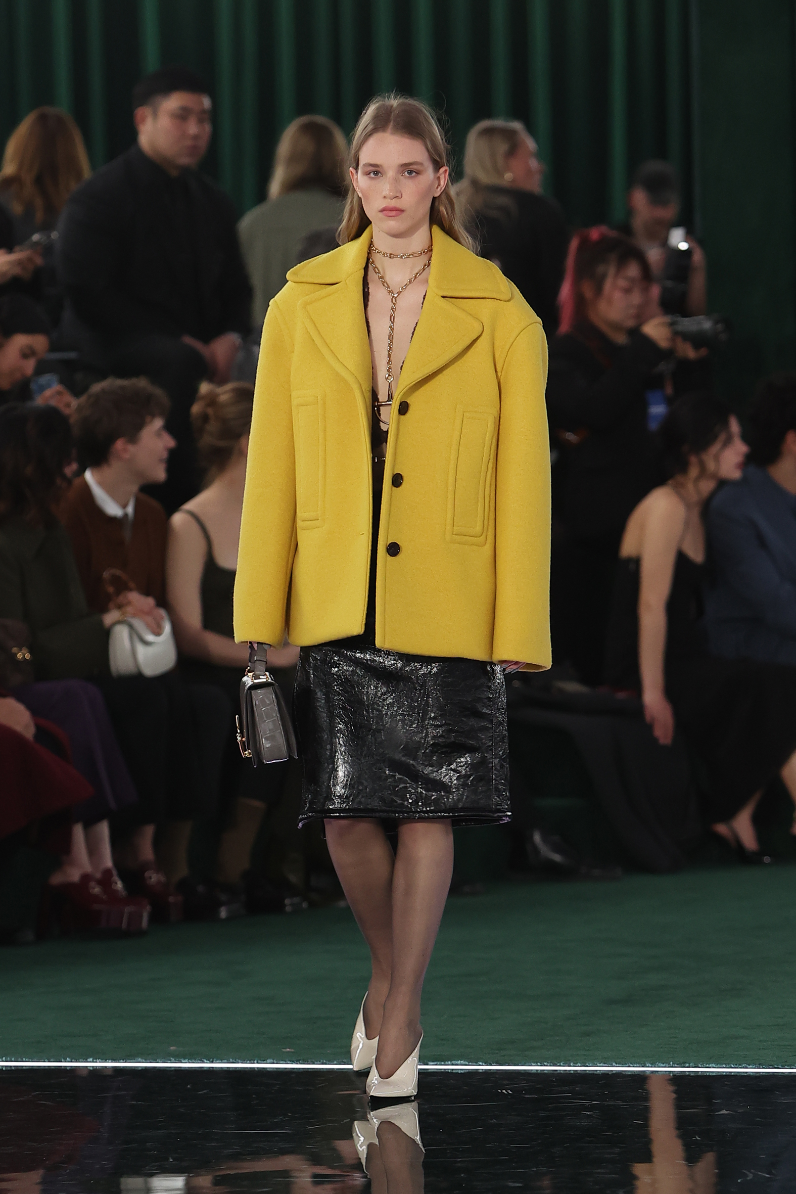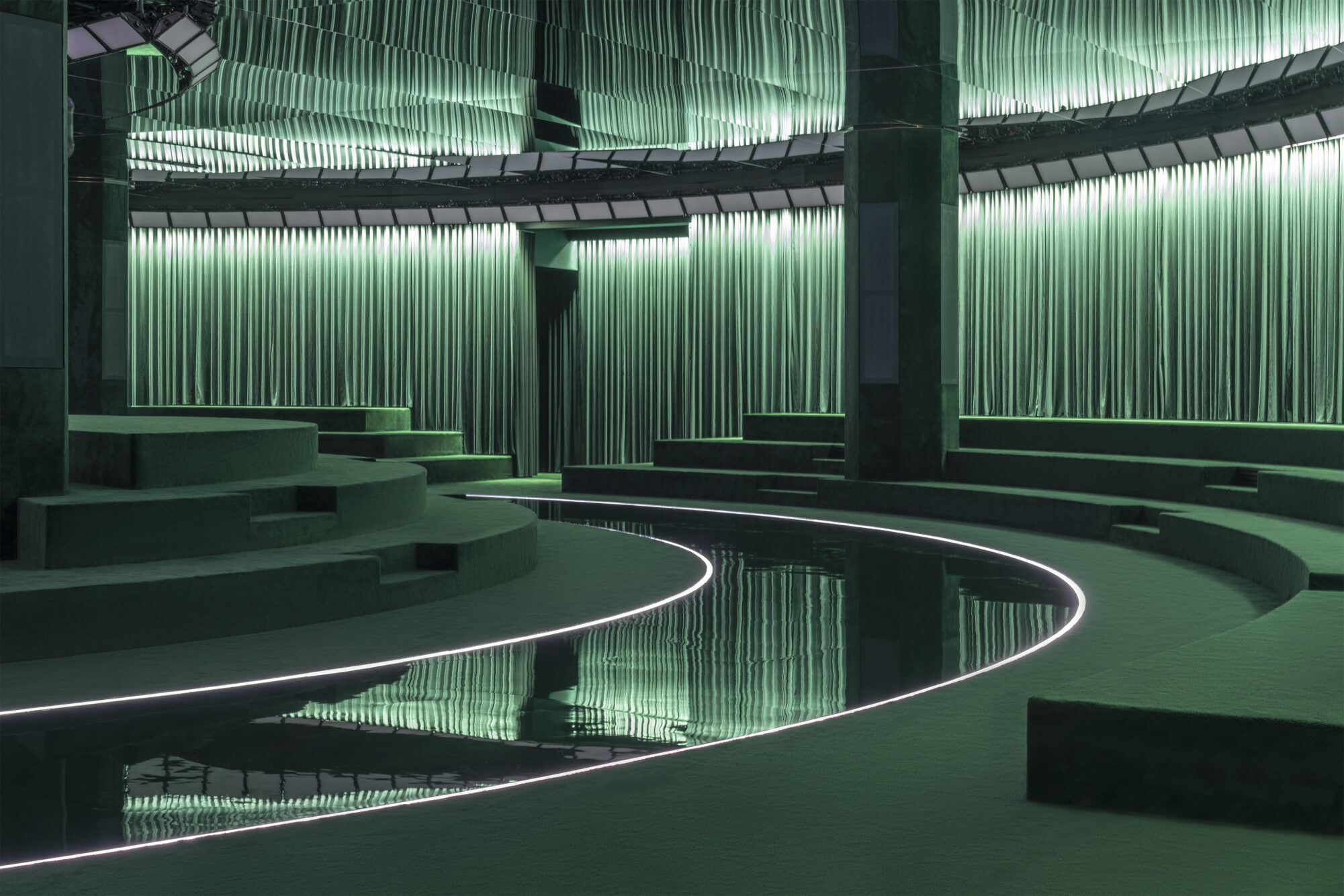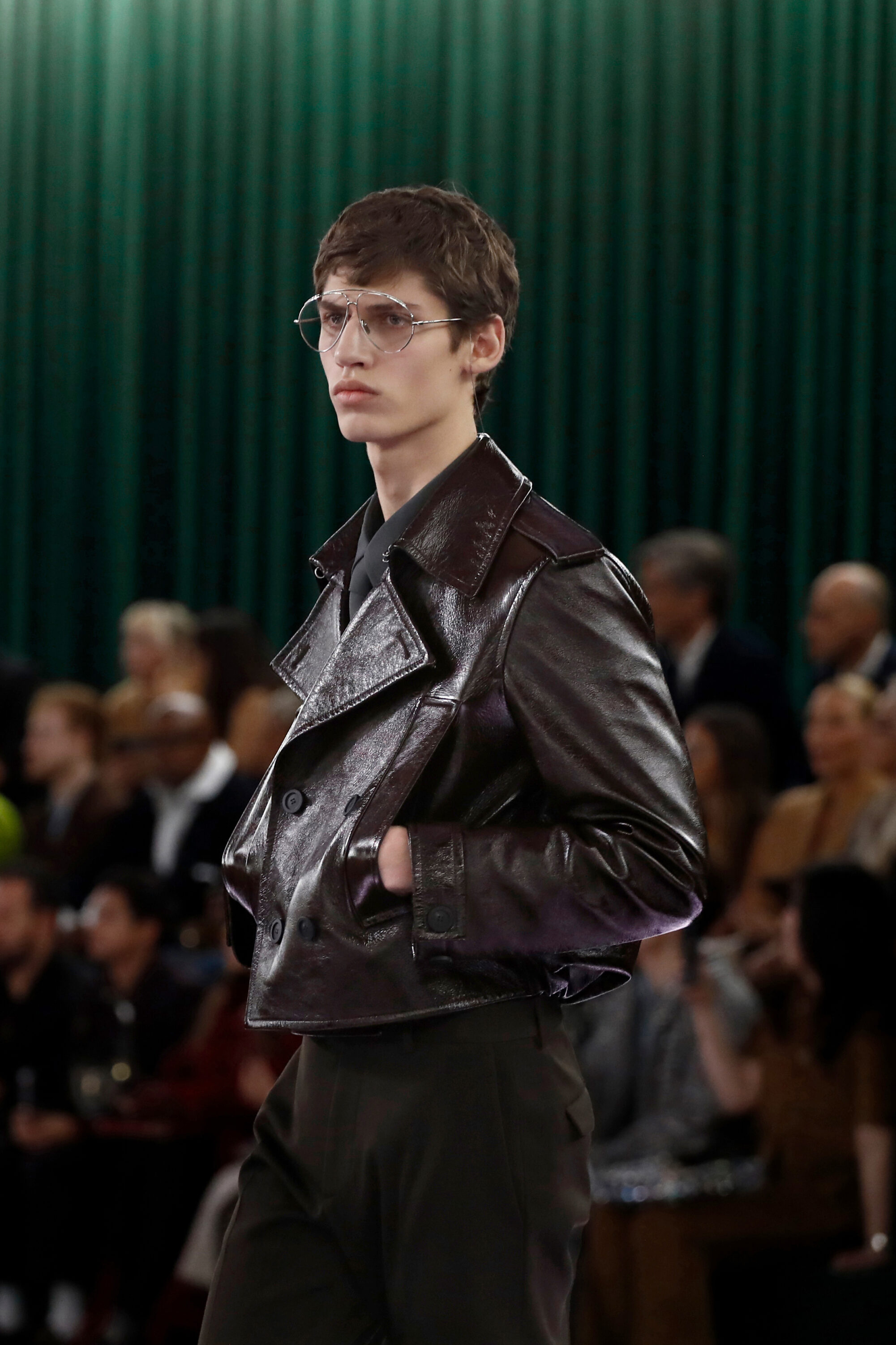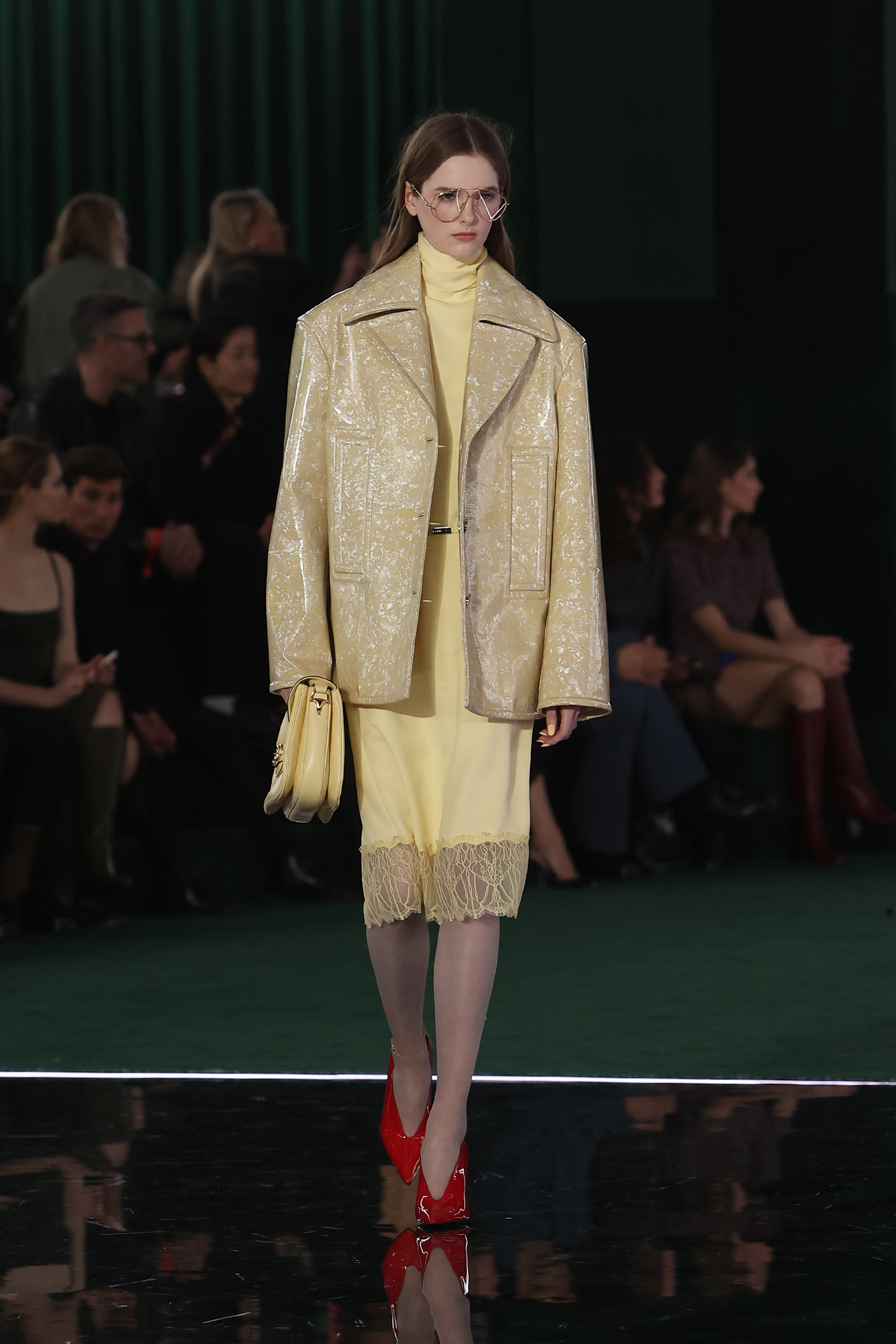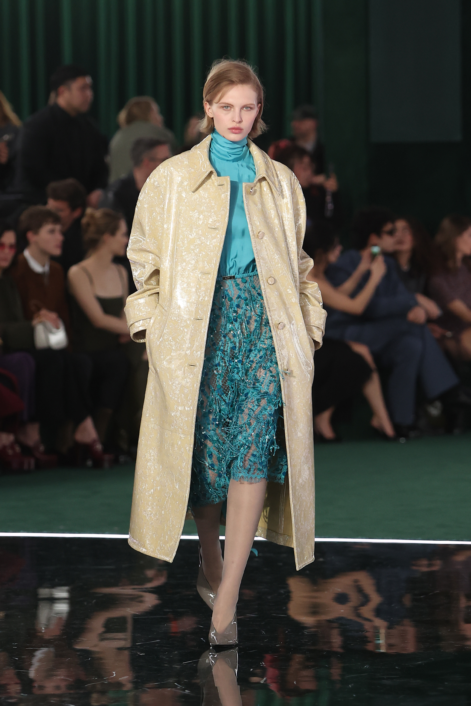 從磨毛馬海毛、珍珠母皮革,到塗層羊毛與混紡花呢,每一種材質皆經過精細調和,演繹經典與創新的共存;而綠、灰、淡紫與棕色的漸變色調更是貫穿整體風格,使男女裝呈現出流暢的統一性。