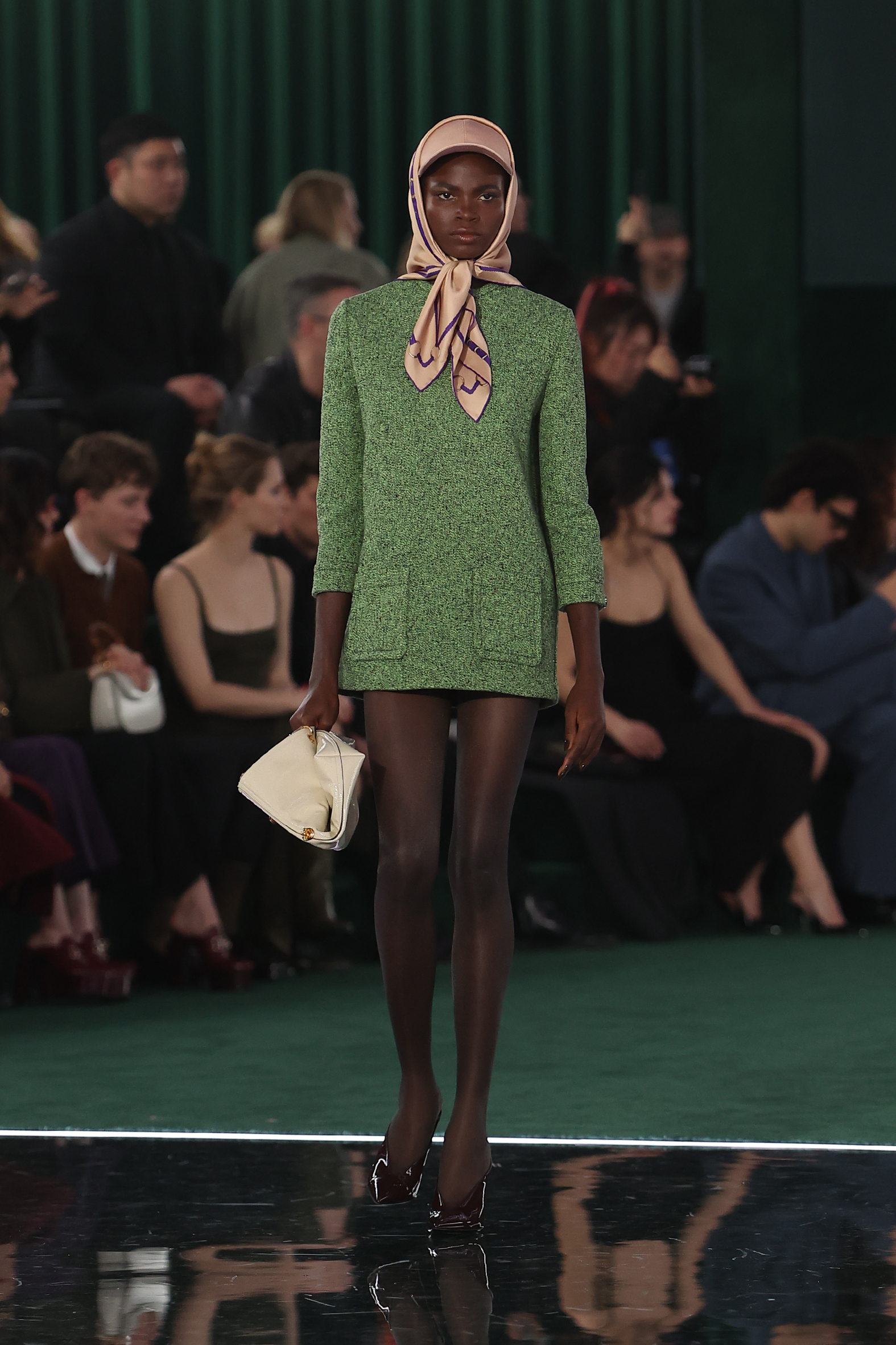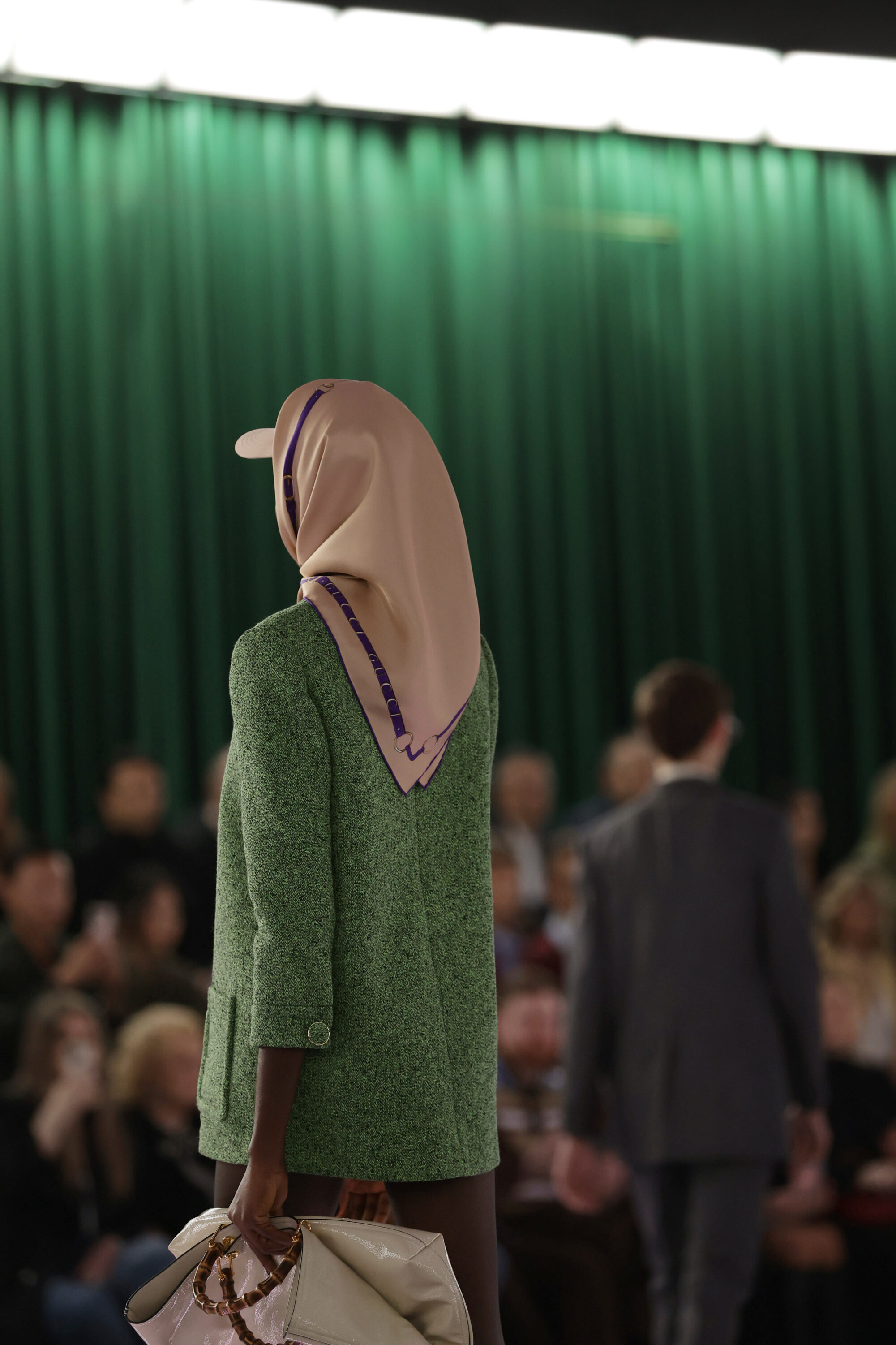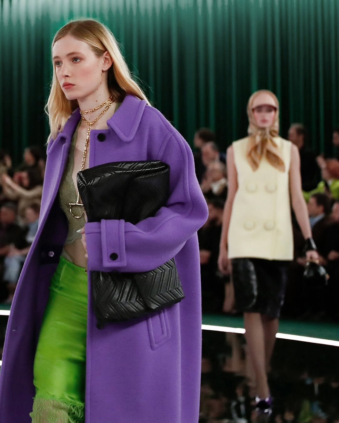 模特兒們穿梭於綠色 Interlocking G 字母印花的伸展台,這一標誌性圖騰是向品牌創始人 Guccio Gucci 的一次深情致敬,也象徵著品牌的悠久傳承。