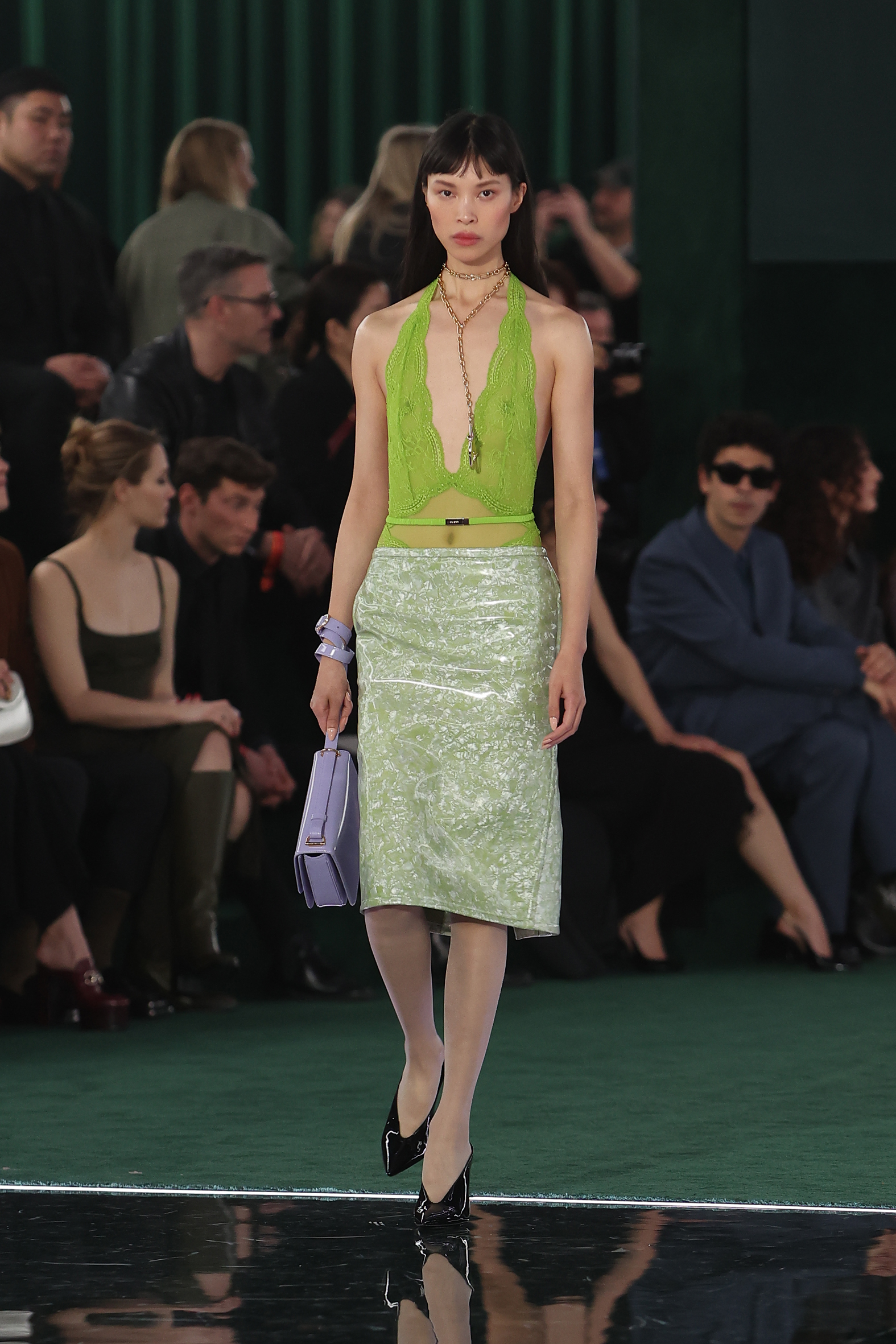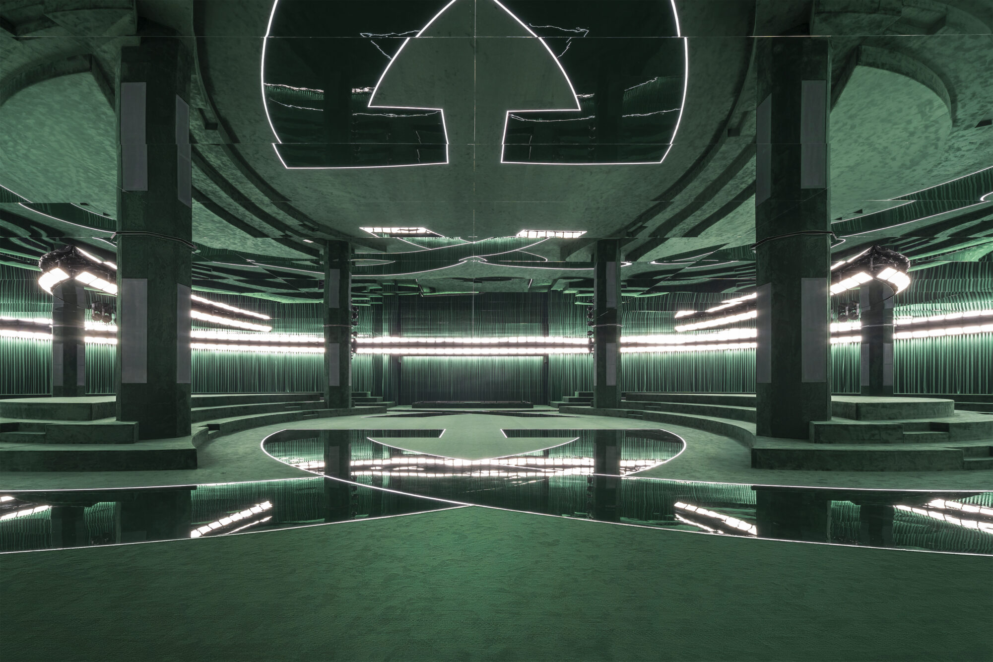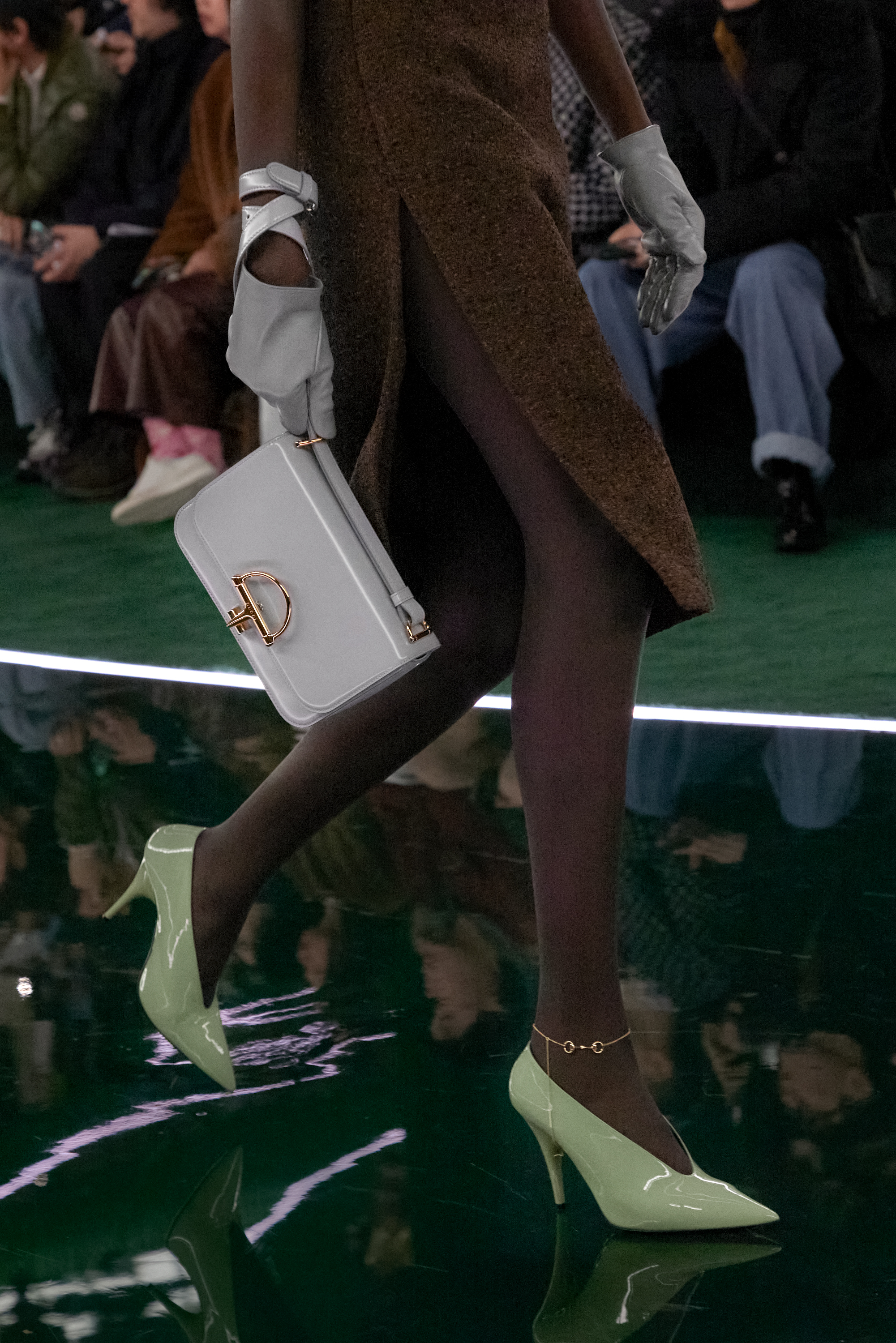 模特兒們穿梭於綠色 Interlocking G 字母印花的伸展台,這一標誌性圖騰是向品牌創始人 Guccio Gucci 的一次深情致敬,也象徵著品牌的悠久傳承。