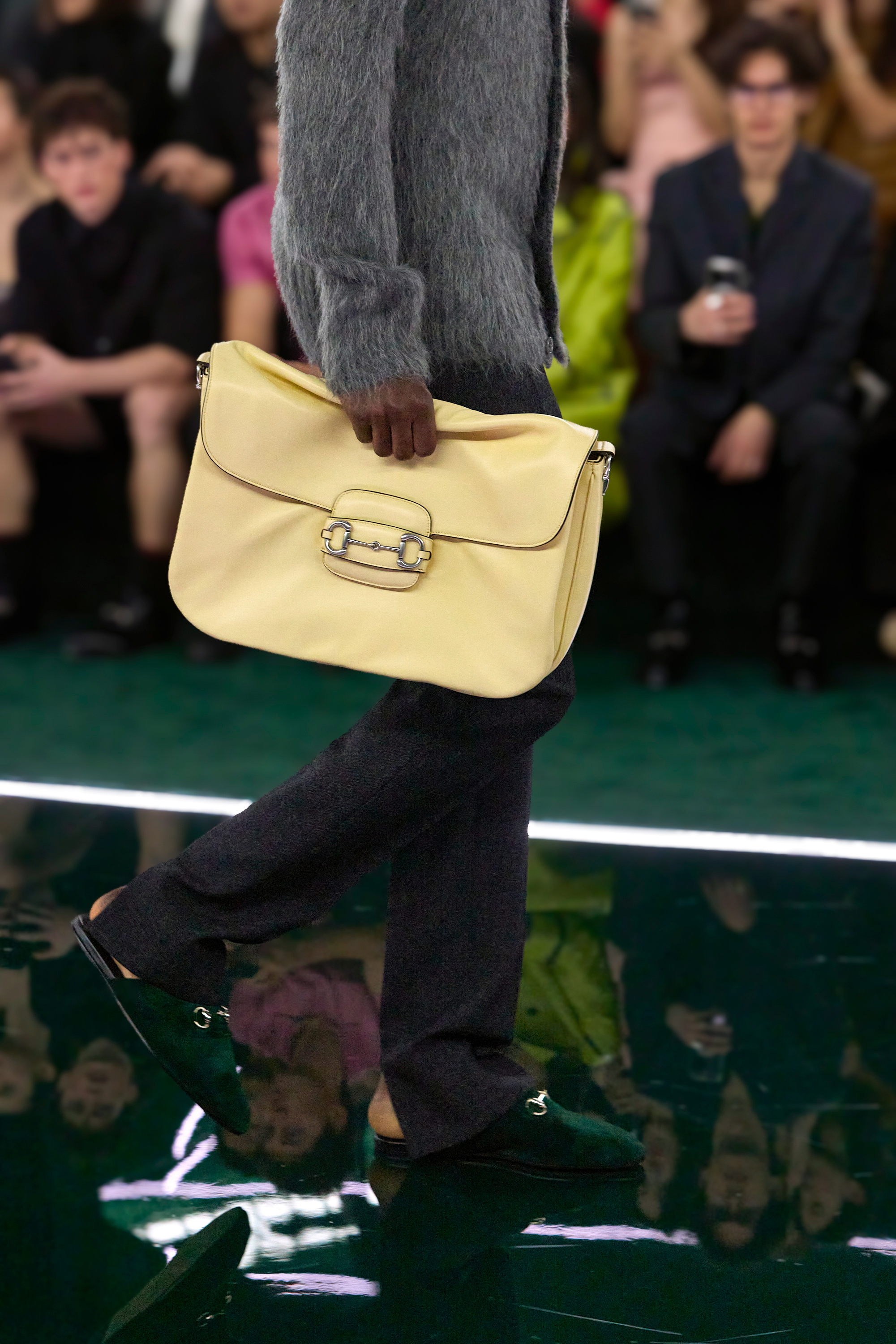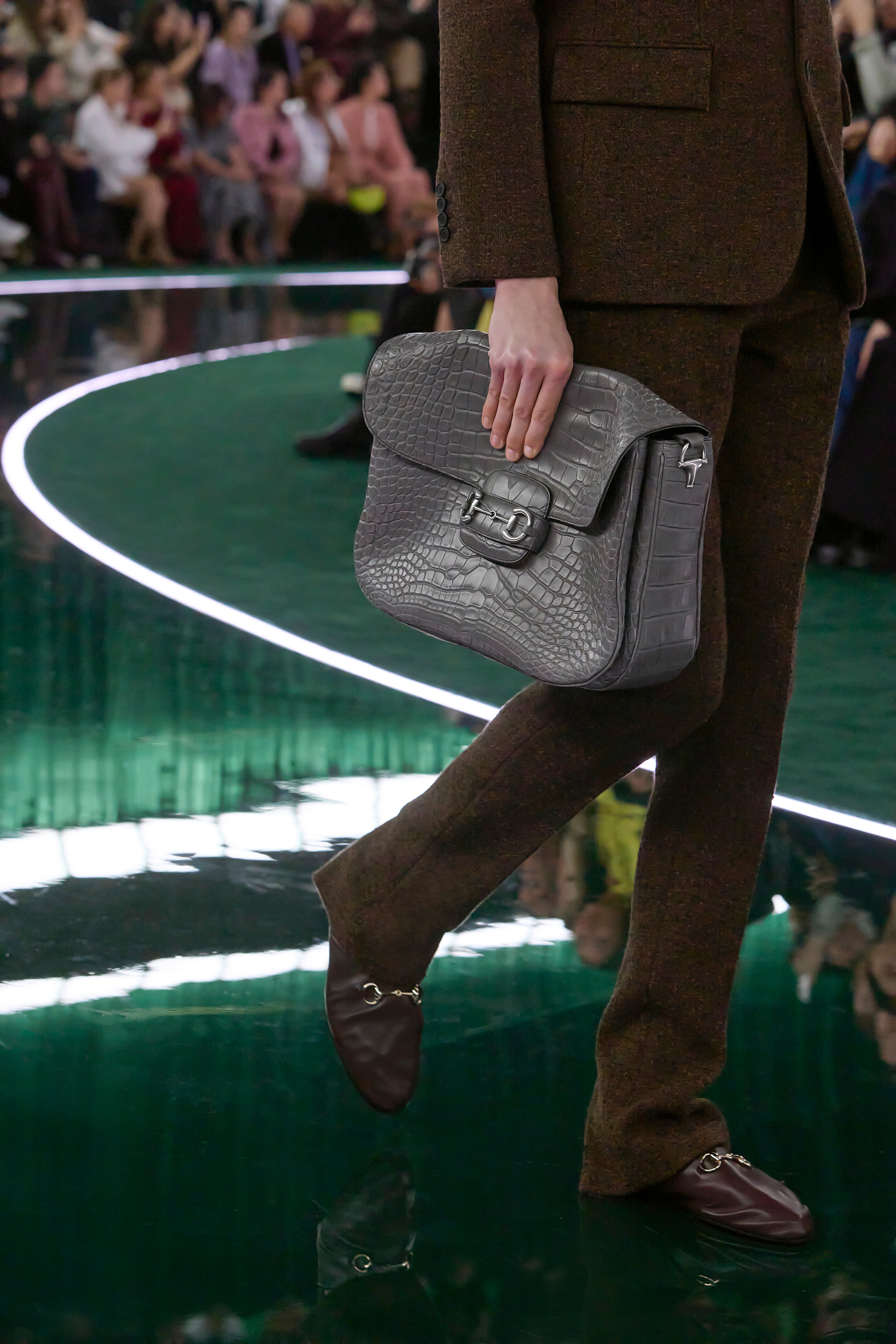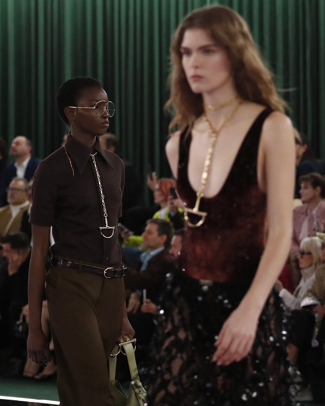 而最受矚目的,莫過於 Horsebit 馬銜鍊的運用,作為 Gucci 最具代表性的標誌之一,今年迎來了 Horsebit 1955 包款的 70 週年里程碑,因而無論是超大或迷你尺寸,今次馬銜鍊透過了各種方式融入設計之中,甚至以腰鏈的形式點綴深 V 剪裁的晚禮服,或作為皮件上的經典裝飾元素。