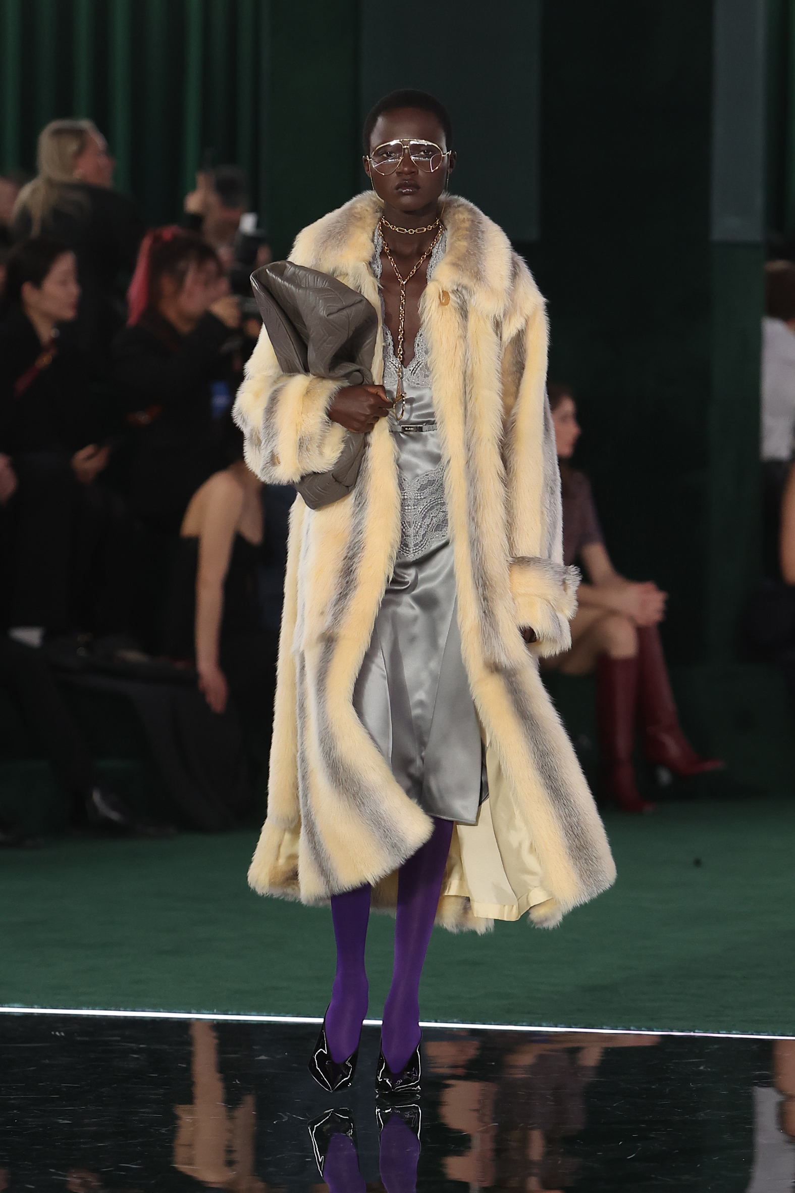 米蘭時裝周的第一天,Gucci 2025 秋冬大秀以過往在《House of Gucci》中飾演 Patrizia Reggiani 的 Lady Gaga 曾穿上身的一套造型作為開場,厚實的人造皮草、低胸淡紫色蕾絲緊身衣、羊毛鉛筆裙,以及飛行員眼鏡,這是自上任創意總監 Sabato de Sarno 離職後,Gucci 設計工作室發想的首個系列,所有人都集中目光看著,而今回 Gucci 也選擇透過回顧過往品牌典藏檔案,向創辦人 Guccio Gucci 致敬。