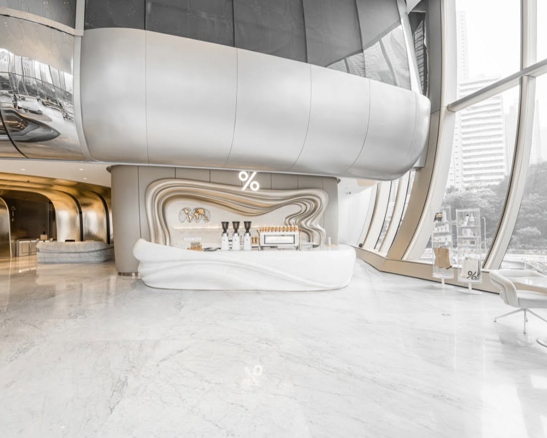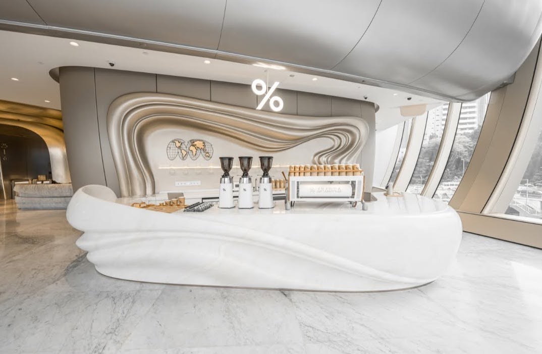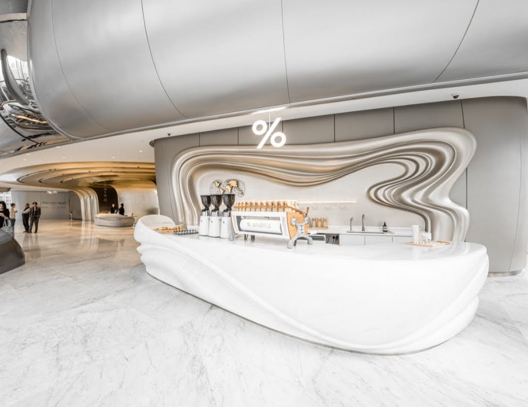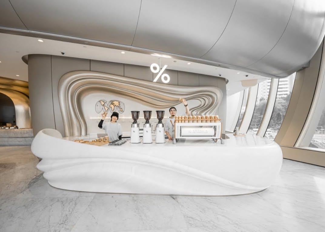 此次,% Arabica 攜手享譽全球的建築設計事務所 Zaha Hadid Architects,於這座當代建築傑作內打造全新空間,無縫融合咖啡文化與流線建築的美。