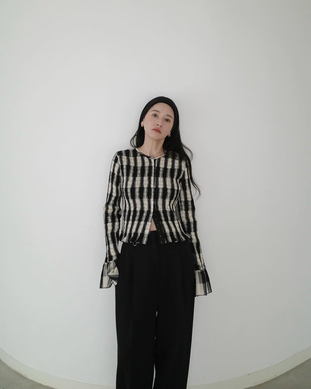 襯衫也是很好打造層次感的單品,除了穿在身上,還可以綁在腰際、披在肩上,給人一種隨性自在的氛圍。加上她的羽毛剪髮型,側邊線條柔和、自然,為極簡風格增添一點率性與空氣感,就算是長直髮,不染不燙看起來也格外清爽有型。