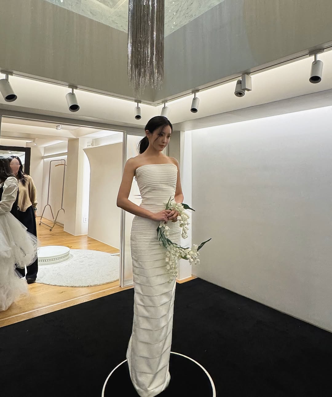婚紗照的婚服則是來自韓國婚紗品牌 Atelier KU,像這一套以收腰剪裁搭配蓬紗裙設計,上身馬甲的輪廓還綴有抓皺裝飾,簡約中又帶點浪漫仙氣,將孝敏高雅氣質的一面展現得淋漓盡致,實在好好看。