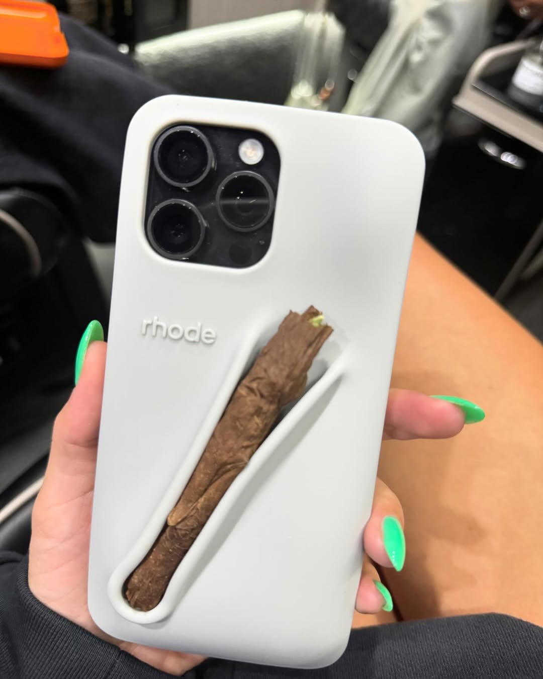 夫妻倆似乎都對手機殼很感興趣,最近,Justin Bieber 的個人品牌 skylrk 在社群上分享最近動向,其中一張照片為綠色手機殼,其背後立體的空間正好可以攜帶一支菸。