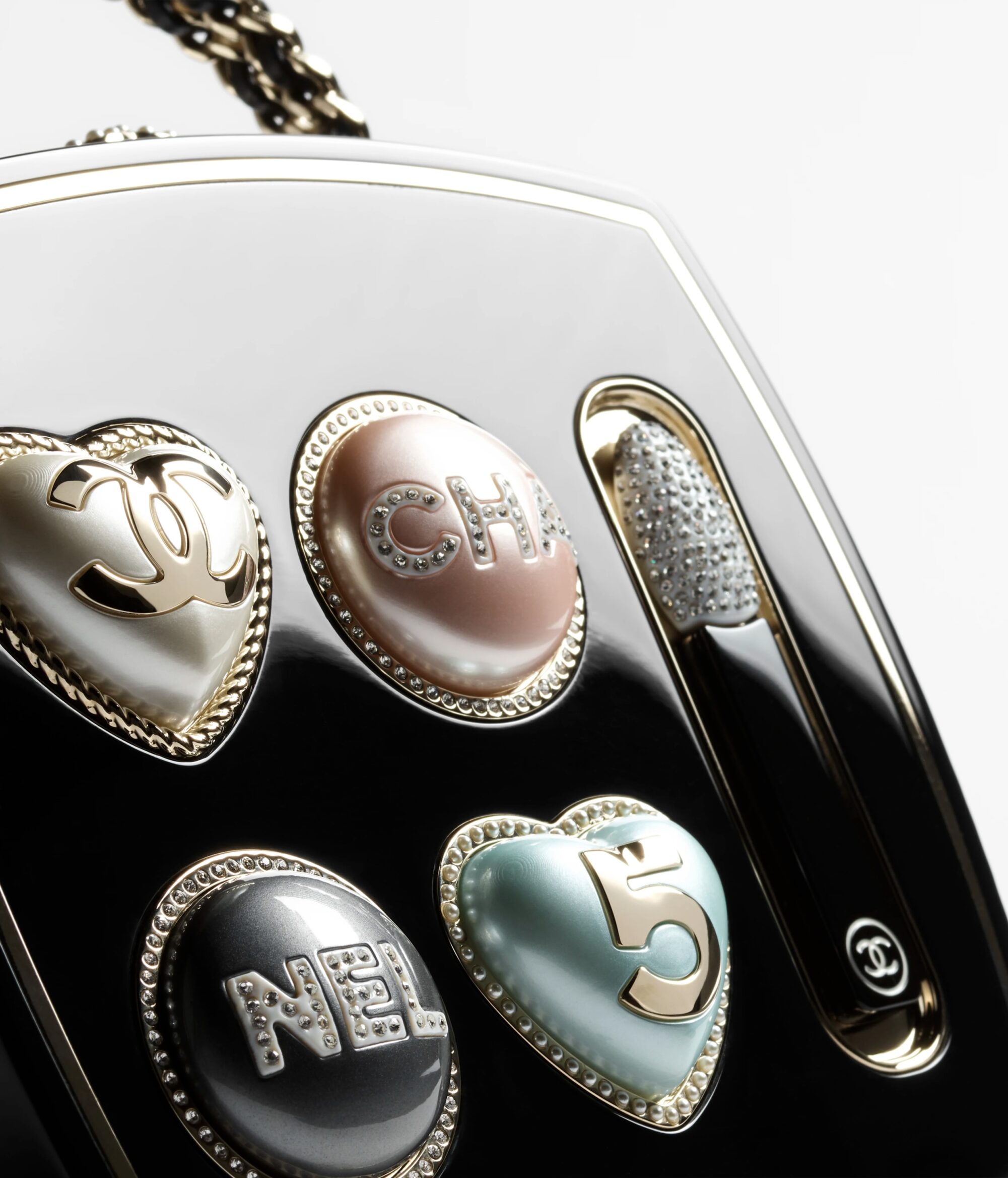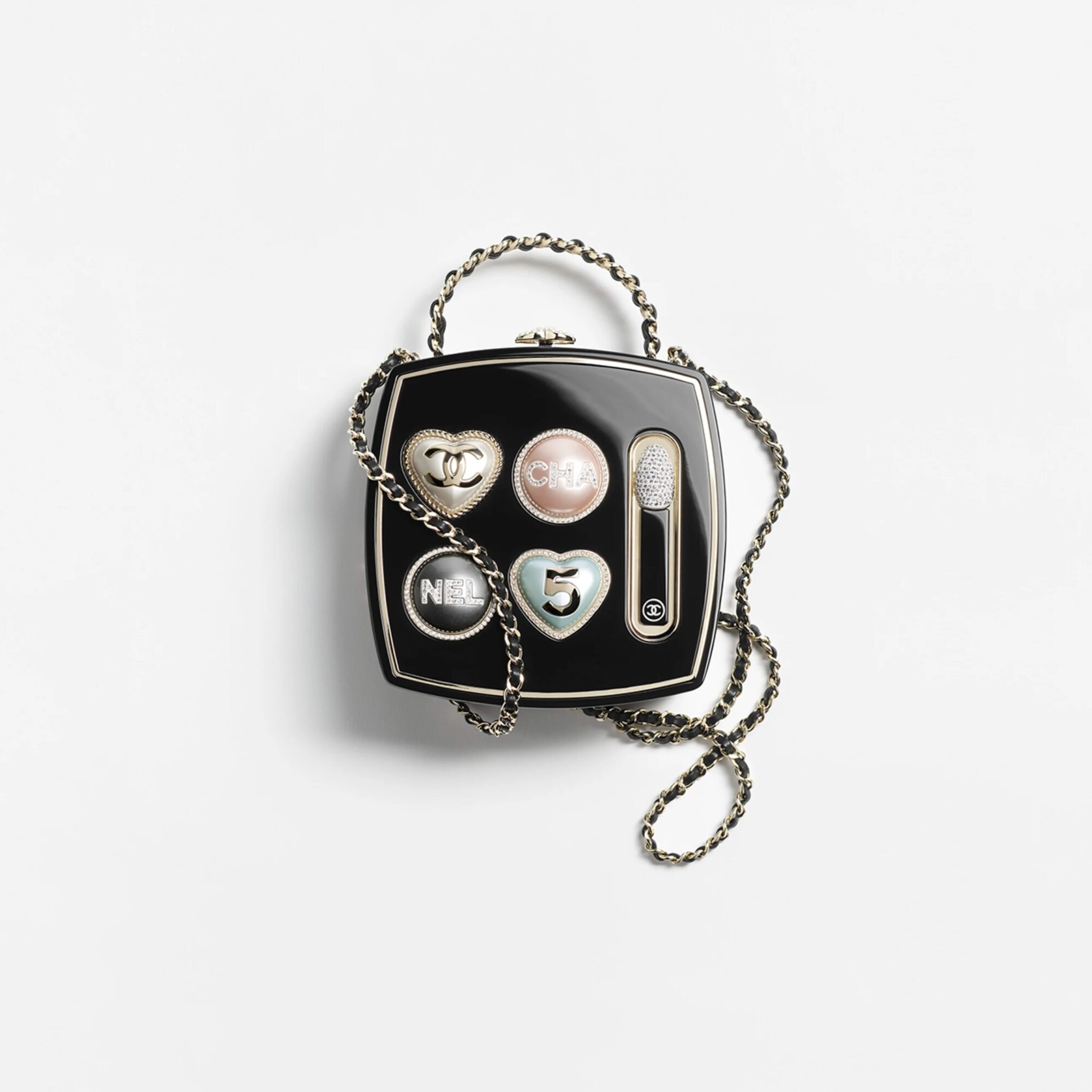 CHANEL 這款彩妝調色盤盒型晚宴包以品牌經典四色眼影盤為靈感,結合高級工藝,巧妙還原眼影盒設計,不僅有四色眼影的細膩分區(而且除了圓形,還有愛心形狀,有夠俏皮),更附有隨行眼影棒,趣味十足,看來很快就會成為本季最具話題性的配件之一。