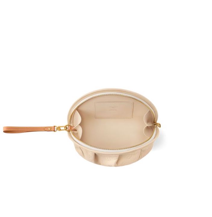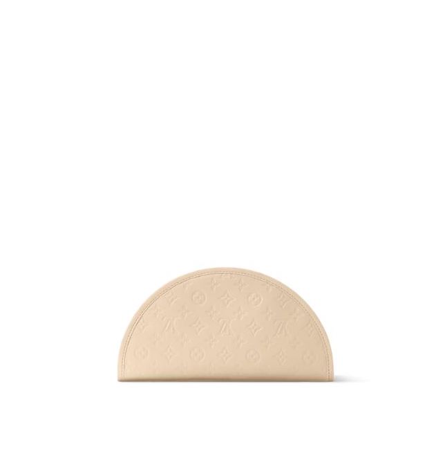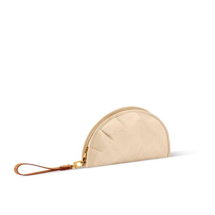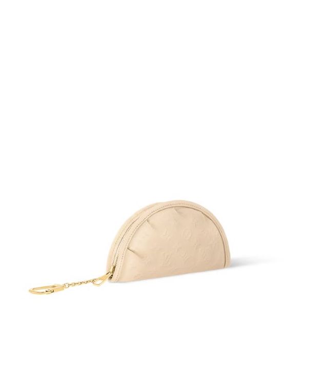 除了龍蝦,本系列另一個亮點則是煎餃造型的手拿包與鑰匙包,靈感來自日式煎餃的弧形摺痕,米白牛皮在低調中透出質感,而浮雕 Monogram 則替其增添了一絲辨識度。