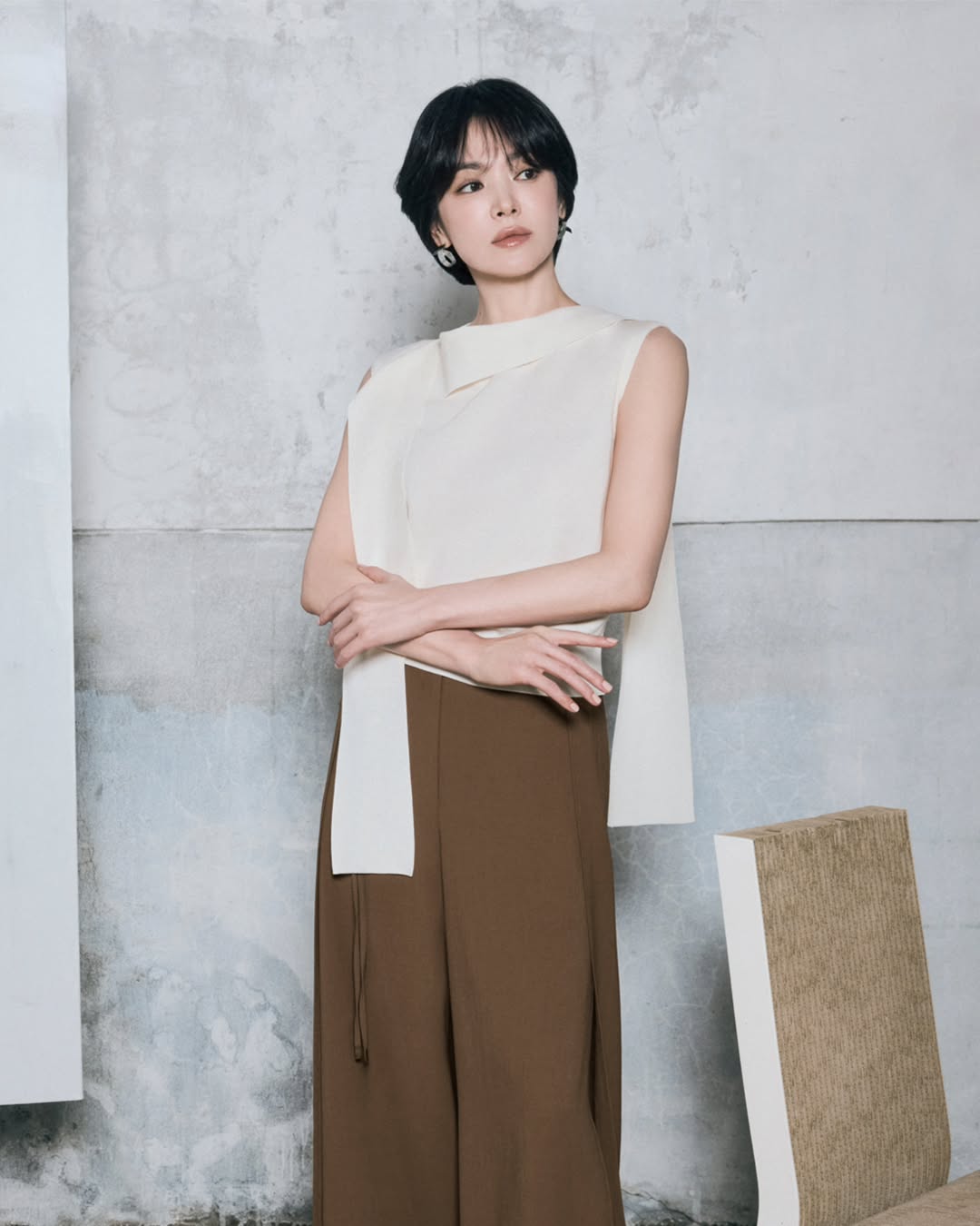近日,韓國服飾品牌 MICHAA 釋出最新早秋廣告,找來代言人宋慧喬拍攝,她頂著一頭短髮造型,髮絲帶點泰迪熊捲度,髮尾還有外翹,層次分明、線條俐落,抹上輕煙燻眼妝,搭配皮衣與西裝穿搭,展現出與以往截然不同的帥氣氛圍。