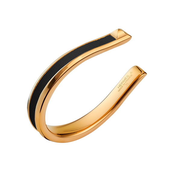 此系列耳環與手環的設計靈感來自馬蹄鐵,象徵著幸運與力量,而皮革與金屬的結合也延續了 Hermès 標誌性的材質語彙,手環採側開式結構,方便從腕側扣入,配戴與取下都極為順暢。