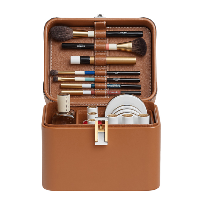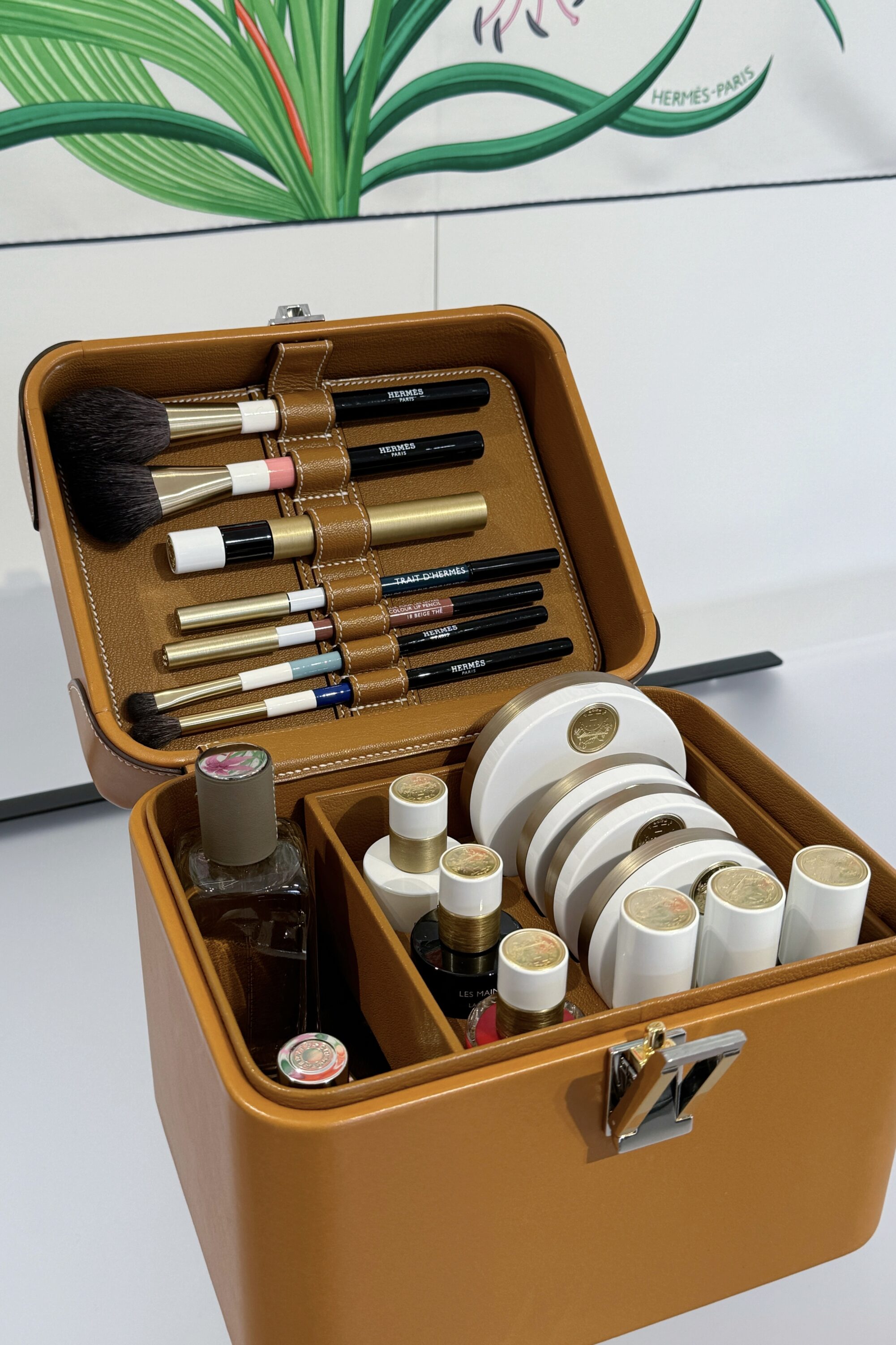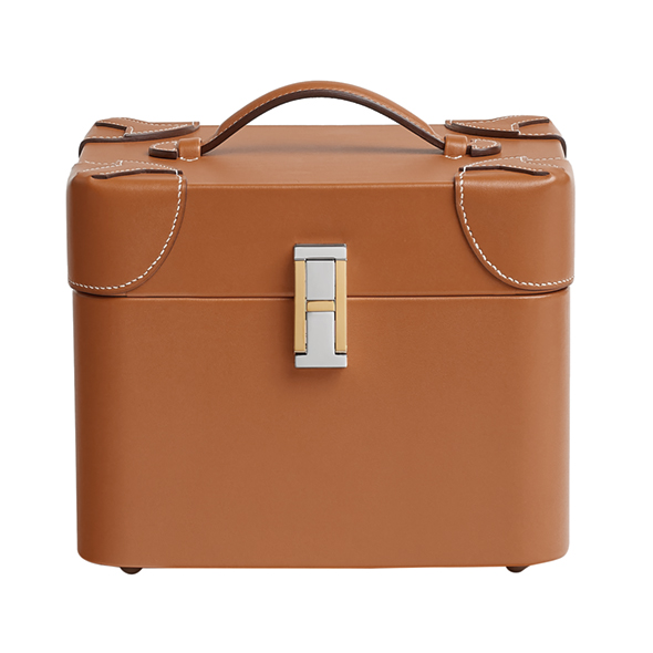 這款專為美妝收納打造的皮革收納箱,可說是 Hermès 工坊精湛皮革工藝的縮影。設計靈感來自於品牌典藏的硬殼行李箱,外觀以手工包覆與縫製工序完成,每一道線跡都精準無比;內部空間寬敞、配有分隔設計,能整齊收納香氛、美妝與保養品,並在蓋面配置有化妝鏡,滿足使用者隨時想整理儀容的需求。