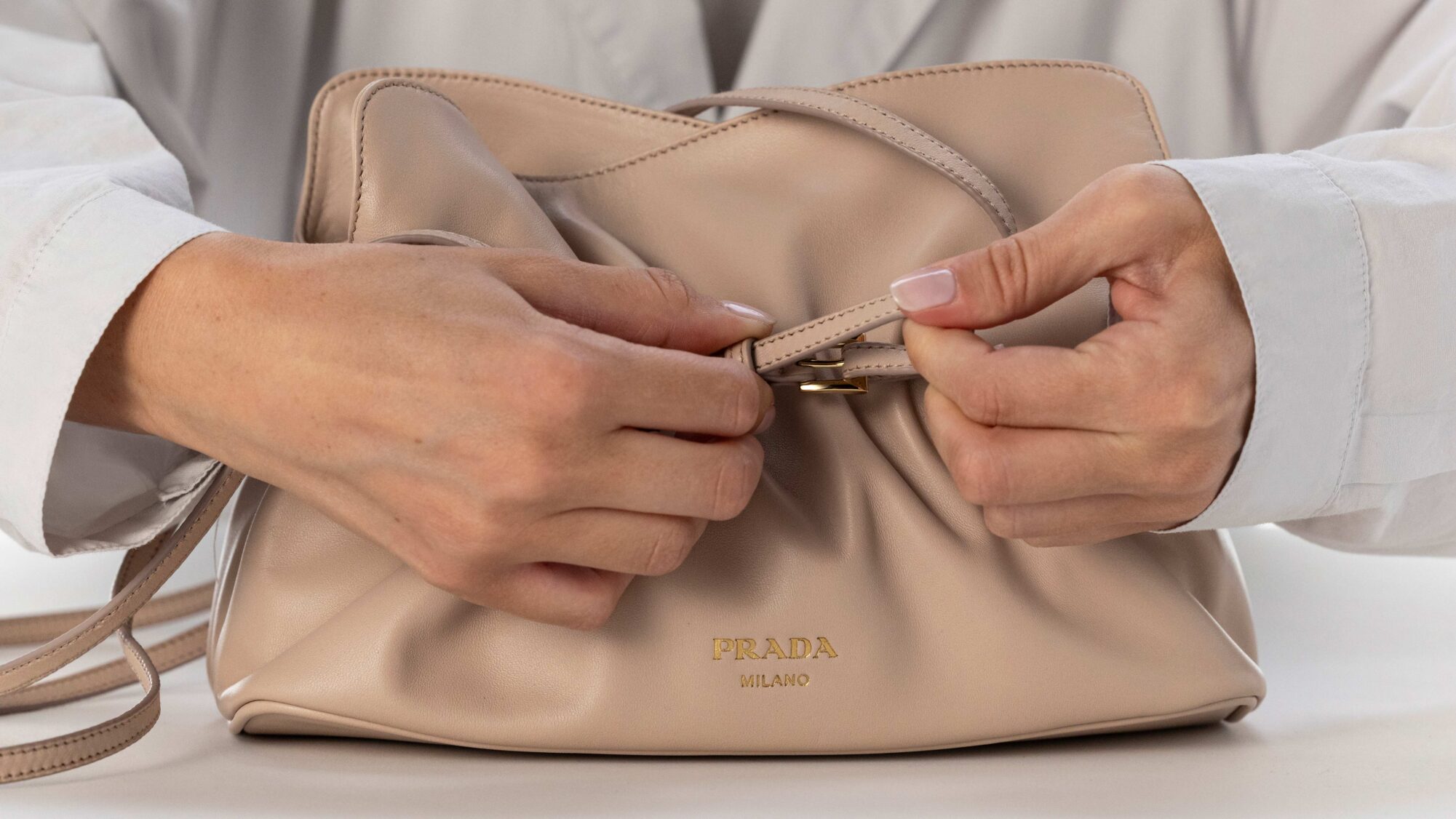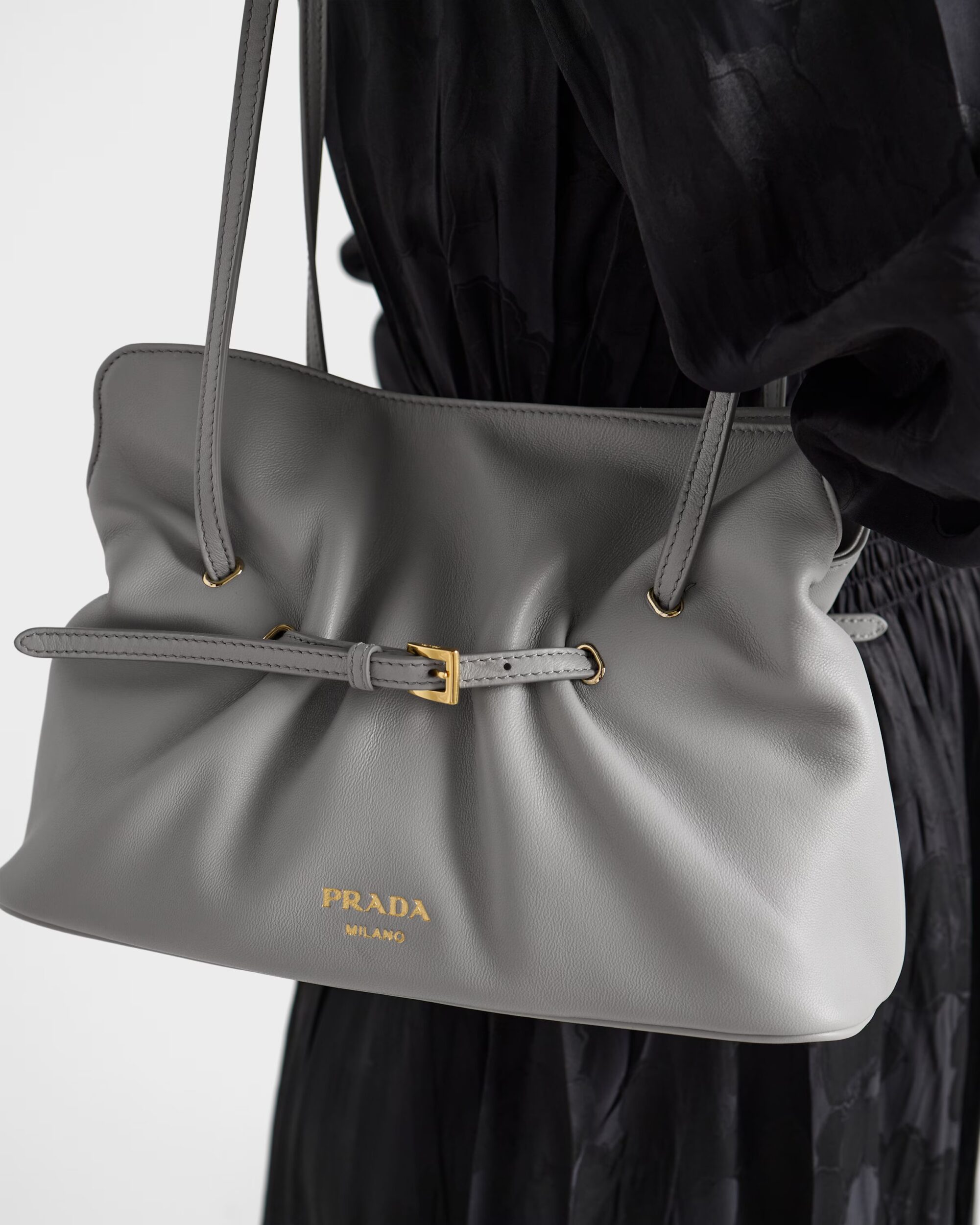 在 2025 秋冬系列亮相的全新 Prada Dada 包款,有著鬆軟可愛的外型,因而被網友暱稱為「雲朵包」。包身採用柔軟的納帕小羊皮打造,以細窄皮帶巧妙收束出抽皺設計,也勾勒出包身輪廓,並延伸成包款的背帶,平衡了造型與實用性;內層為細膩的納帕皮革襯裡,設有中央口袋與磁扣開合,兼具質感與機能。