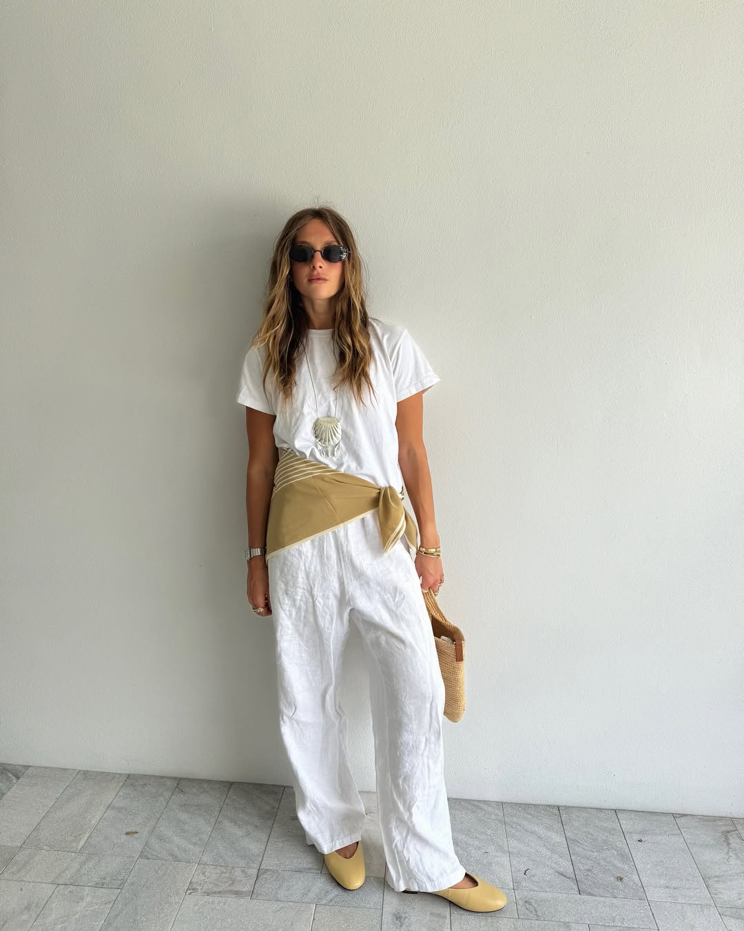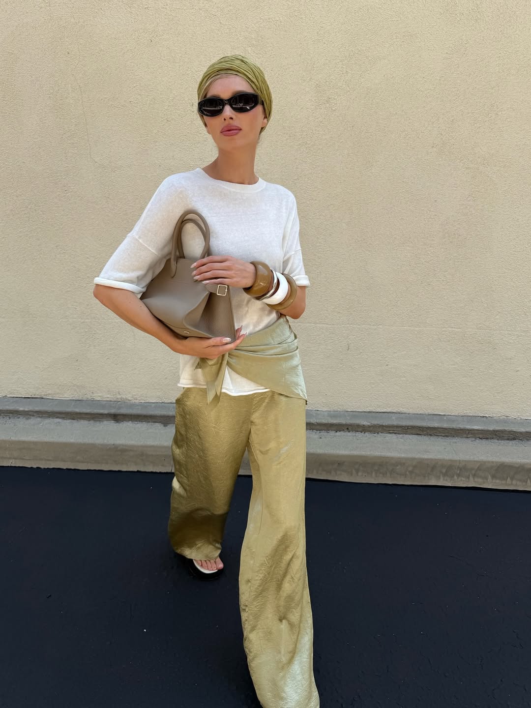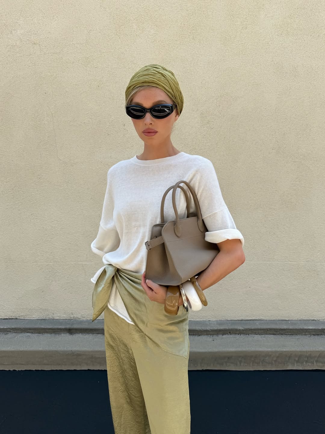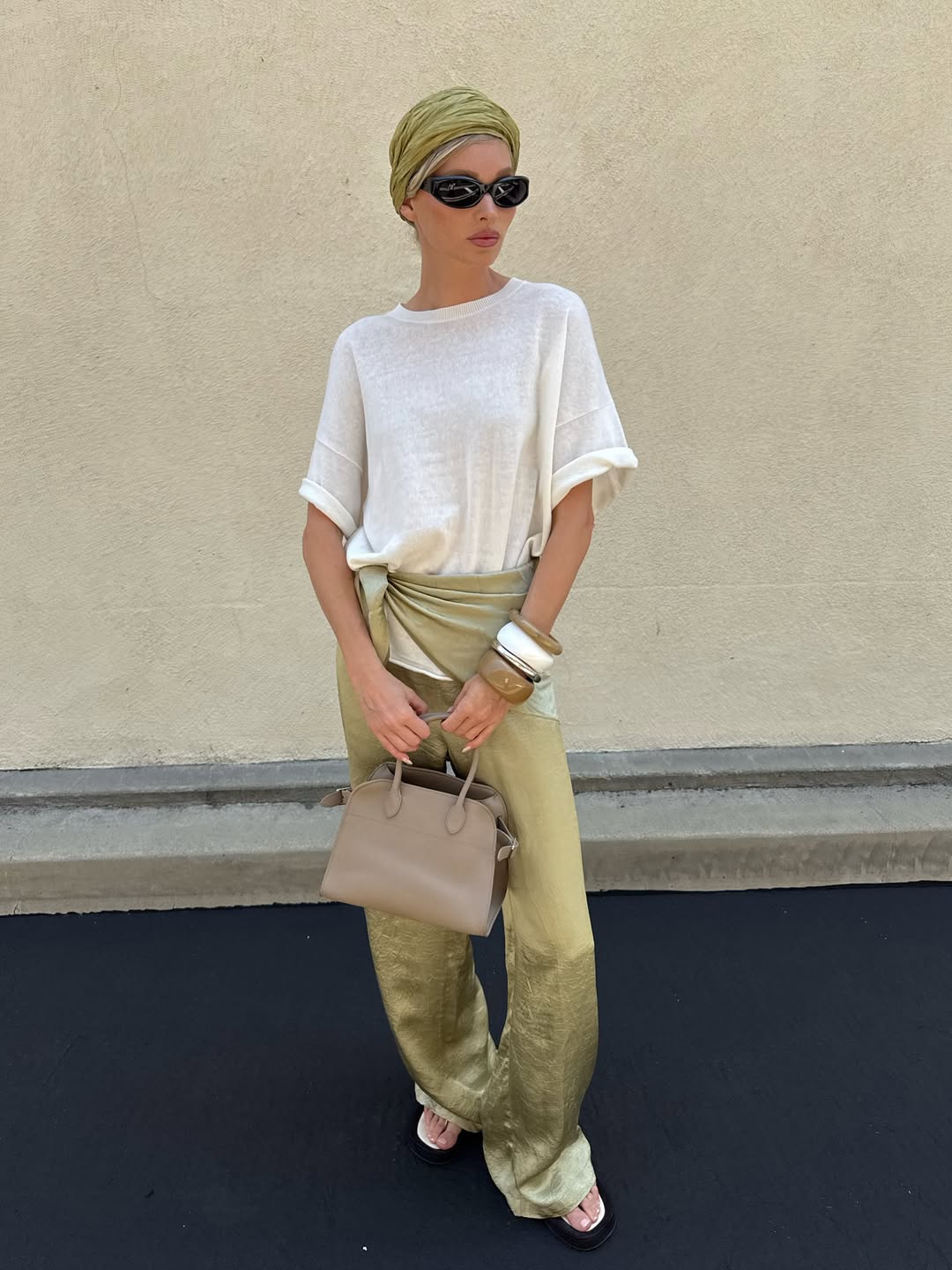 若想要更慵懶一點,也可以選擇更加柔軟輕盈的材質,比如亞麻、不拘泥於整齊的對折,將絲巾抓成一束,拿了就綁更顯輕鬆隨性。