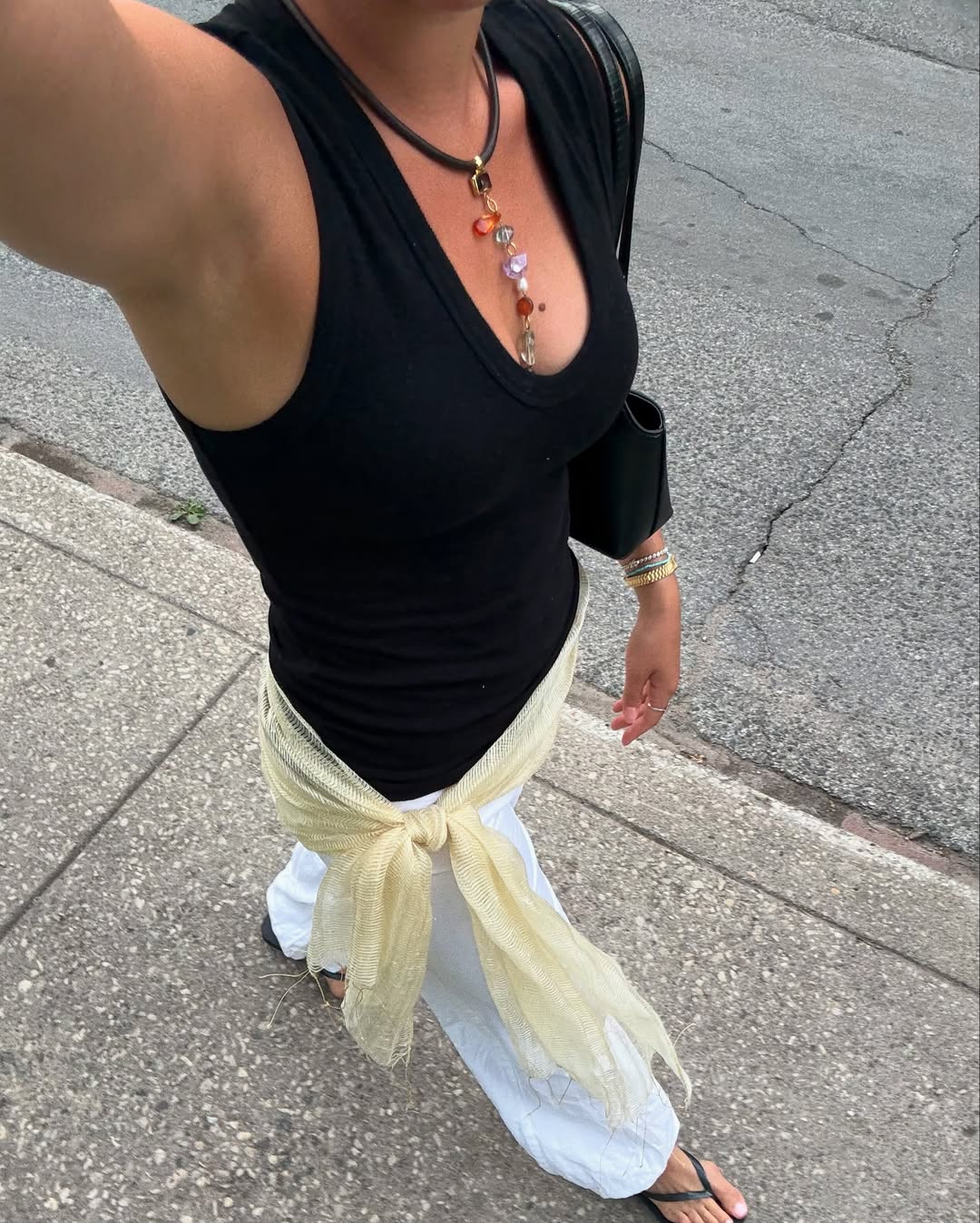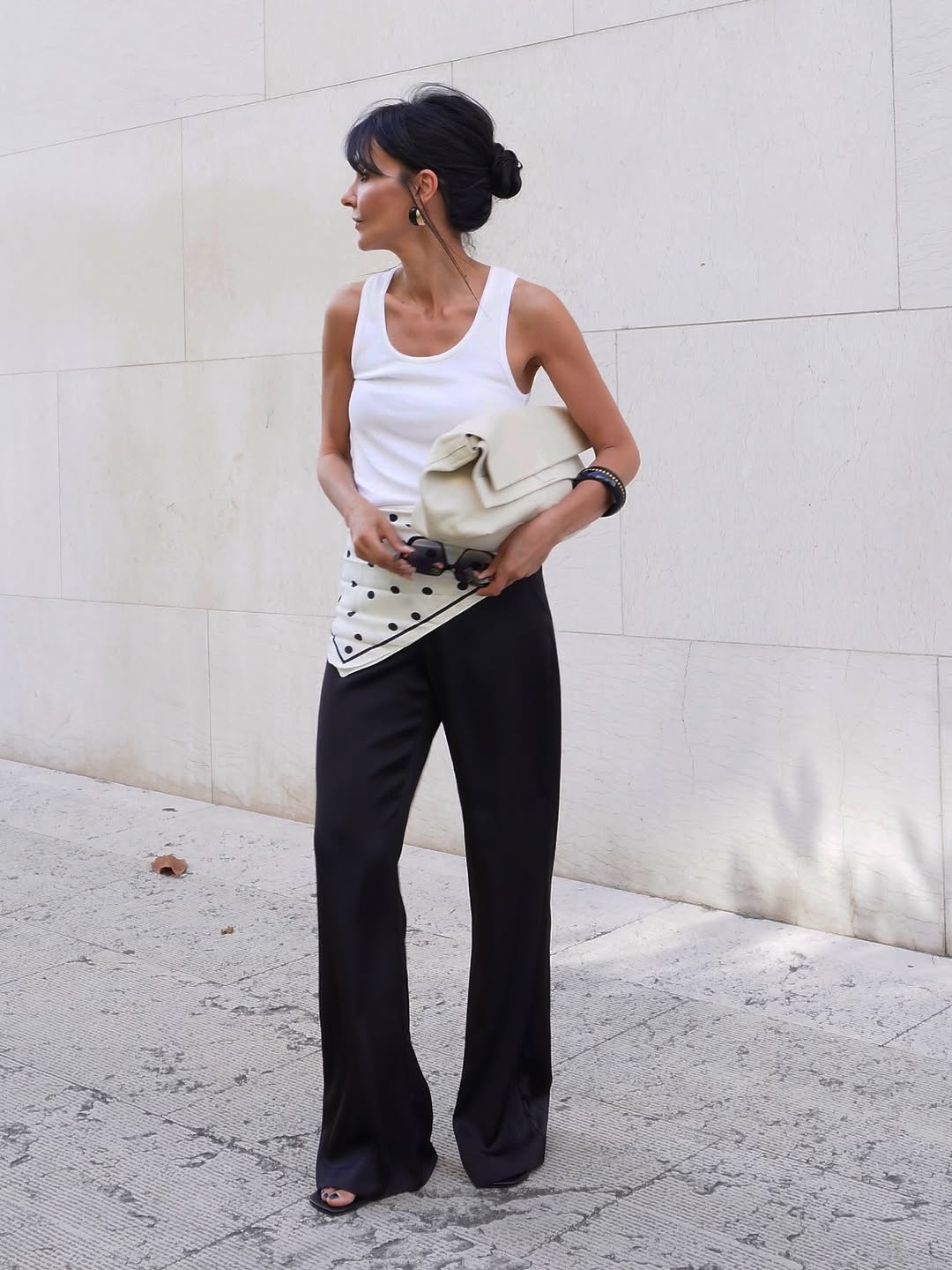 若上衣長度會蓋過褲頭,又想穿出俐落感,現在除了把多餘的下擺紮進去褲子外,還可以綁條絲巾。選一條顏色相近或對比色強烈的絲巾繫在腰際,身材曲線立刻就出來了,還能增加視覺亮點,讓造型更有態度。