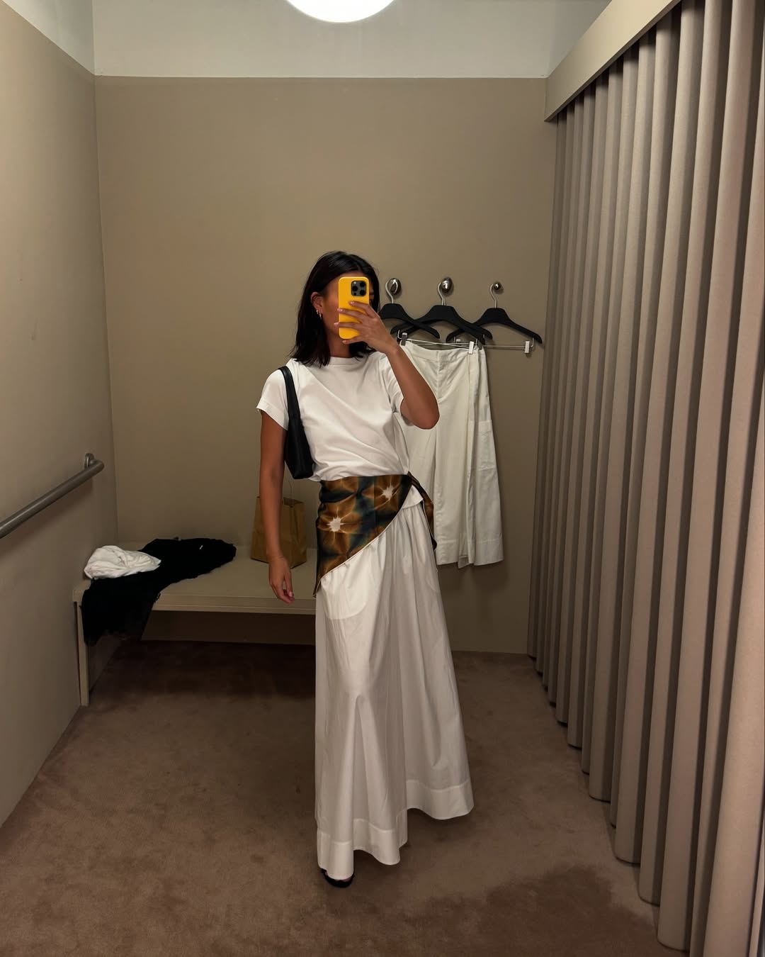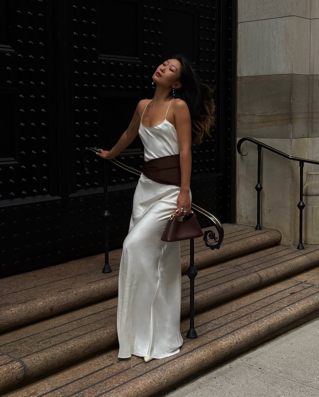 長裙飄逸、仙氣,把絲巾繫在腰繫,既能當裝飾,也能做層次過渡,讓整體更有亮點,視覺效果既復古又摩登。