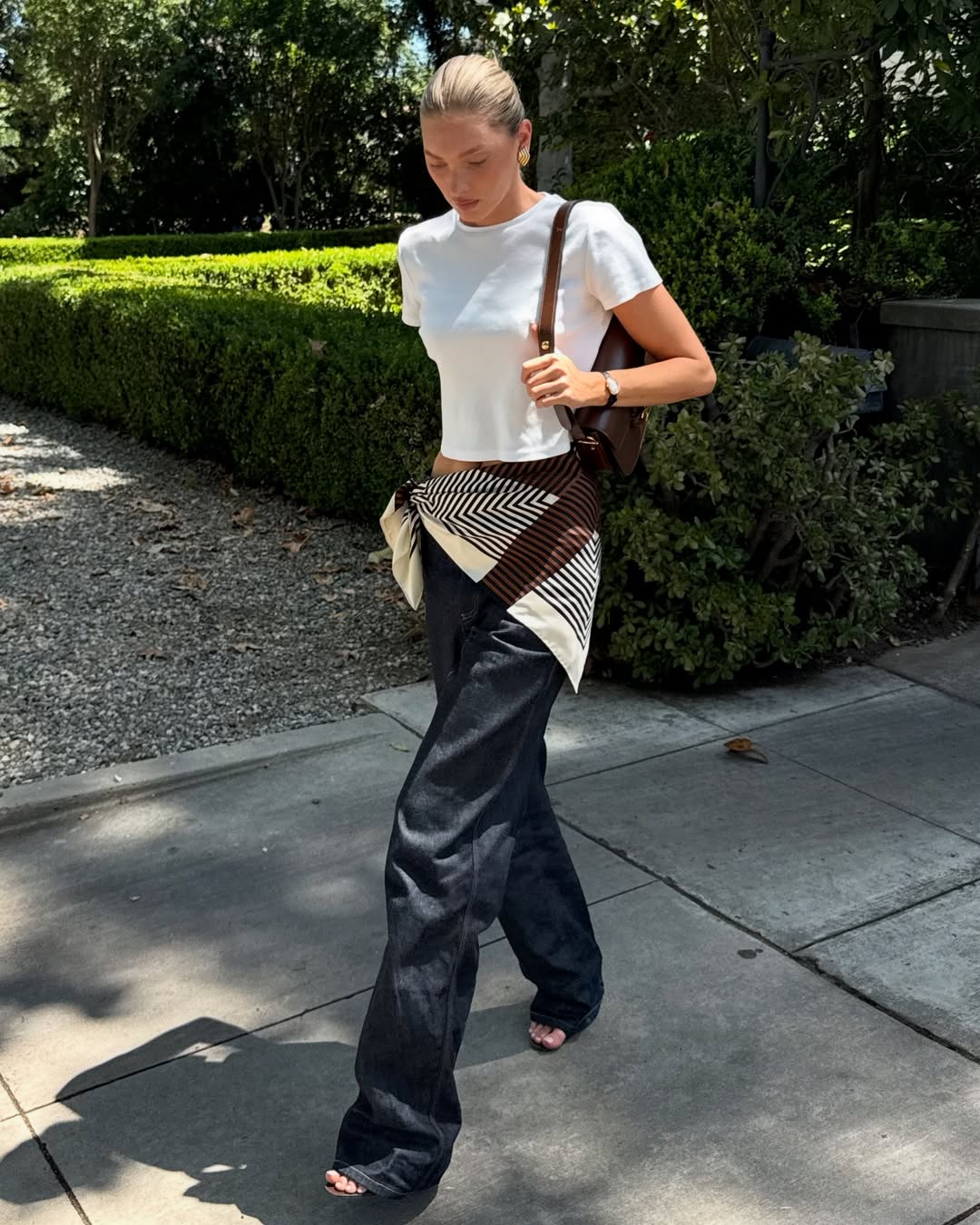 平常喜歡穿短上衣+牛仔褲,又想來點新意嗎?這時候就該派一條絲巾上場了。先將絲巾對折成三角,隨性繫在褲頭側邊,既能修飾腿長比例,又能為休閒著裝增添時髦感,讓基本款簡單卻不無聊。
